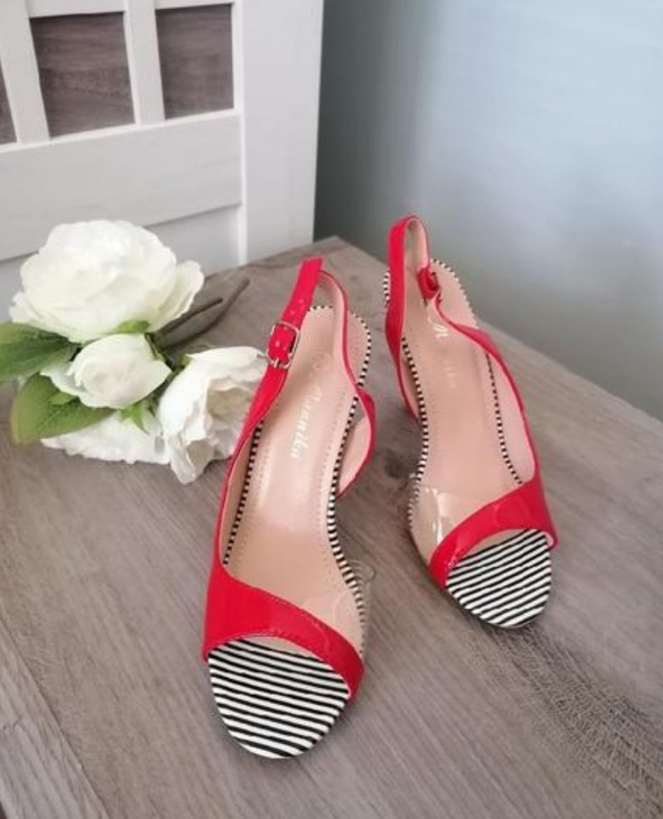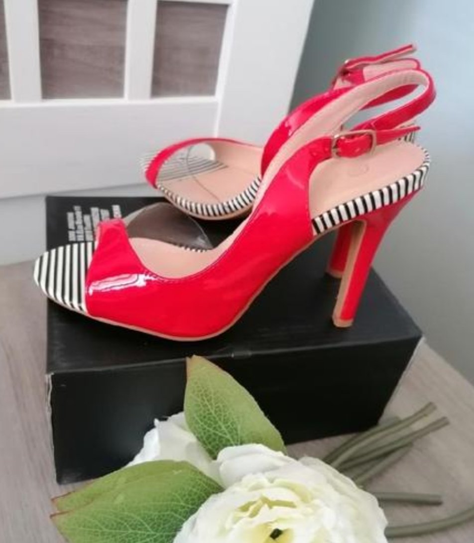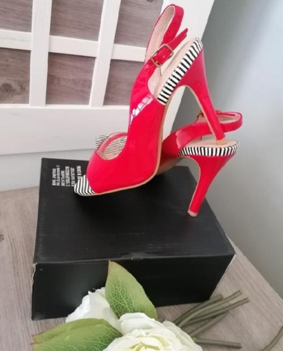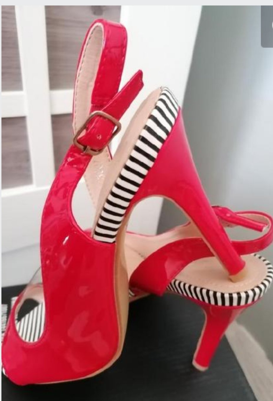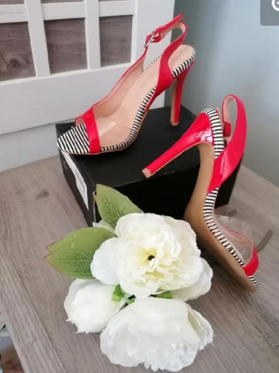 Krásné červené lesklé sandálky na vysokém podpatku. Sandálky jsem měla jen jednou na sobě v místnosti na focení...Perfektní stav ! Horní pásek je v kombinaci s průhledným plastem - viz.foto. Jsou nádherné :-) Délka stélky je 23 cm a výška podpatku - měřeno ze zadu 10 cm a z boku 9 cm....Poštovné - zásilkovna za 90 Kč nebo balíkovna za 85 Kč.