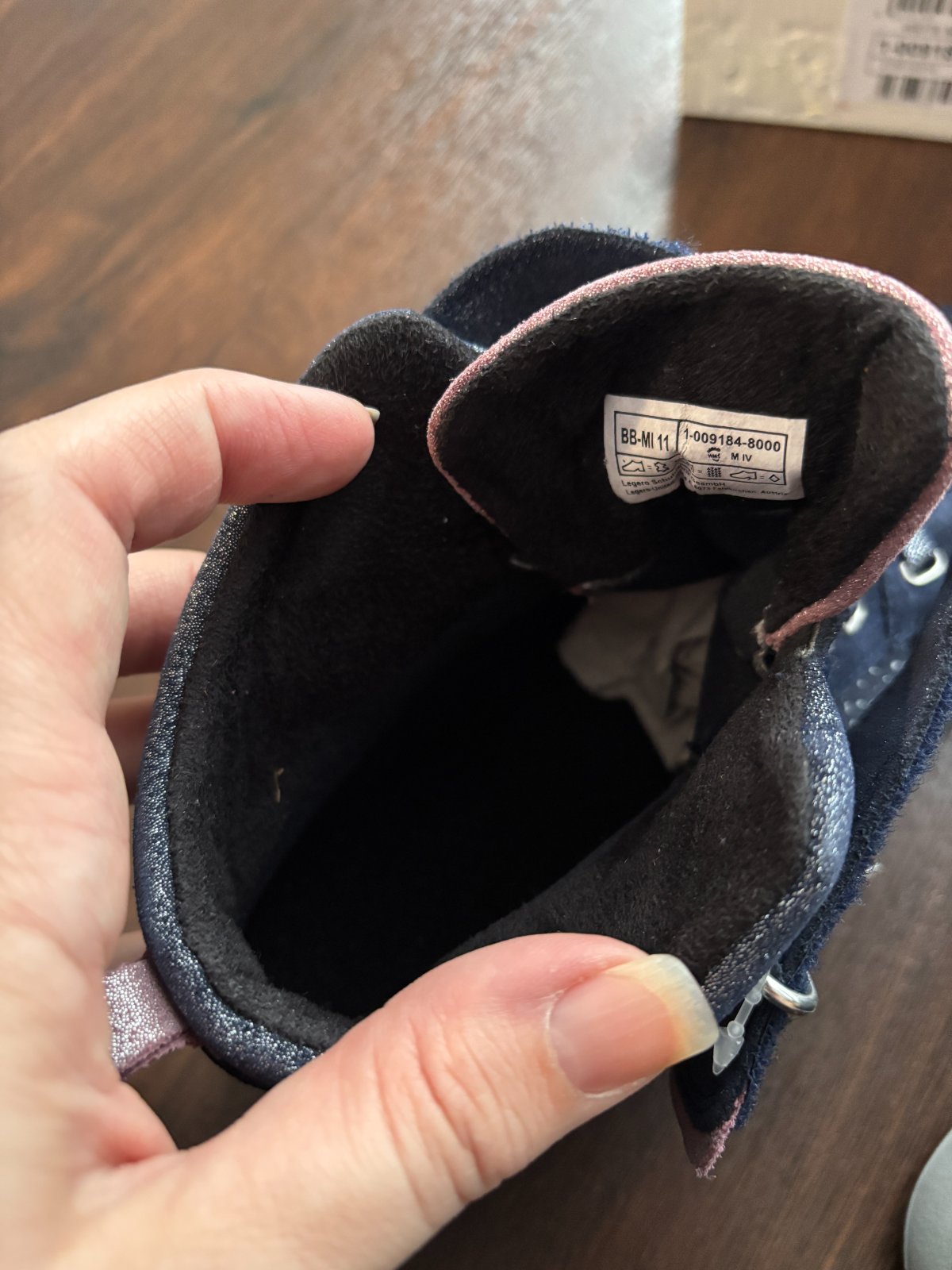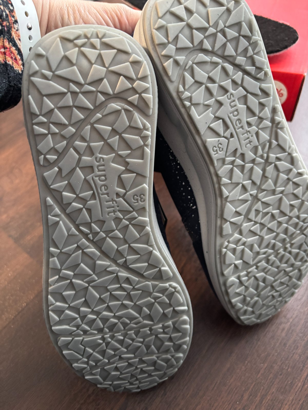 Kotníkové superfit 35, zateplené superfit 35, Superfit Goratex 35. Boty jsou nové, dcera mi přeskočila velikost a již jsem je měla koupeny. Uvnitř teplý flís, nepromokavé, dobře se oblékají. Je to náš oblíbený model, kupuji stále dokola. Stélka cca 23cm. Tmavě modré třpytivé tenisky.
