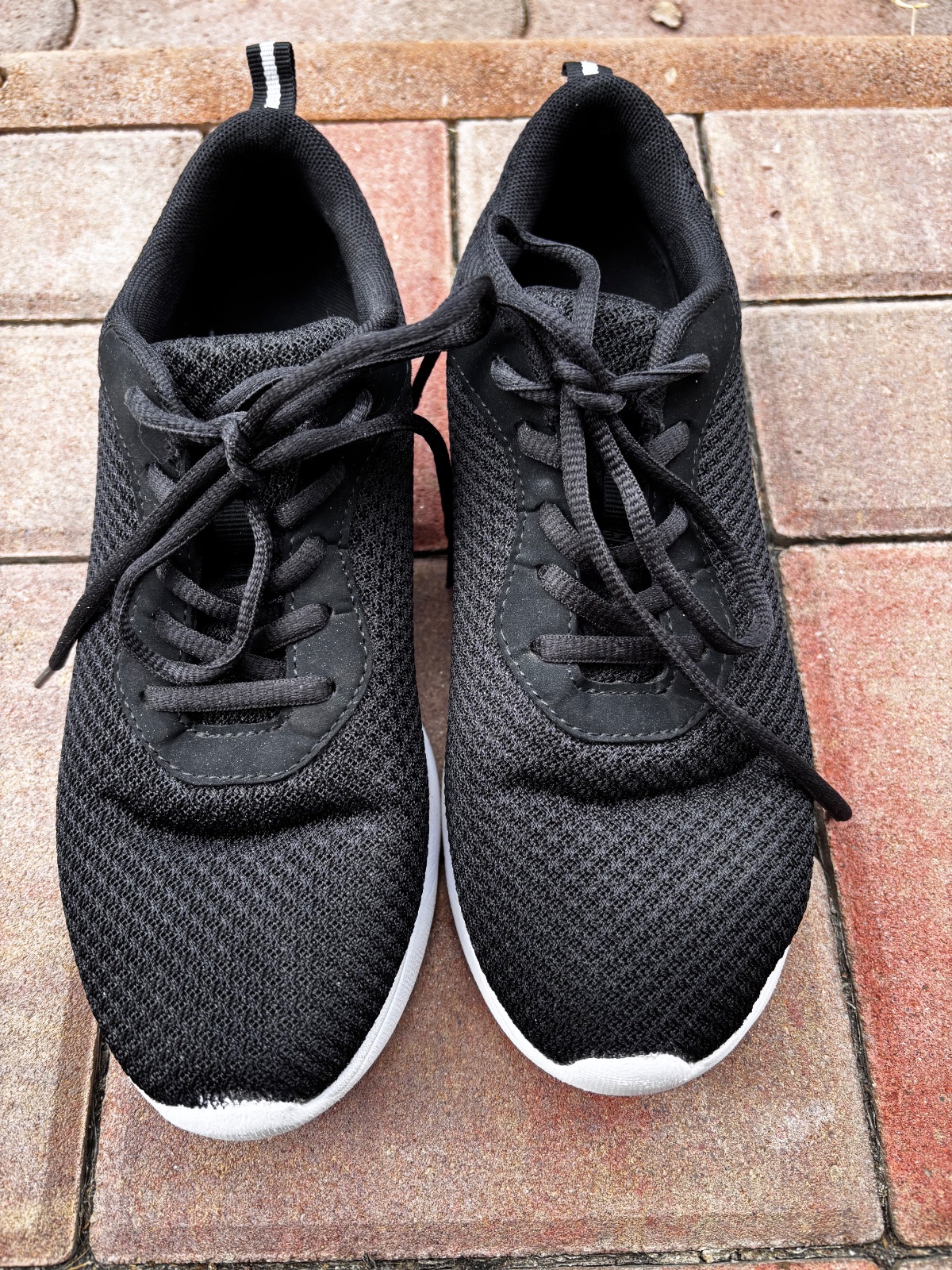 Pruhované, černo-bílé tenisky s růžovými tkaničkami. Stélka 26cm, vhodné na užší nohu, vel. 39. Na pravé botě je hnědý flíček, hodně světlý, vidět jen při důkladném zkoumání na denním světle, ne ...