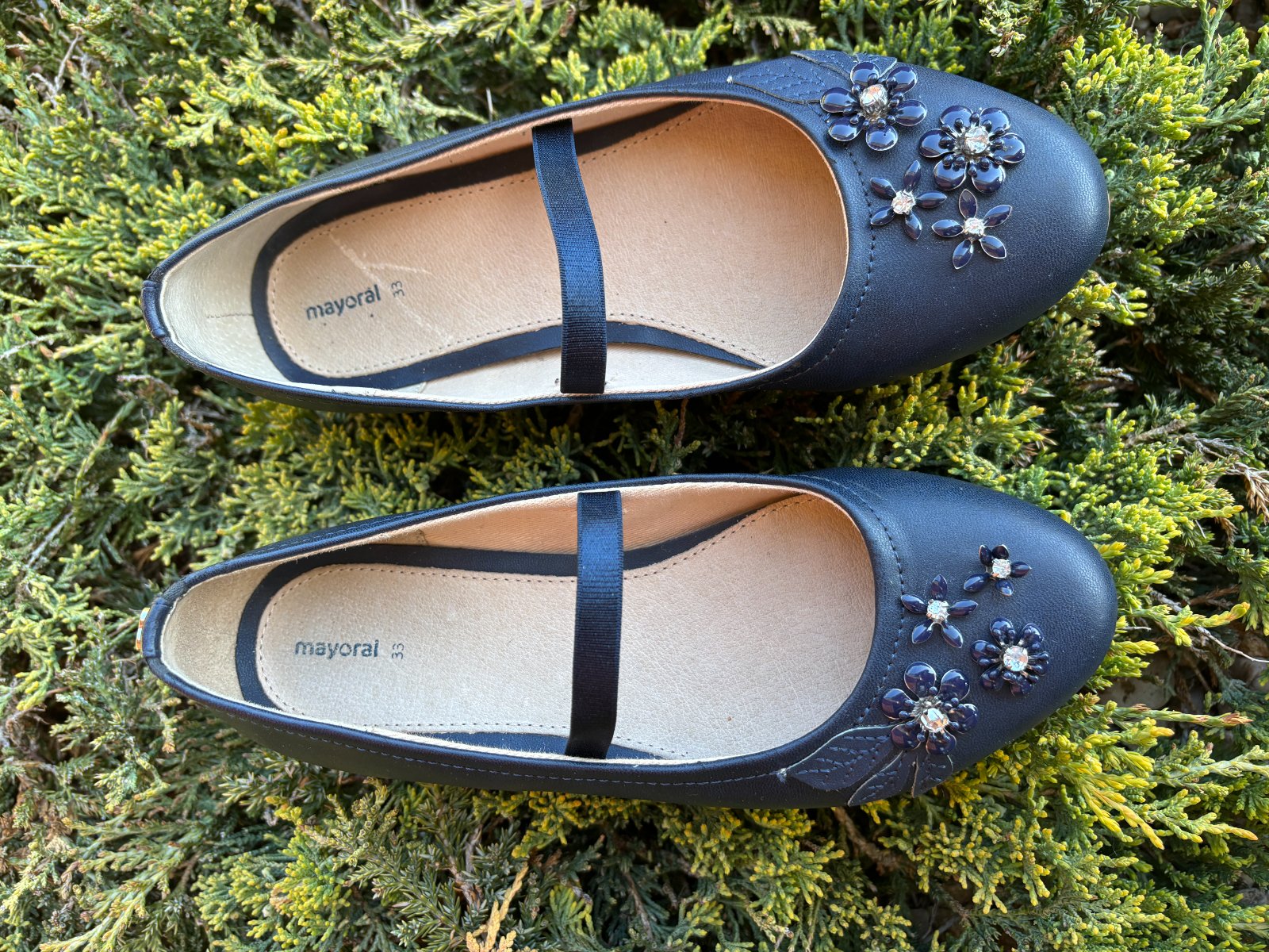 Krásné tmavě modré baleríny 33, Mayoral s kamínkama. Nošené pouze párkrát k sukýnce. Boty jsou neokopané, nesešlapané - opravdu krásný stav. Vysoká pořizovací cena 990Kč. Stélka cca 21cm - stélka nejde vyndat - takže měřeno orientačně.