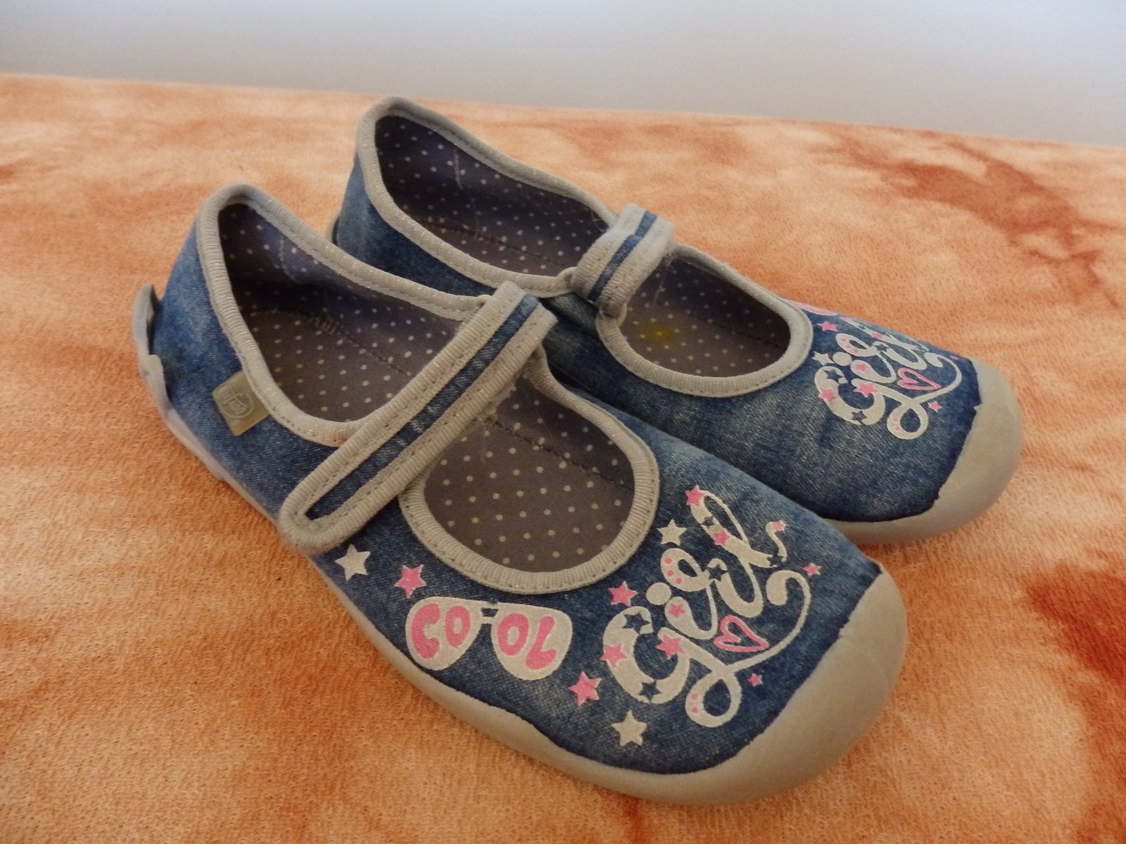 Tmavě modré bačkory Befado, modrá už je trochu vyšisovaná, gumové kytičky na patách a gumové špičky možná bude lepší zase přilepit, ale nosili jsme takhle. Kupovali jsme nové, ale jsou hodně nošené.