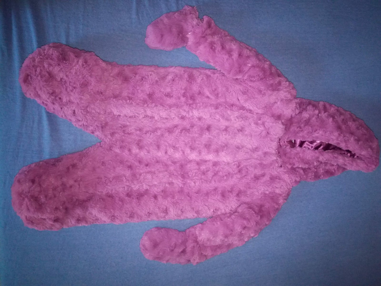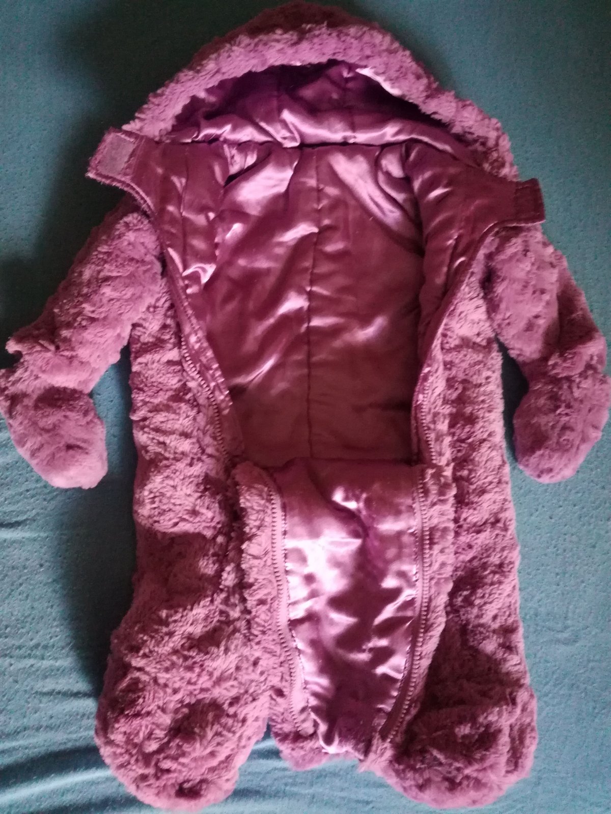Tmave fialovy chlupaty overal. Ma odnimatelne rukavice na knoflik, podsivku a u krku extra zapinani na suchy zip. Predani lze domluvit i Praha-Kolovraty, Pardubice centrum, Praha-Radlicka. Pokud by bylo potreba, rada cokoli premerim.
