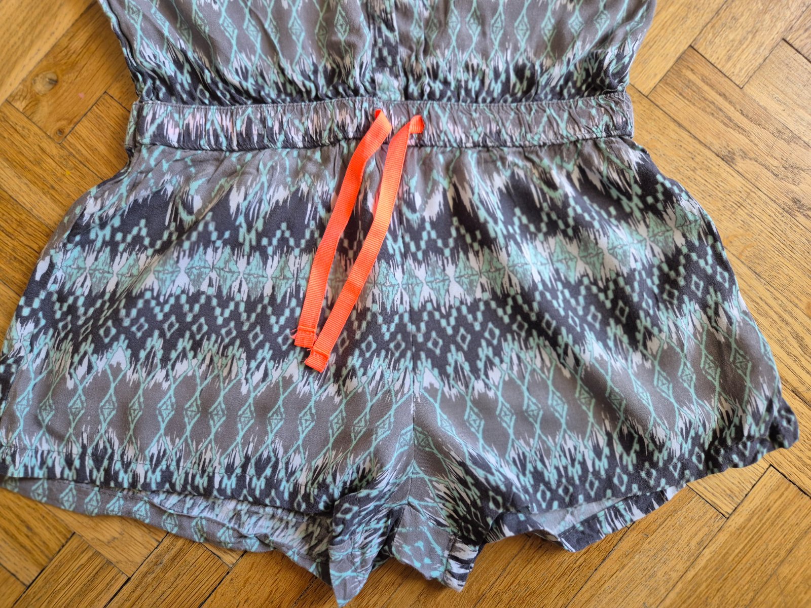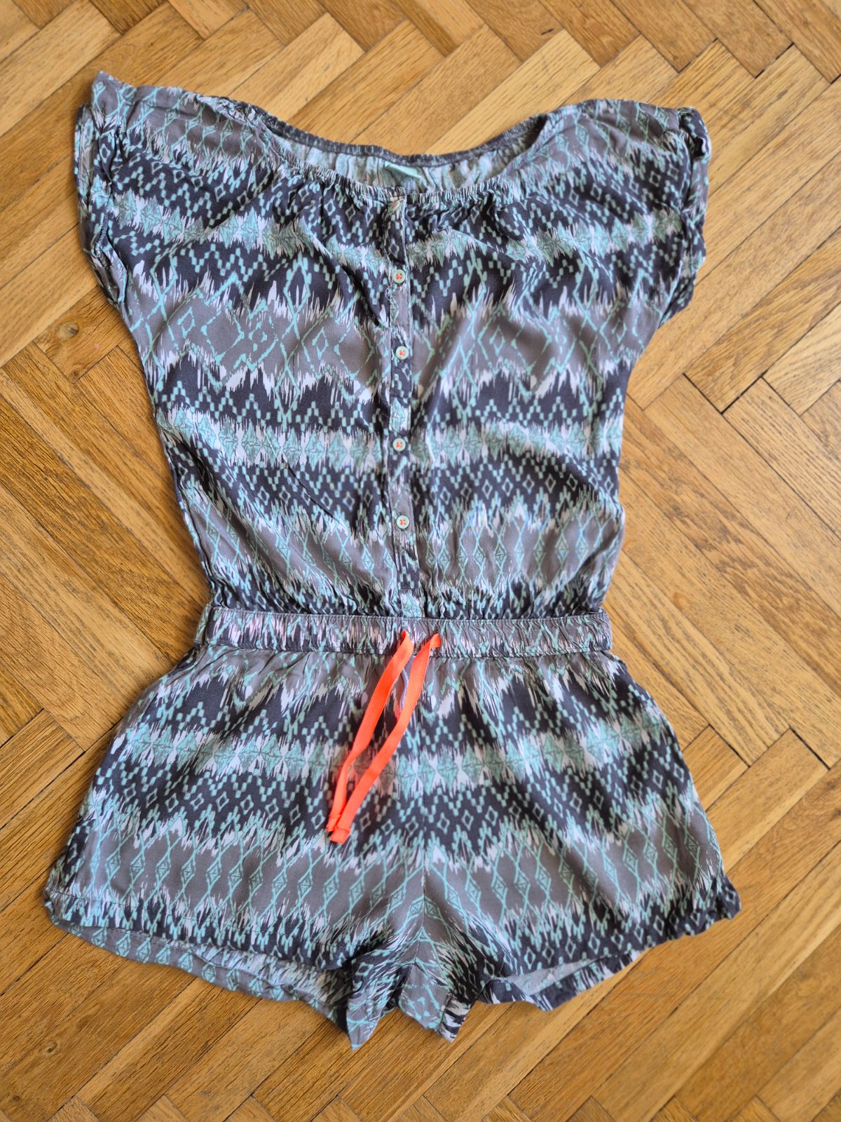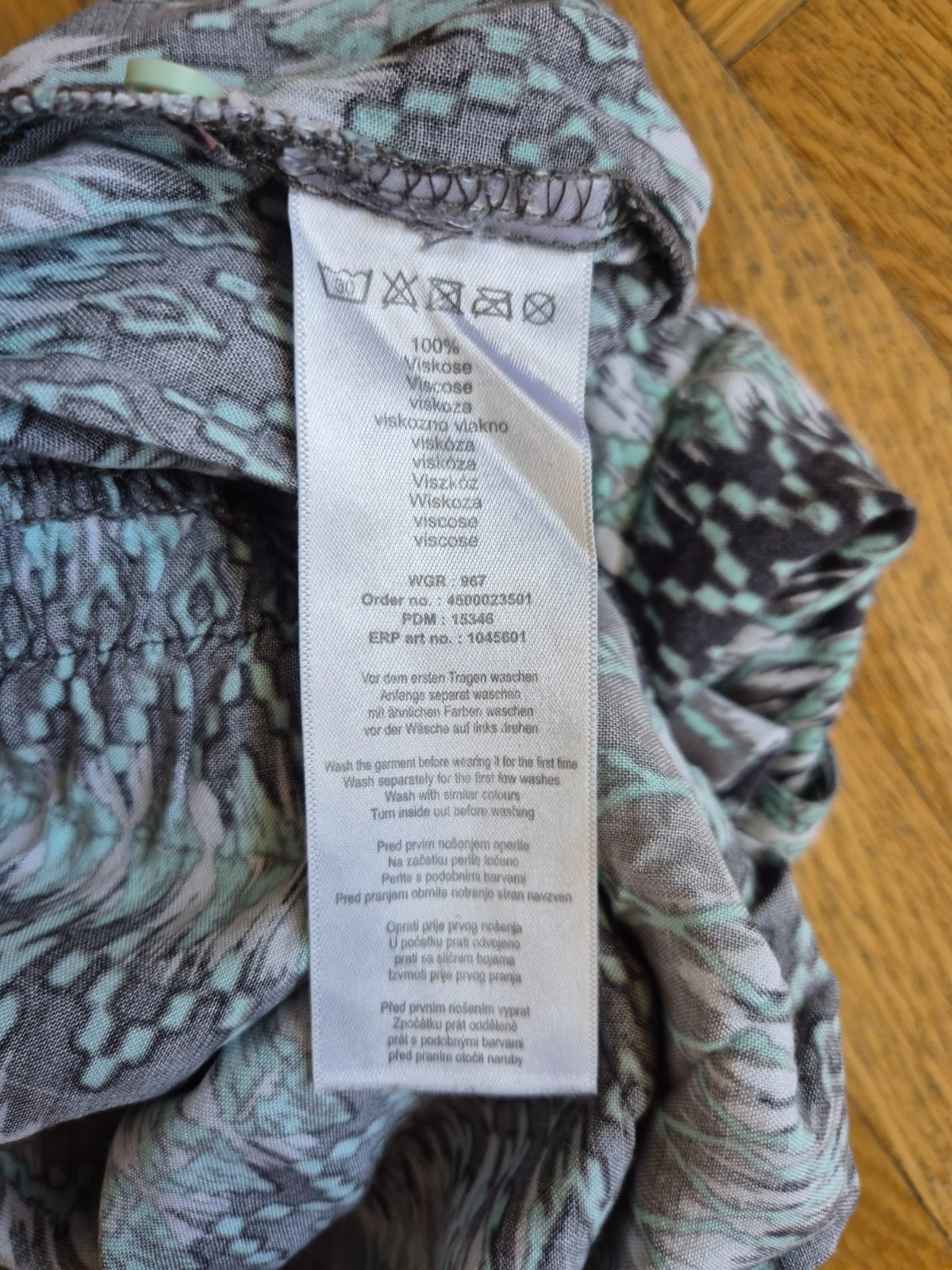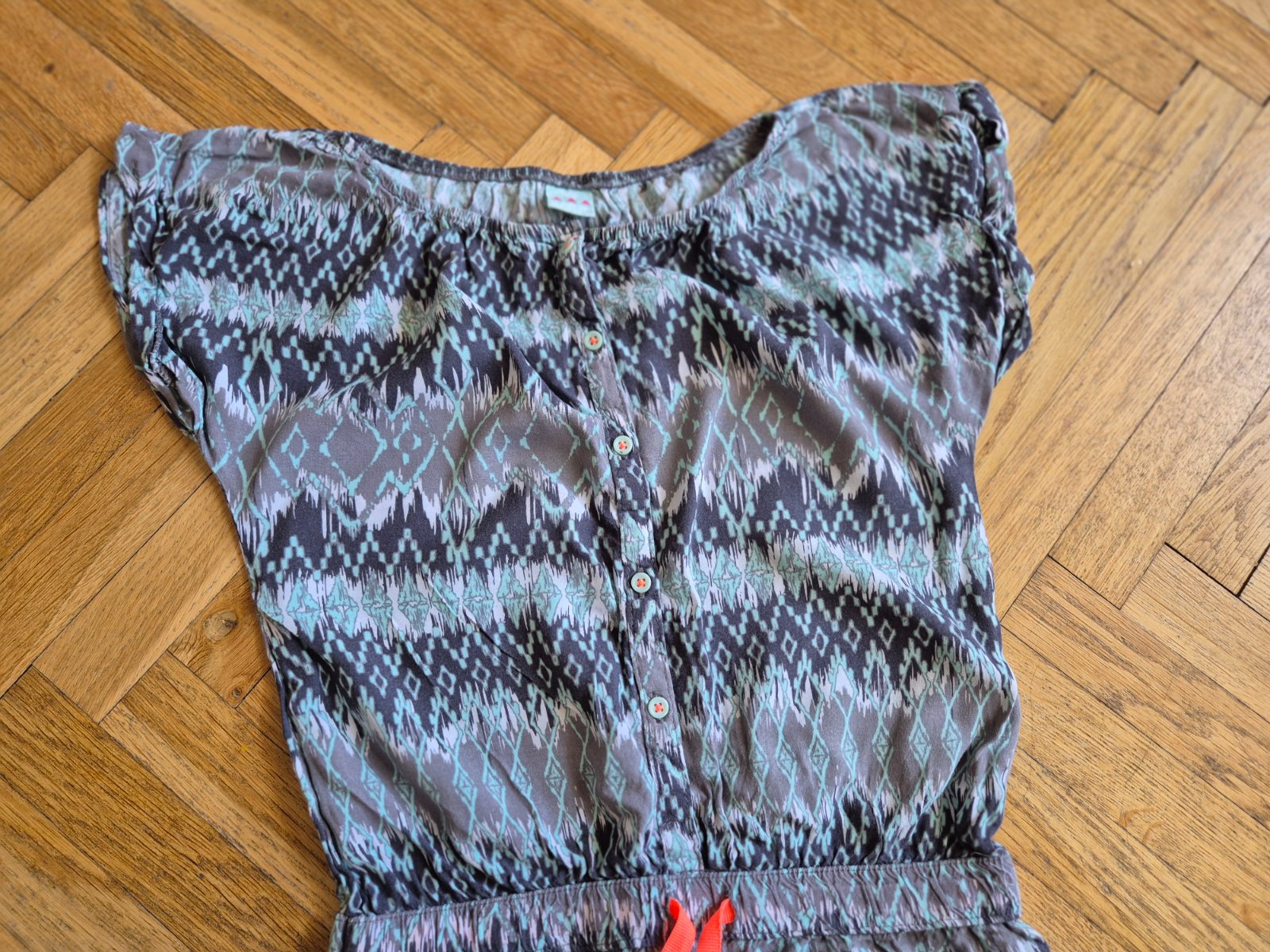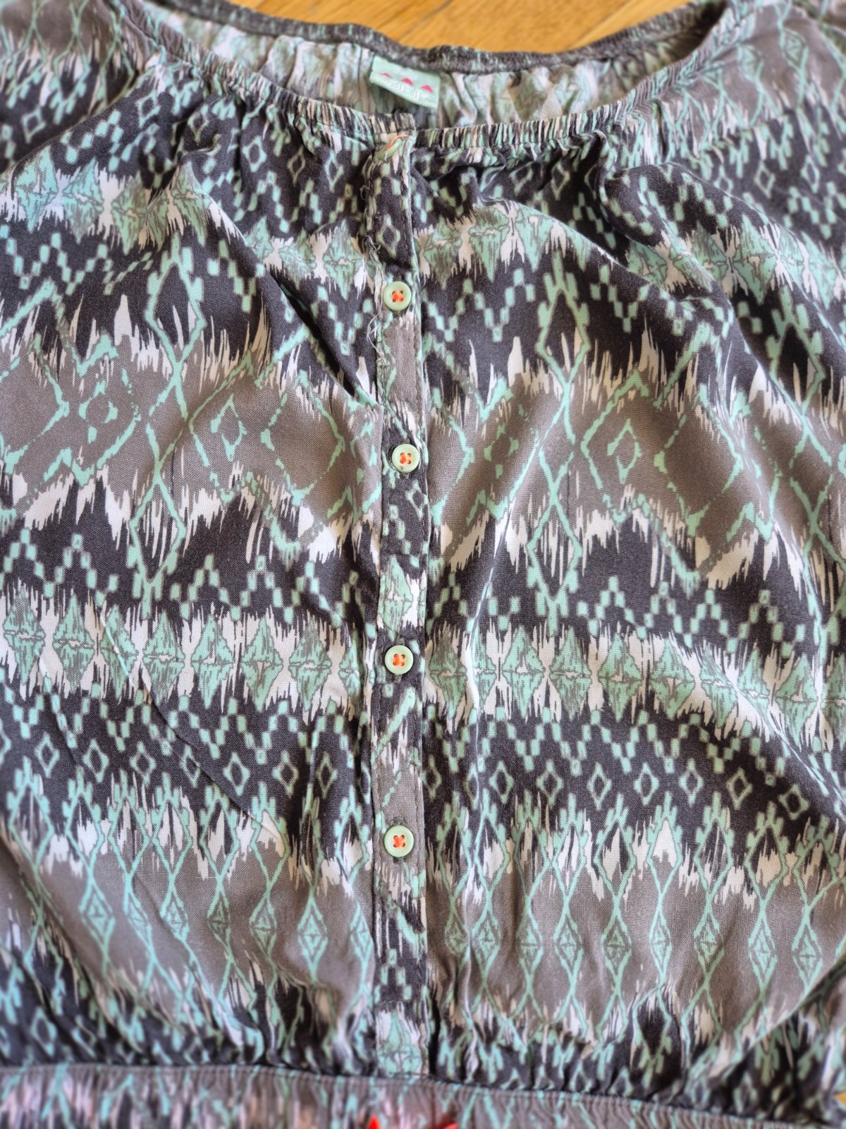 100% viskóza, v pase guma a ozdobná šňůrka, knoflíky se dají rozepnout, ale není to při oblékání nutné, celá horní čast je nahoře ve vystřihu na gumu, bez vad