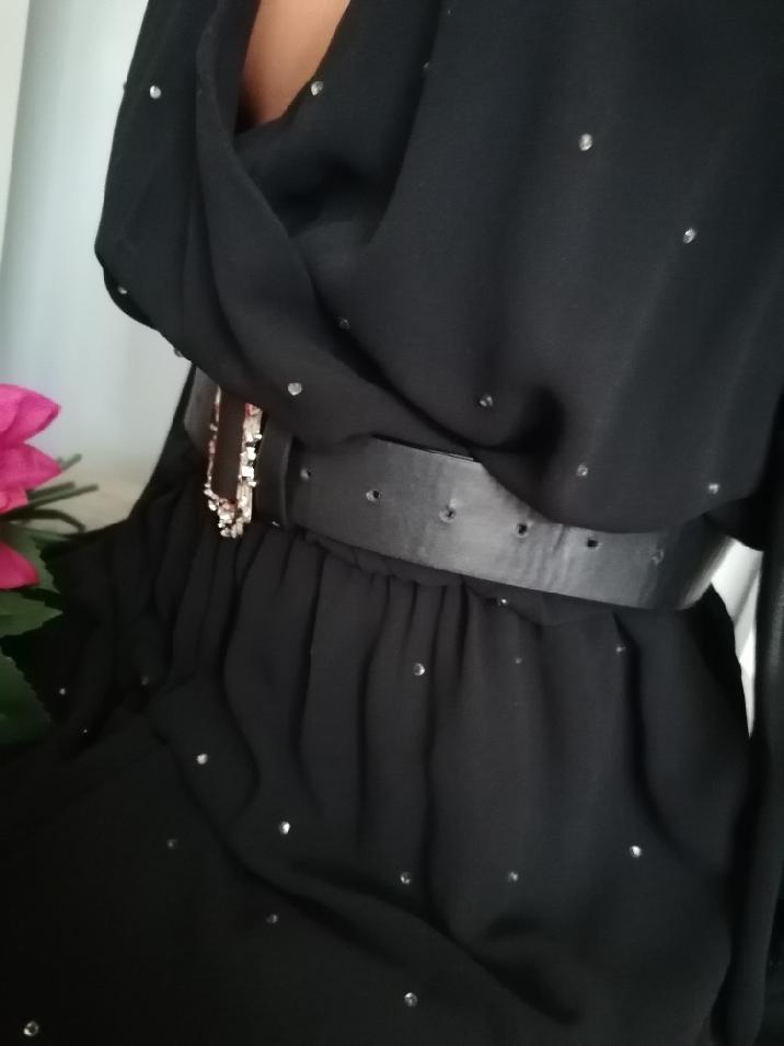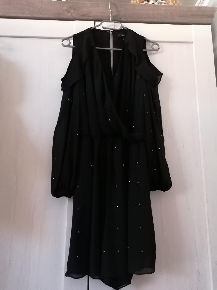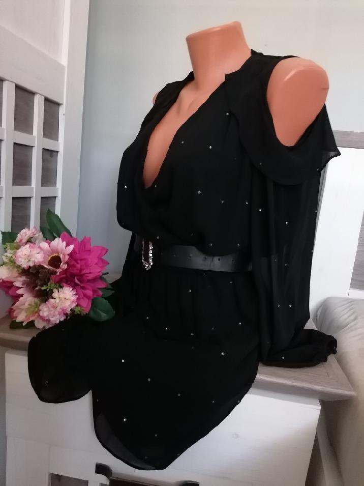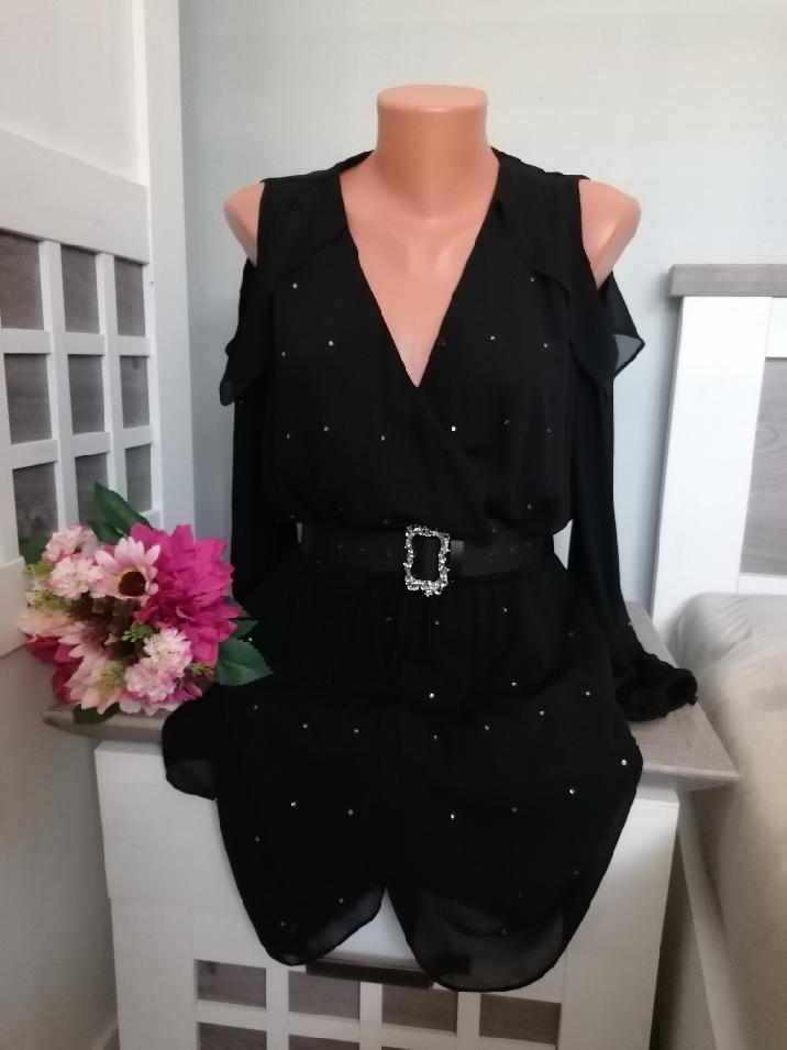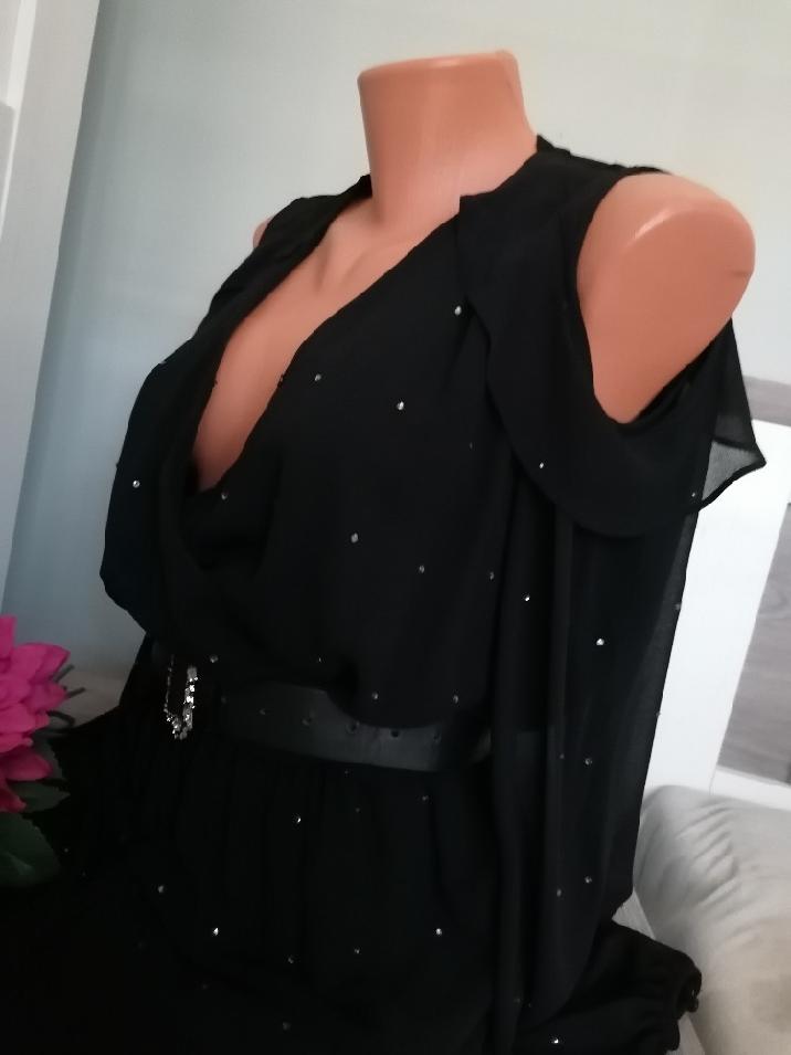 Pěkný nejen společenský šifónový overal. Sexy výstřih, vzadu na knoflíček, v pase je našitá gumka, spadlá ramena a na nich našité volánky......Na koncích rukávů je knoflíček....Na látce jsou kamínky.....Overal je v perfektním stavu, neprosvítá, je našitá podšívka. Na fotu je focen s páskem, ale ten není součástí prodeje....Míry : délka 90 cm, pas 2 x 30 cm - 2 x 52 cm, průramky 2 x 44 cm - 2 x 50 cm, délka rukávů je 66 cm. Materiál : 100 % polyester. Poštovné - balíkovna 75 Kč nebo zásilkovna za 90 Kč