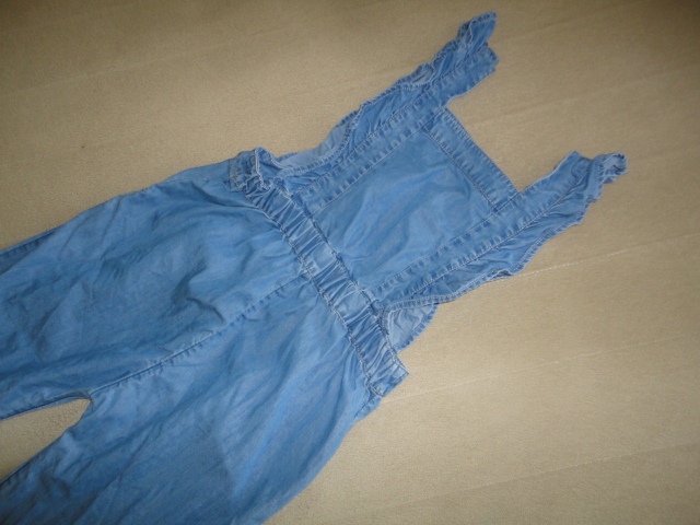 Nošený, stále hezký, pohodlný, slušivý overal z letní, odlehčené rifloviny, vhodný na triko, na ramínku na knoflíček, zdobný kanýrek, pas guma, nohavice dole do gumy, materiál 65% bavlna, 35% lyocell, boční kapsy v pase, uvedená velikost 3-4 roky, ale měřte, d. celková 84, vnitřní d. nohavic 37, od pasu dolů 60cm, š. v pase 28-30cm