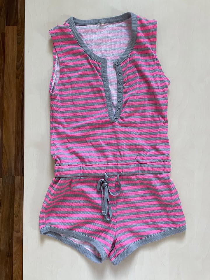 1364. nabízím k prodeji tento letní kraťáskový overal, vel není uvedena, nošen při S/M a myslím možno i méně volněji - prosím měřte. Materiál se strukturou, složení neuvedeno. V nižším pase tunýlek a tkanice ke stažení. Nošen, bez vad, krásný
