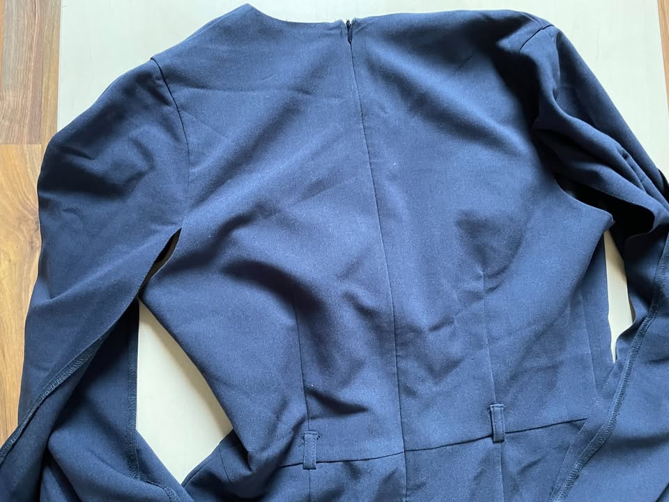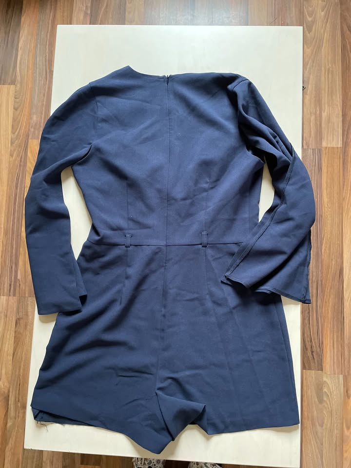 2504. nabízím k prodeji tento tmavě modrý/námořnická overal s širokými, prostřiženými rukávy, vel 42/Xl, ale řekla bych je menší cca M/L, prosím řiďte se rozměry, Miss Selfridge. Materiál jako u kostýmků - 73% polyester, 20% viscoza, 7% elasten a 100% polyester podšívka. Zapínání na zip na zádech. V pase poutka na tenký pásek - pásek není součástí prodeje. Nošen, bez vad - jen u jedné z nohavic je narušeno vnitřní přišití lemu nohavice a bude třeba přišít aby založení nohavice dovnitř drželo, krásný