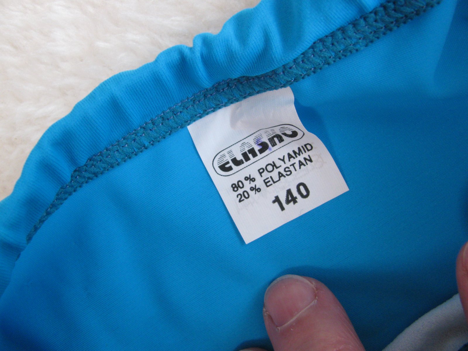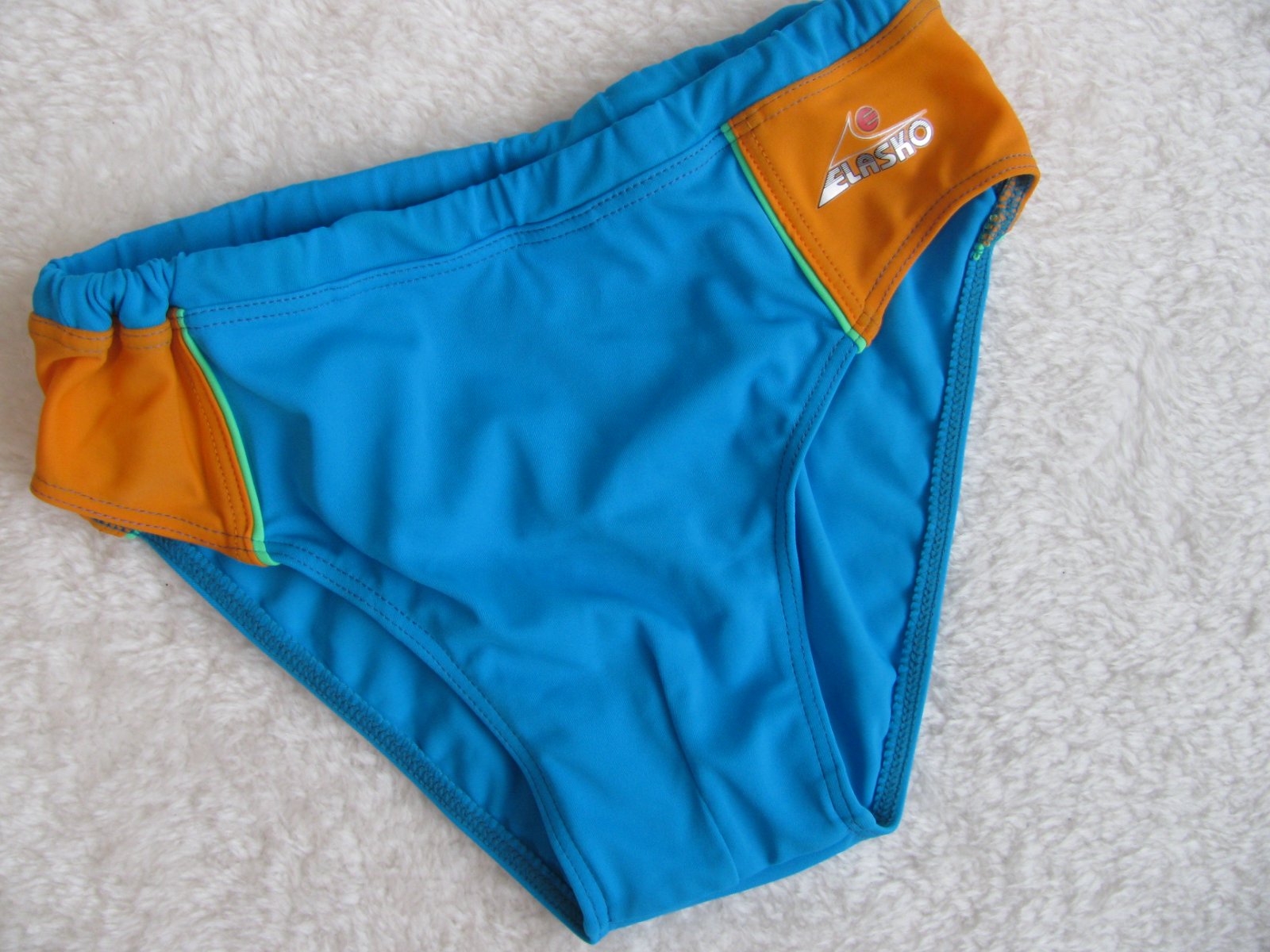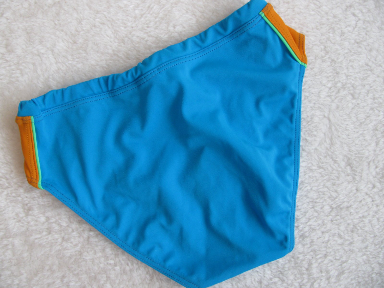 Krásné, pružné modro oranžové plavky, v pase guma a šňůrka, logo, 80% polyamid, 20% elastan.