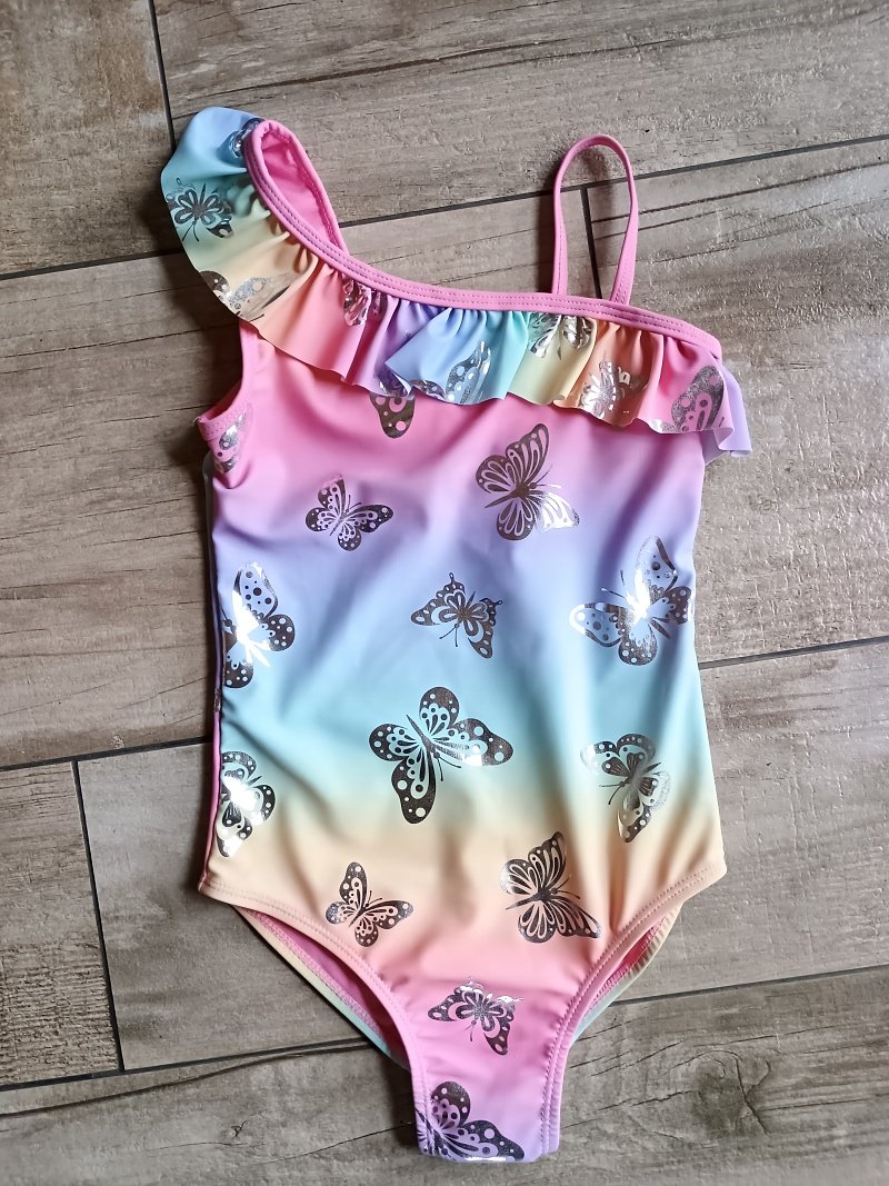 Jednodílné plavky s možností nastavení délky ramínek. Párkrát nošené, v top stavu. Vel. 122/128 d-63 cm (největší) průramky-30 cm