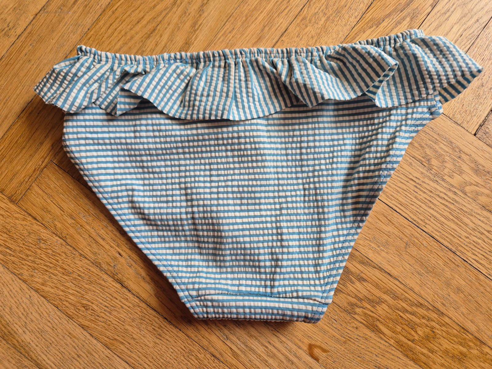 Mají podšívku a volánek na levém rameni, materiál připomíná krepovinu, barva je zapraná, svrchní materiál 58% polyester, 38% polyamid, 4% elastan