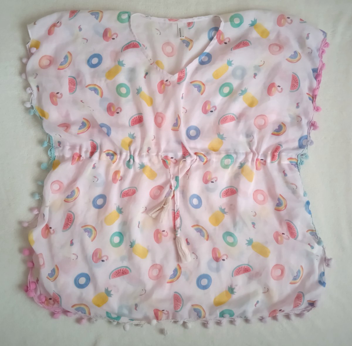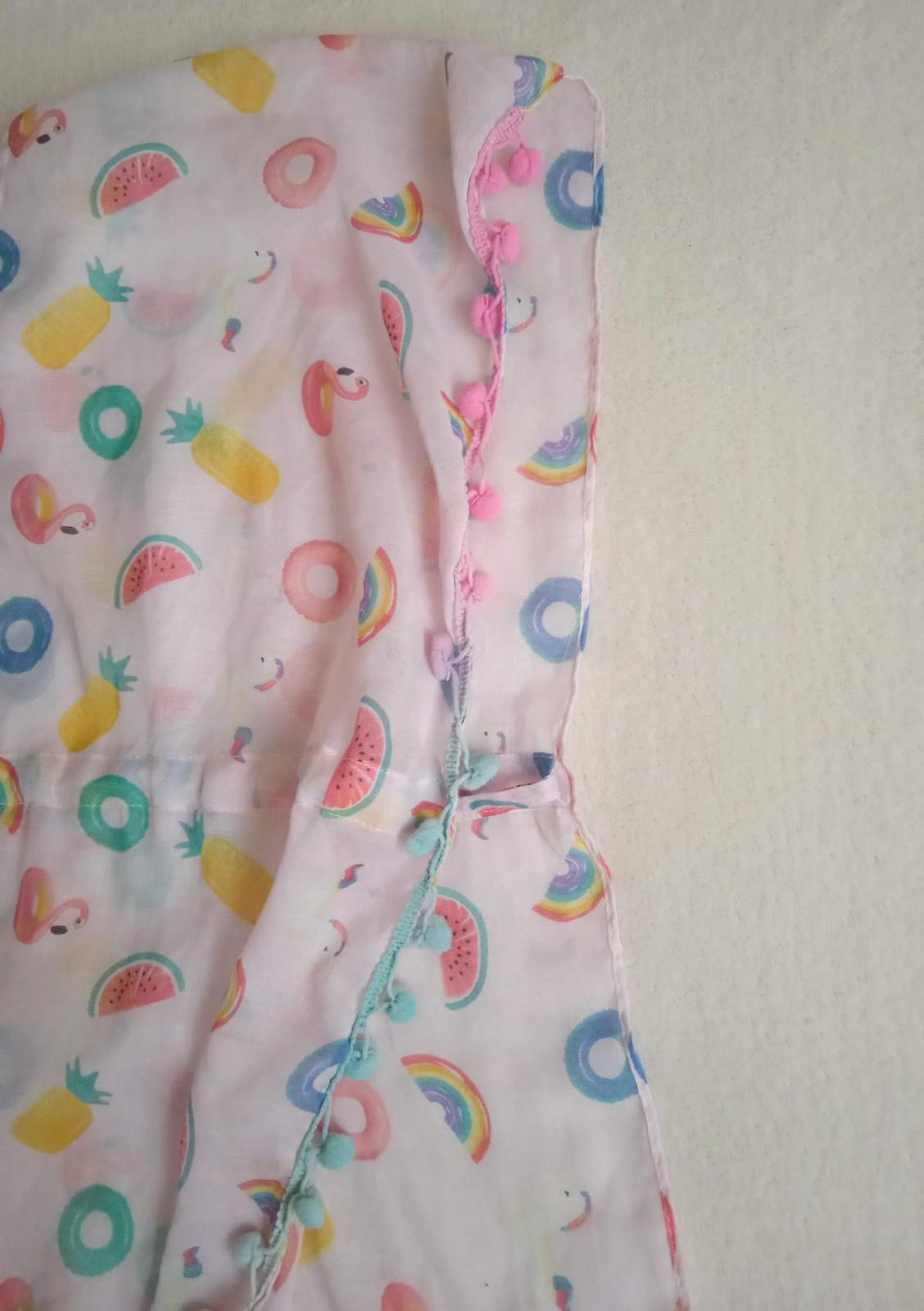 Nabízím dětský přehoz přes plavky zn. Reserved, velikost odhaduji na cca 5-9 let. Bez vad. Po obvodu přední části bambulky, v pase funkční šňůrka. Délka 63 cm, šířka cca 60 cm. Po bocích je volná, spojená šňůrkou.