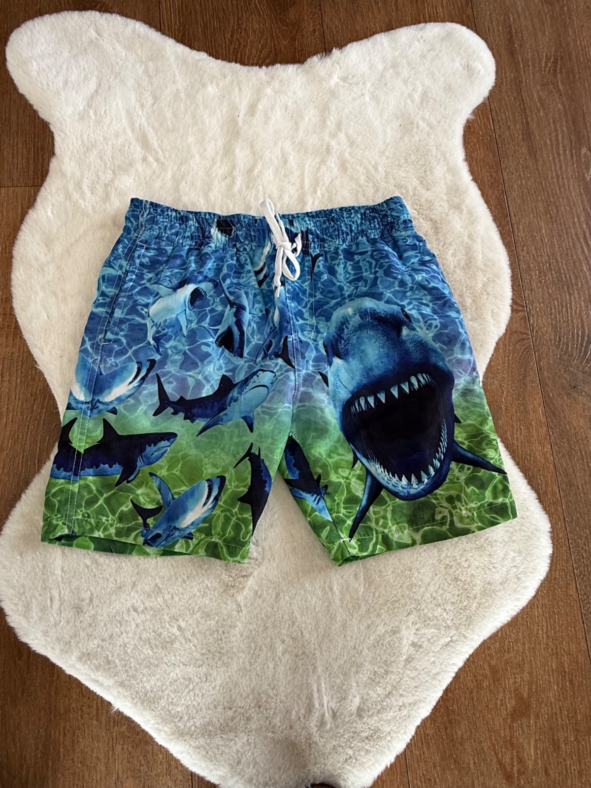 Hezké černo šedé koupací šortky, s všitou vnitřní vložkou, v pase guma a šňůrka, boční kapsy na zip, 100% polyester. Jediná vada je na šňůrce-viz foto, dá se ale pohodlně protáhnout přes otvory, ji...