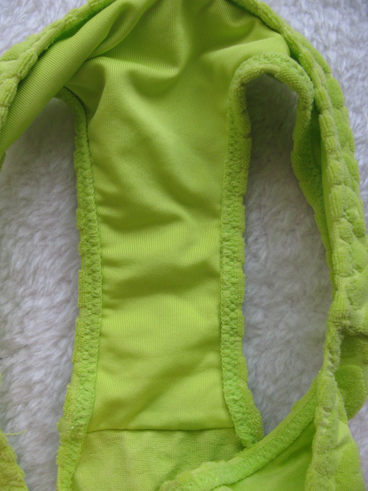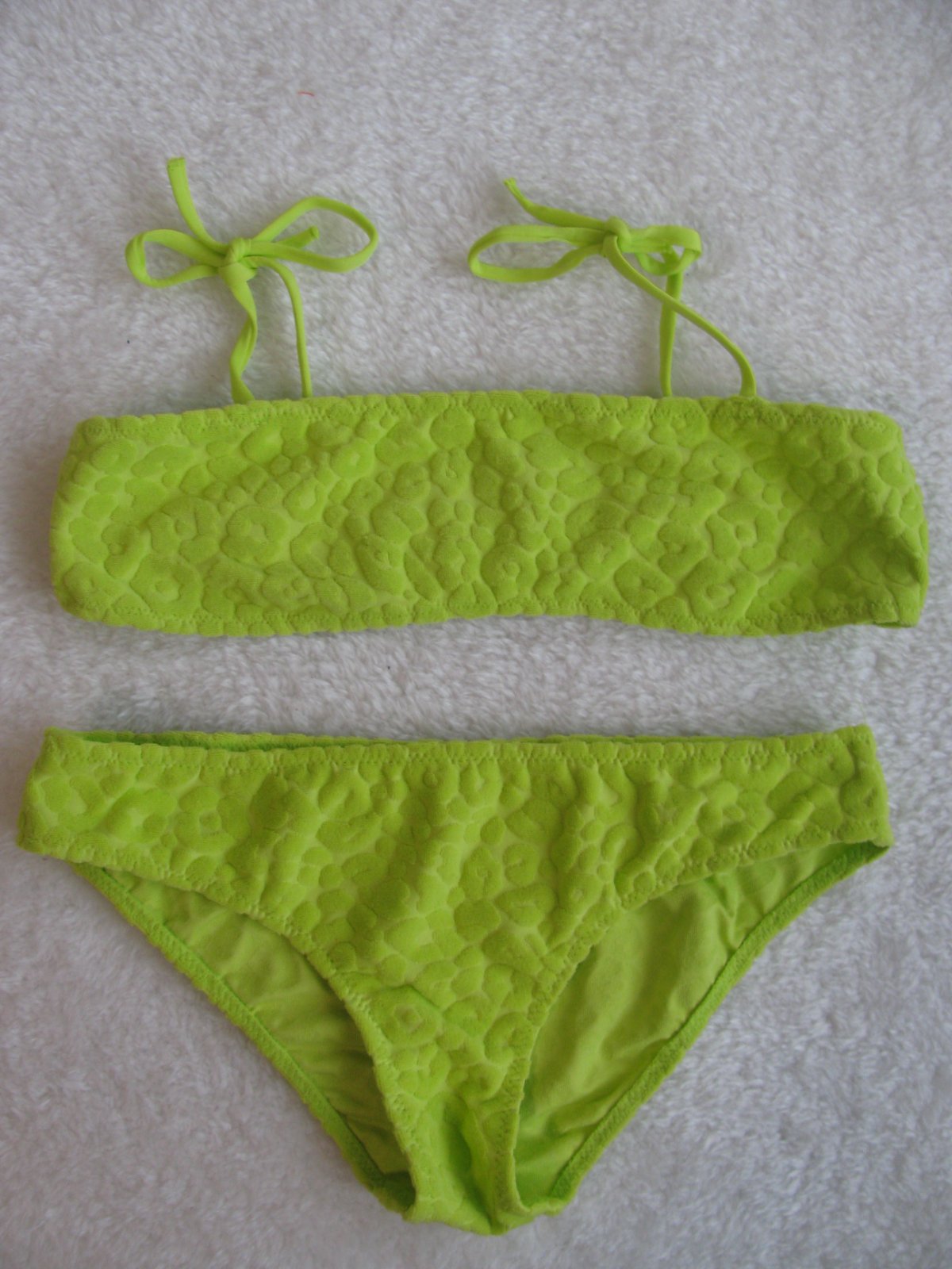 Krásné, dvoudílné plavky (bikiny) v limetkově zelené barvě s texturovaným vzorem, podprsenka na šňůrky a vzadu zap. na sponu. Top stav bez vady, čisté v mezinoží, štítky ustřiženy, proto prosím pečlivě měřte, děkuji.