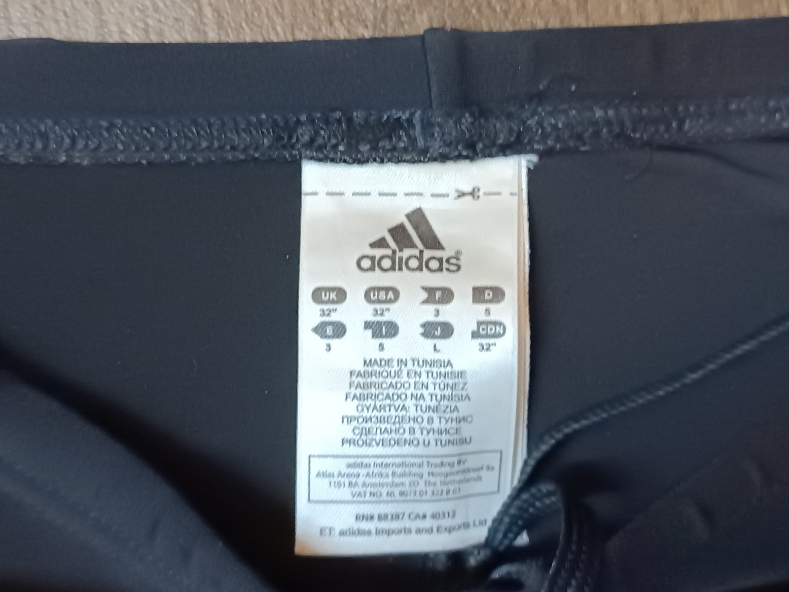 1) zn. Adidas, vel. 12-13 let, šířka v pase 2x32 cm (bez natažení, regulace v pase - šňůrka), pěkný stav. Cena 120 Kč.