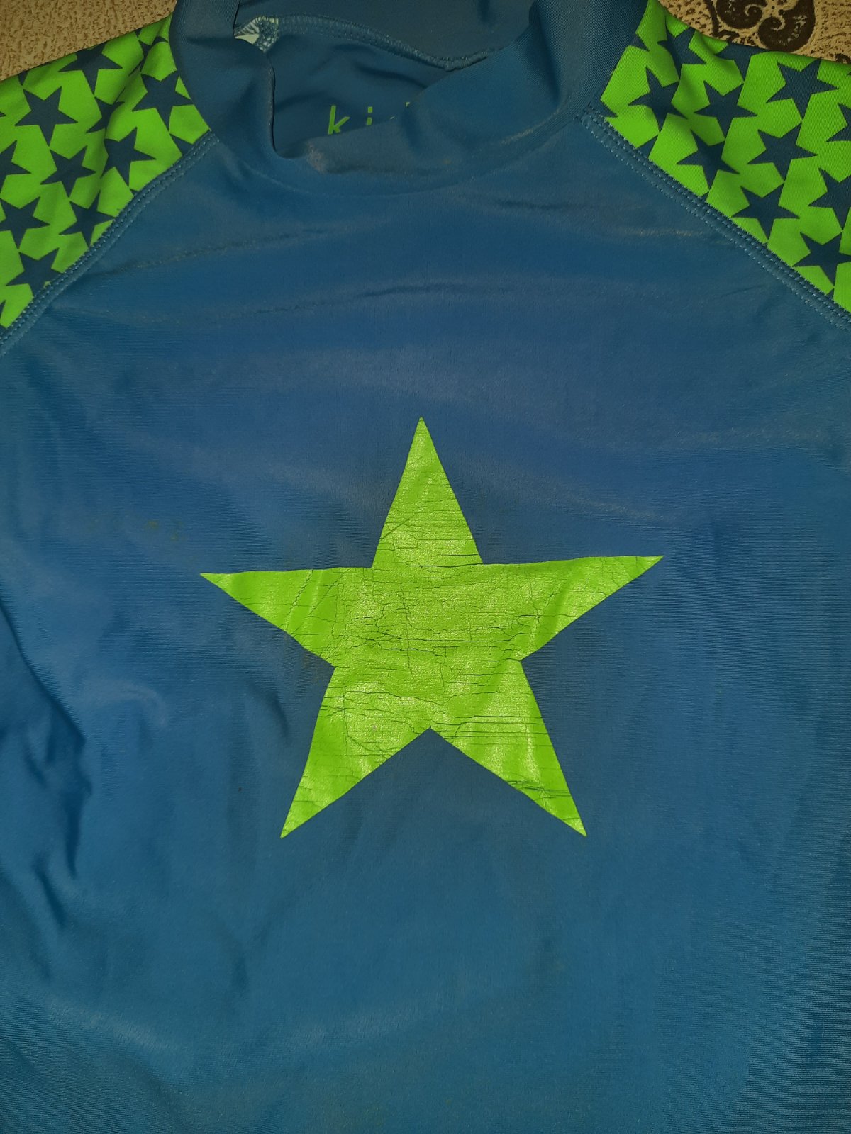 Prodám plavkové tričko, značka: Tchibo, velikost: 86 - 92, složení: 82 % polyamid, 18 % elastan, velká hvězda je popraskaná, jinak v pořádku. Cena trička je: 35 Kč + poštovné. Krabice č. 42.