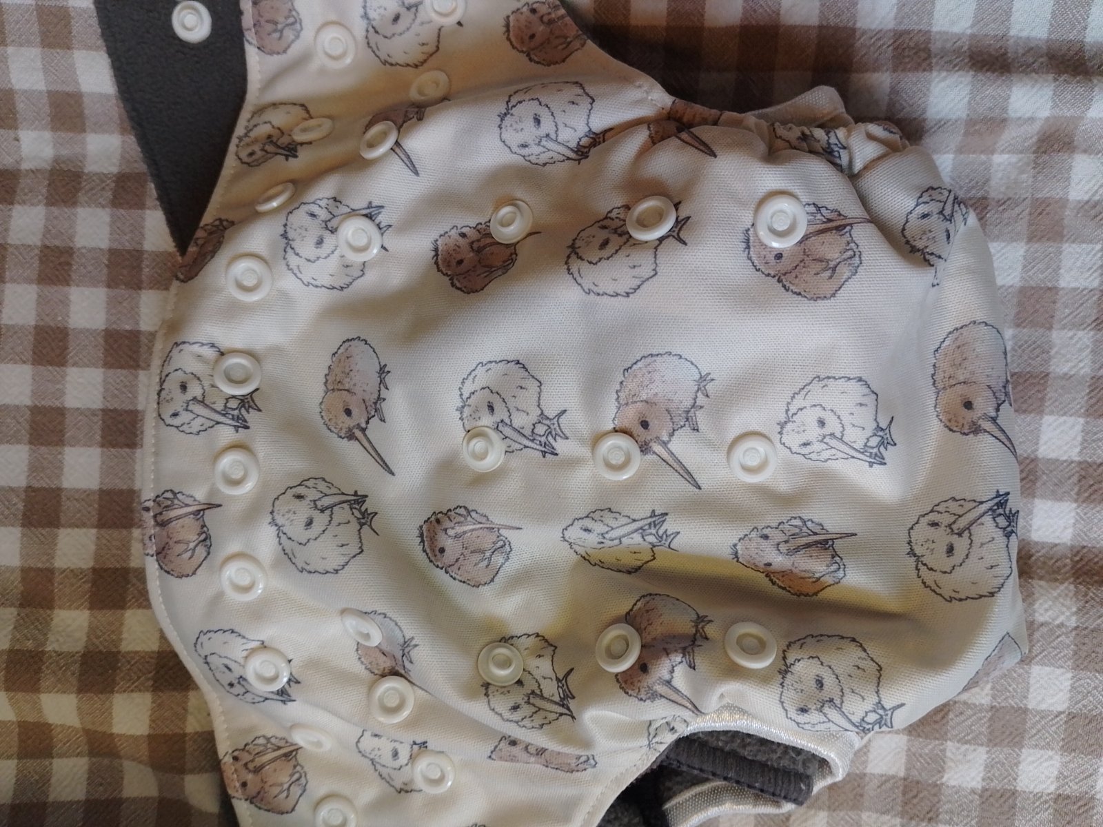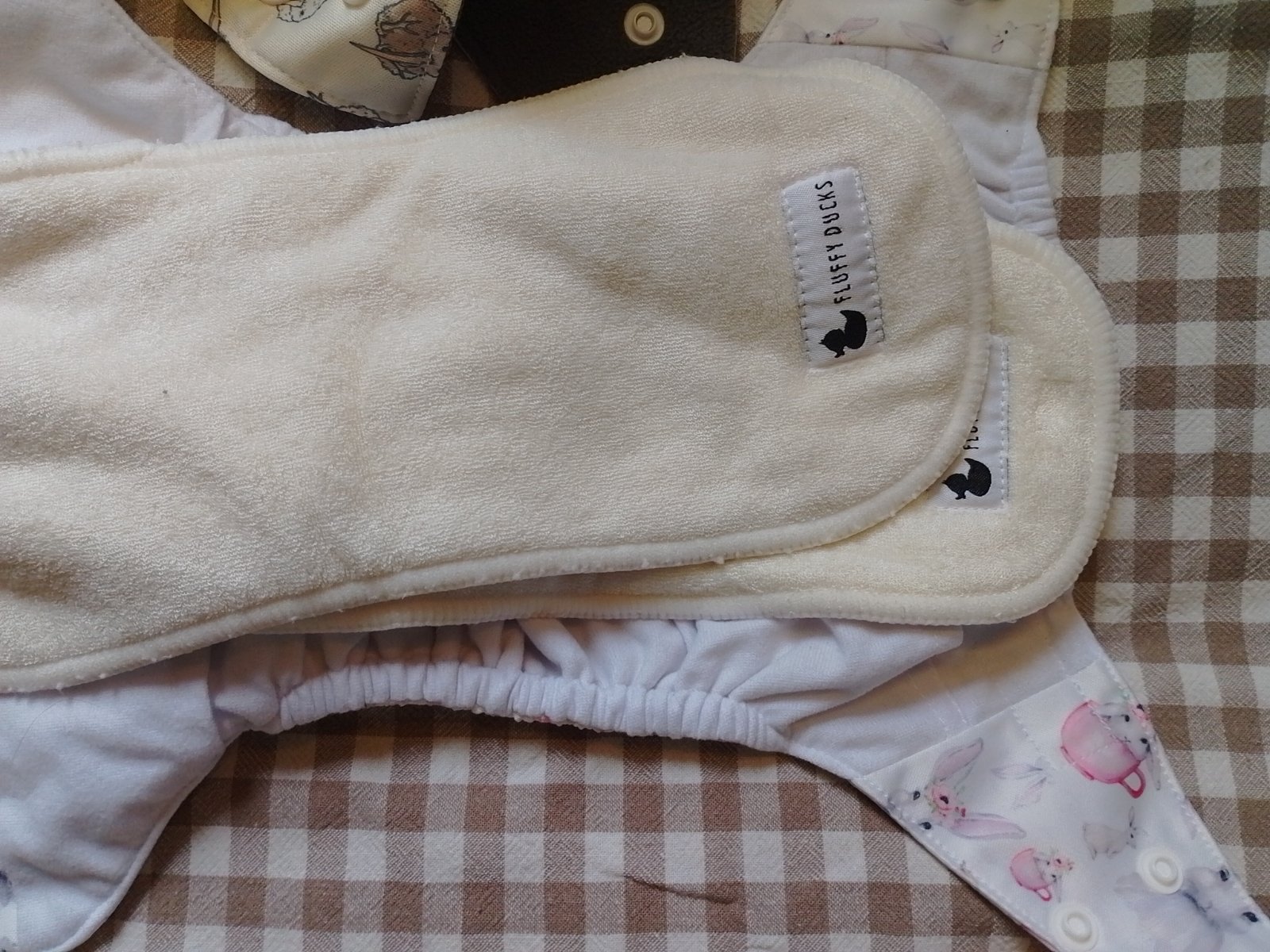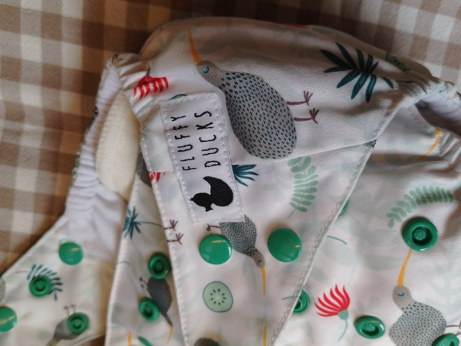 Plenky Fluffy Ducks a Little Genie z Noveho Zelandu (+ jedna ceska - viz jiny inzerat). Fluffy ducks vnejsi plenka s roztomilym designem (ruzovi kralicci a kiwi), vnitrni vlozky bambusove.