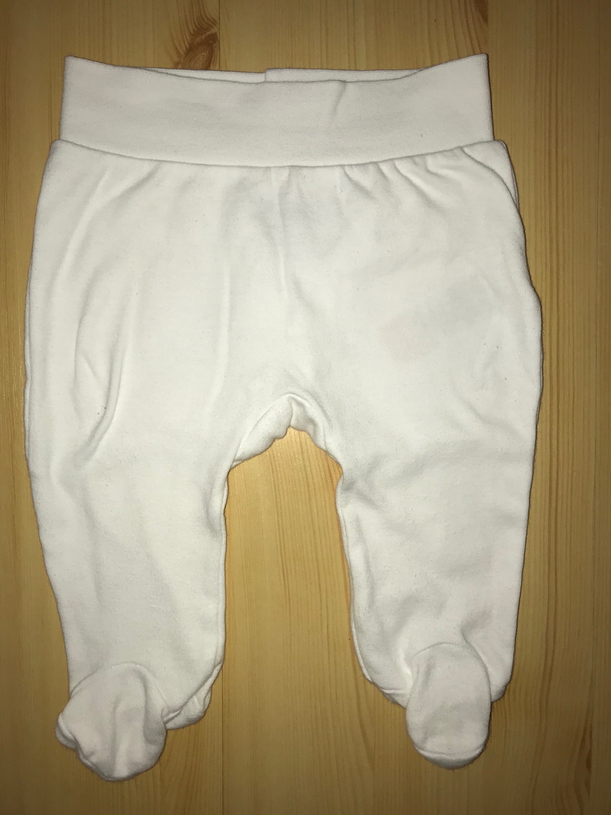 Bílé s šedým proužkem, sametové, v pase do gumy,75% bavlna, 25% polyester. Značka GEORGE Velikost 62 Rozměry dél po patu-28cm,, po špičku-32cm,,,pas-2x20cm,,,nataž.-2x26cm,,,