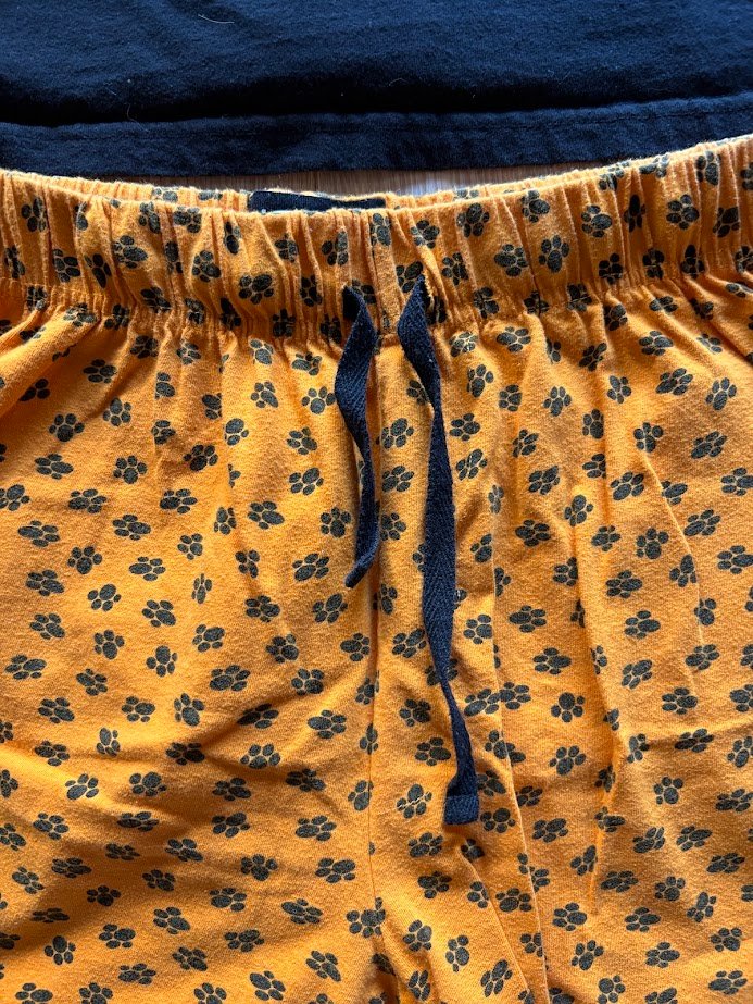 Pyžamo je kupované nové. Na zádech je flíček, nejde vyprat (nafoceno). Délka zad 47cm. Pas 2x28cm, boční délka 28cm. Cena + balíkovna 75kč, zásilkovna 89kč.