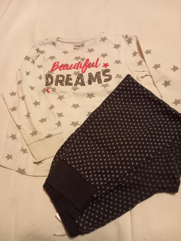 Po naší Ami. Ve velmi dobrém stavu, bez vad, oblíbené, smetanový vršek s šedými hvězdičkami a růžovo-šedým-třpytivým nápisem, tmavě šedé kalhoty se světlými hvězdičkami.