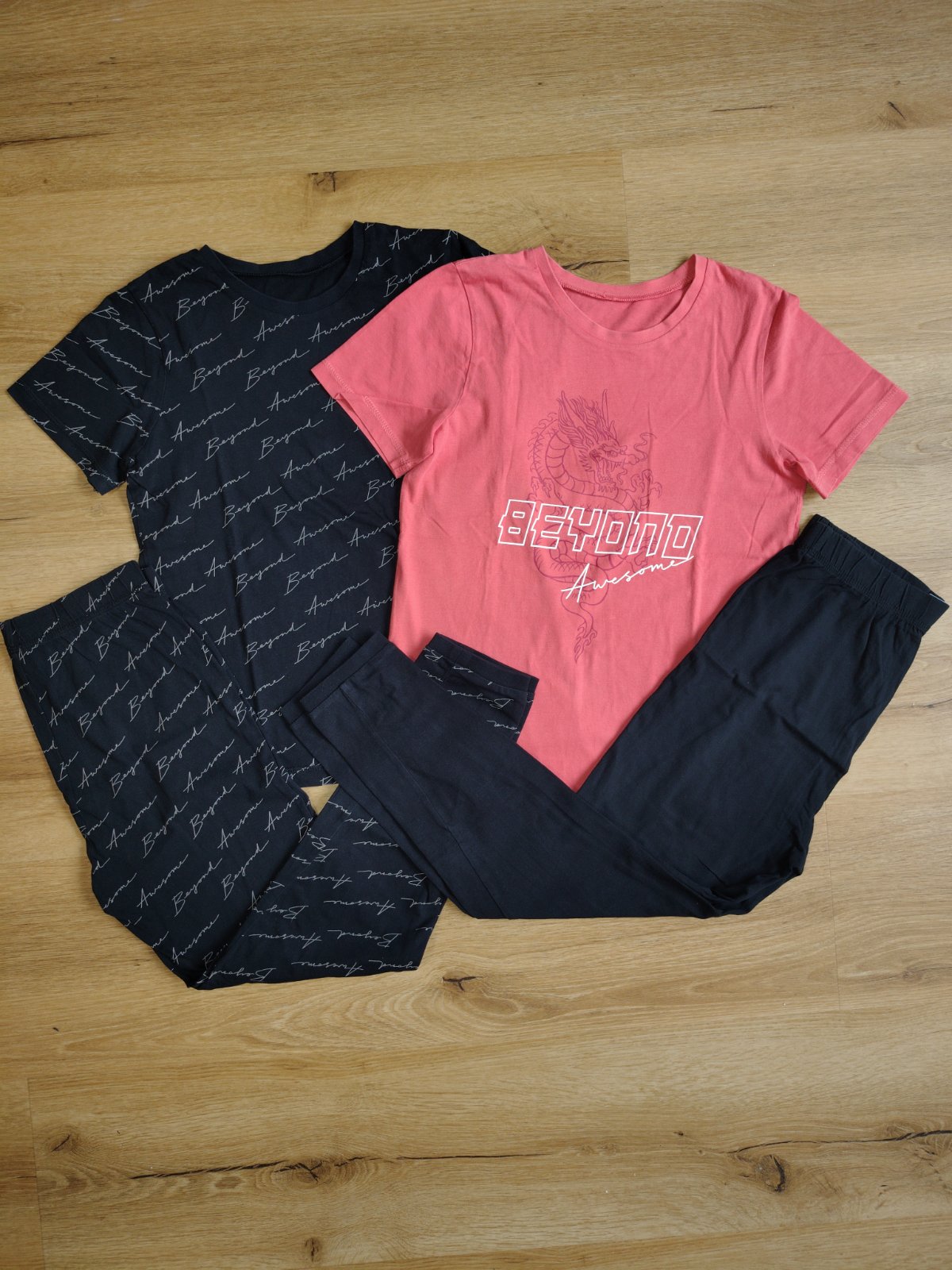 2pack dětské dvoudílné pyžamo George 146/152 (11-12 let) dlouhé kalhoty a trika s krátkým rukávem. Červené triko s obrázkem čínského draka a černý set celopotisk napisů Beyond Awesome.
