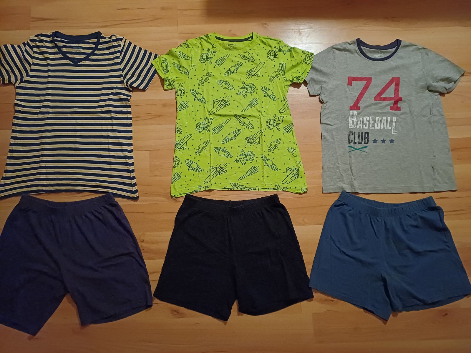 3x sada pyžamo, ale lze nosit i na ven. Vel. 158/164, 12-14 let, zn. Pepperts. Pruhované a žluté tričko jsou nové, nepoužité. Sada s pruhovaným a žlutým tričkem - cena za 1 sadu 75,-Kč. Sada s tričkem s číslem 74 je za 65,-Kč. Při odběru všech tří pyžamek je celková cena 200,-Kč.