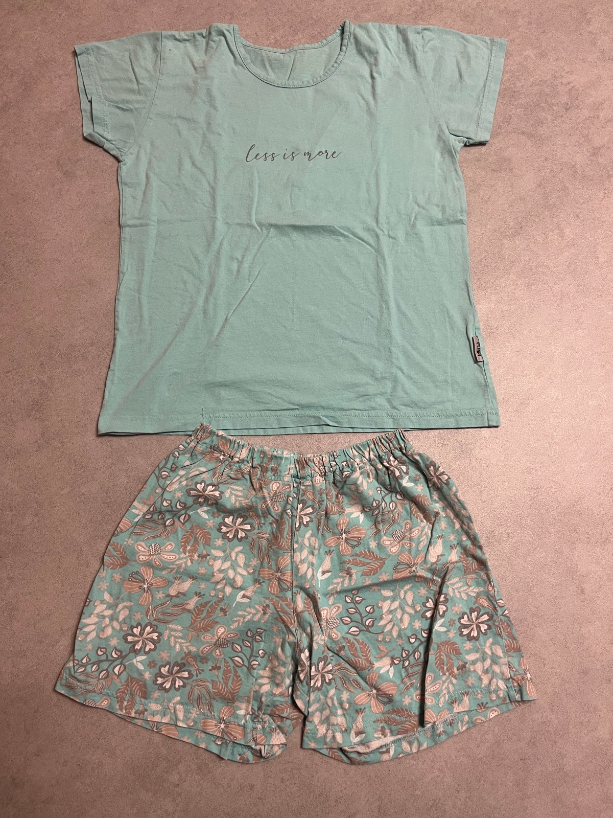 Pyžamo české výroby. Je nošené cca půl roku na střídačku s dalšími pyžamy. Velmi pěkná bavlna. Tričko má na rameni flíček a je lehce rozpáraný lem.