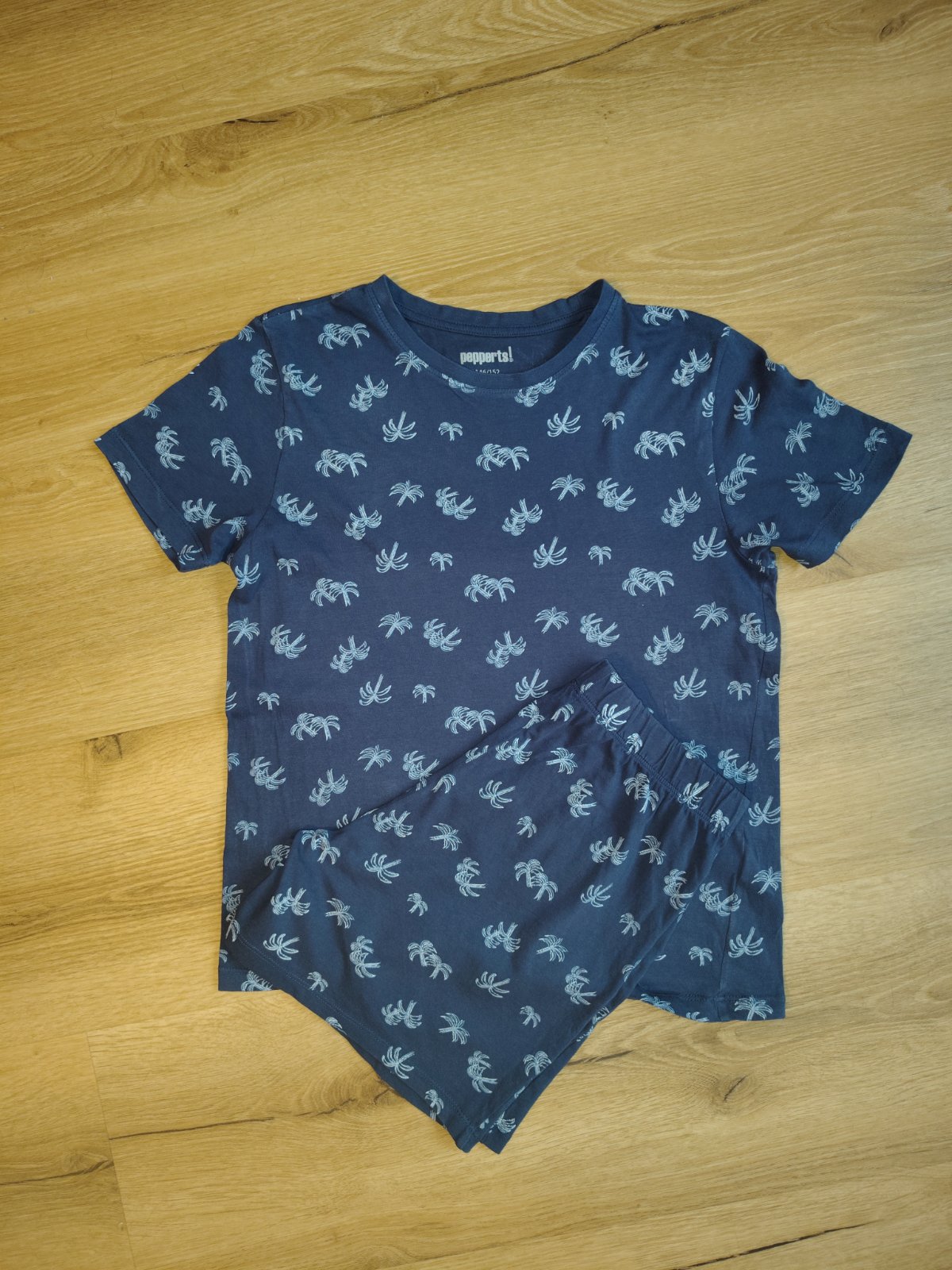 Dětské bavlněné krátké dvojdílné pyžamo 146/152 (10-12 let). Barva tmavě modrá a bílé palmy. Skvělý stav, námi kupované nové.