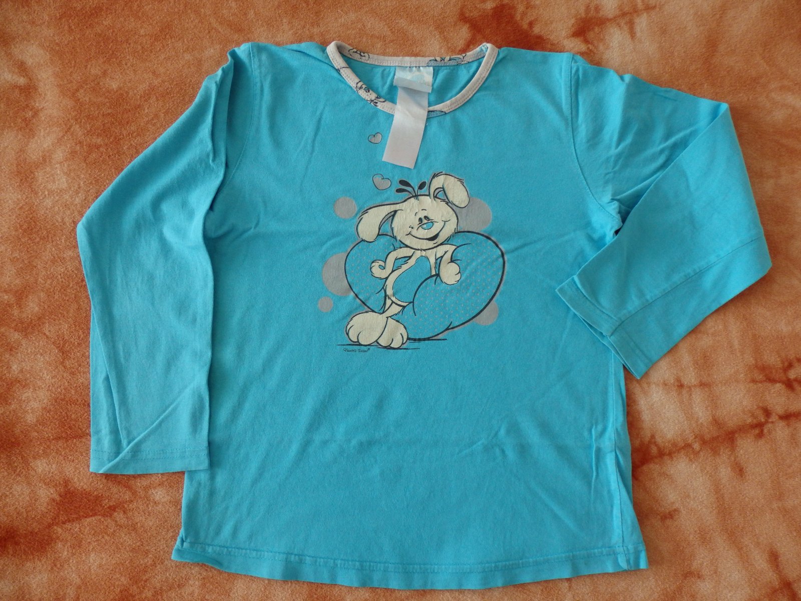 Starší pyžamko s králíčkem, nošeno při velikosti 122/128, obrázek už praská, kalhoty jsou trochu zažloutlé v pase, gumu bude nutné vyměnit, malá dírka v rozkroku na zašití. Ale určitě by ještě posloužilo, alespoň do rezervy. U nás i tak oblíbené. Daruji k objednávce.