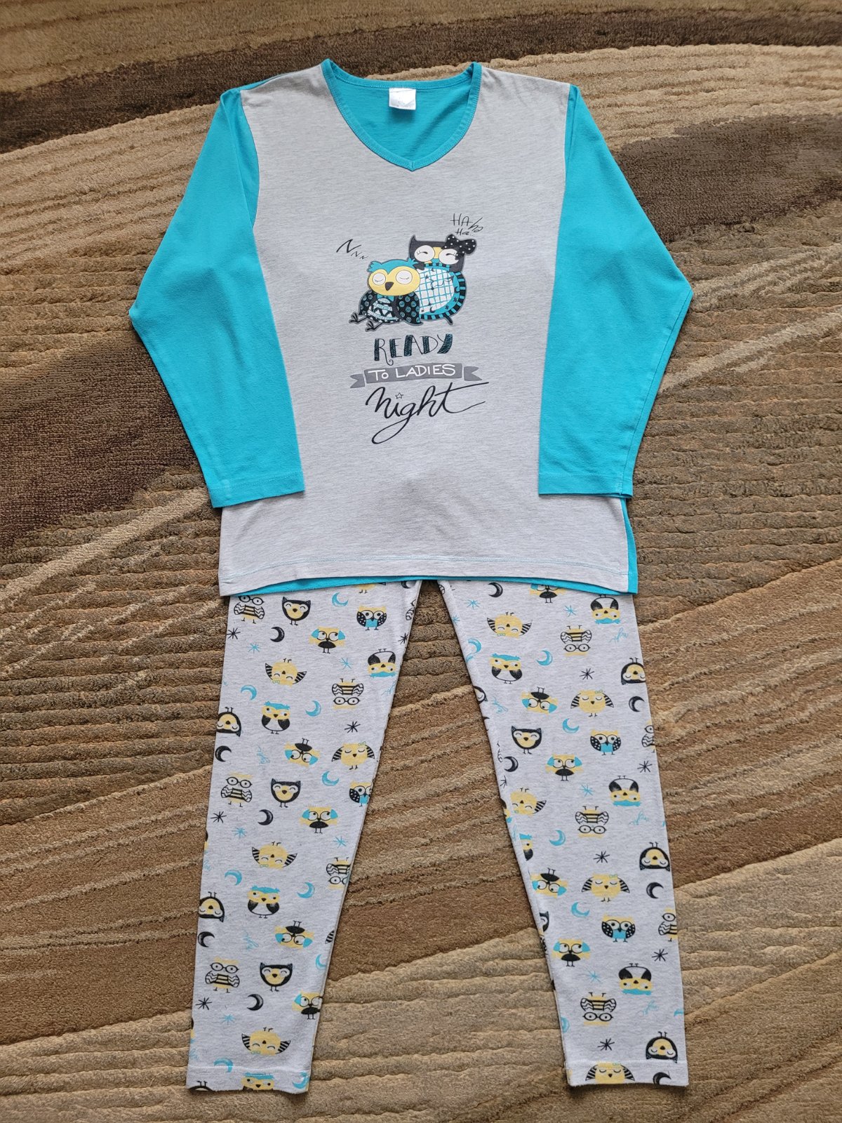 2-dílné dlouhé pyžamo se sovičkami v barevné kombinaci světle šedé a světle modré, v pase kalhot guma.