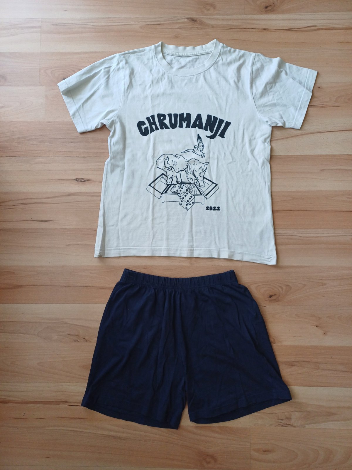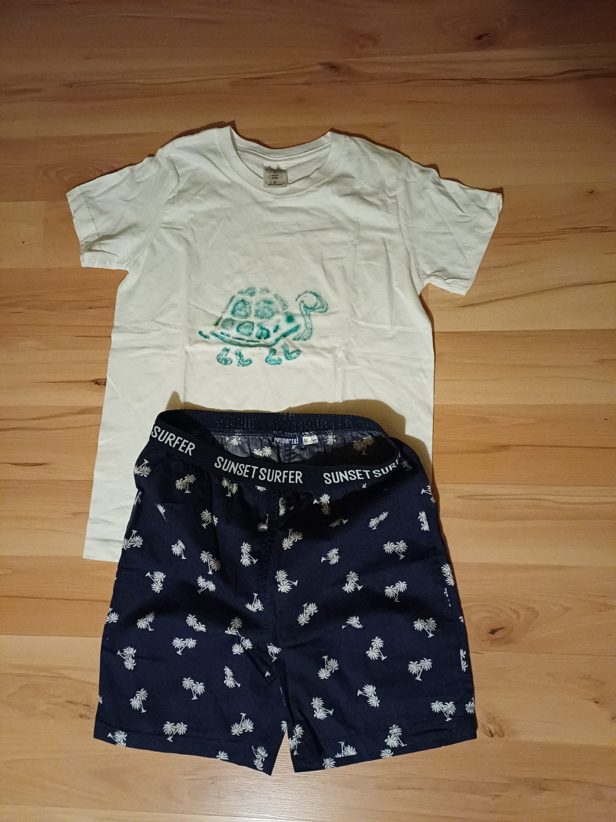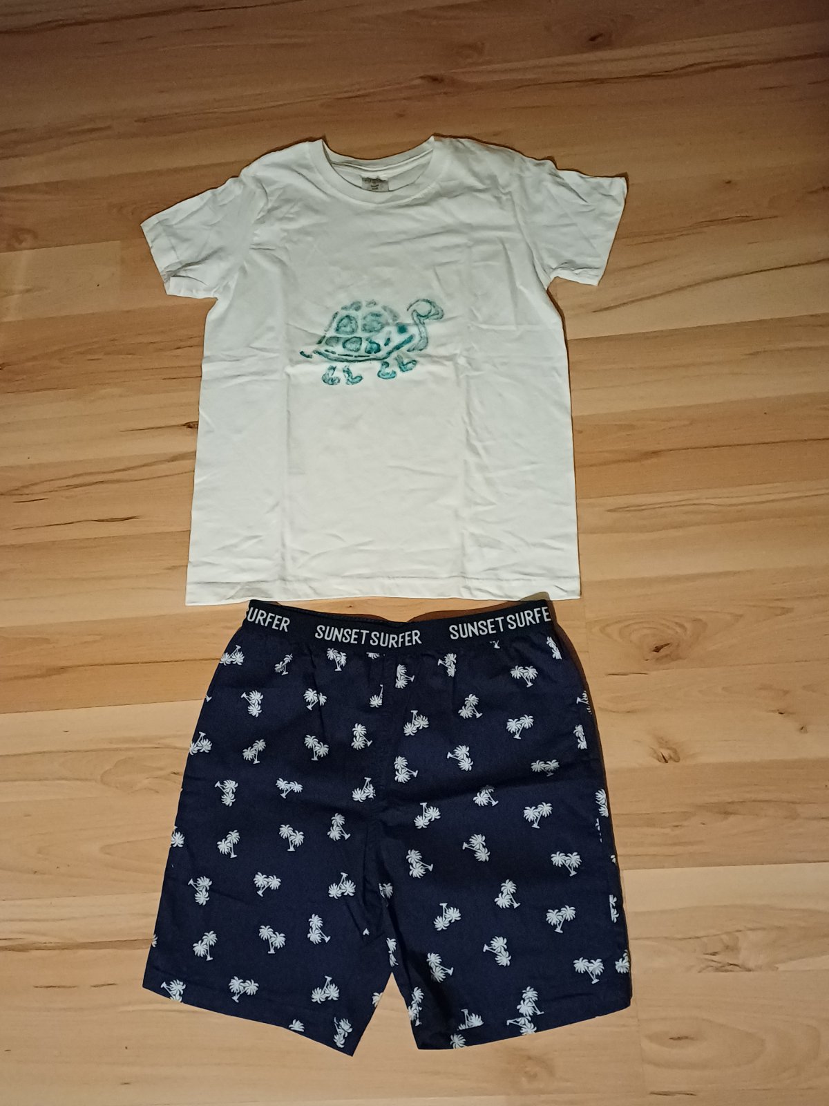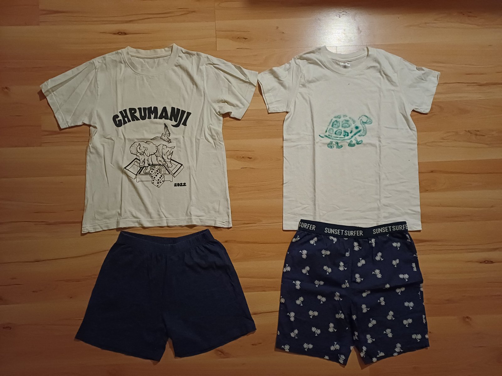 2x pyžamový set - kraťasy a tričko, vel.146/152, 10-12 let. Set s tričkem Chrumanji cena 60,-Kč. Set s tričkem ze želvičkou je nový, nepoužívaný cena 70,-Kč. Při odběru obou je cena 120,-Kč za vše.
