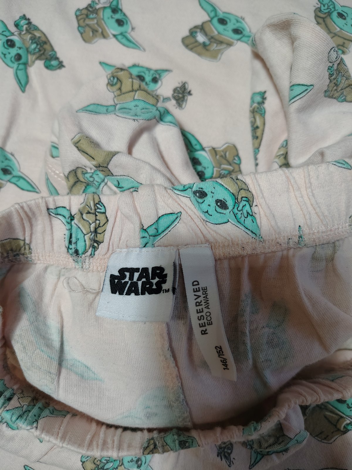 Dívčí bavlněné dvoudílné pyžamo krátké Reserved 146/152 Star Wars s motivem Baby Yoda (Grogu). Ze 100% bavlny, svetloulince růžové s celopotiskem.