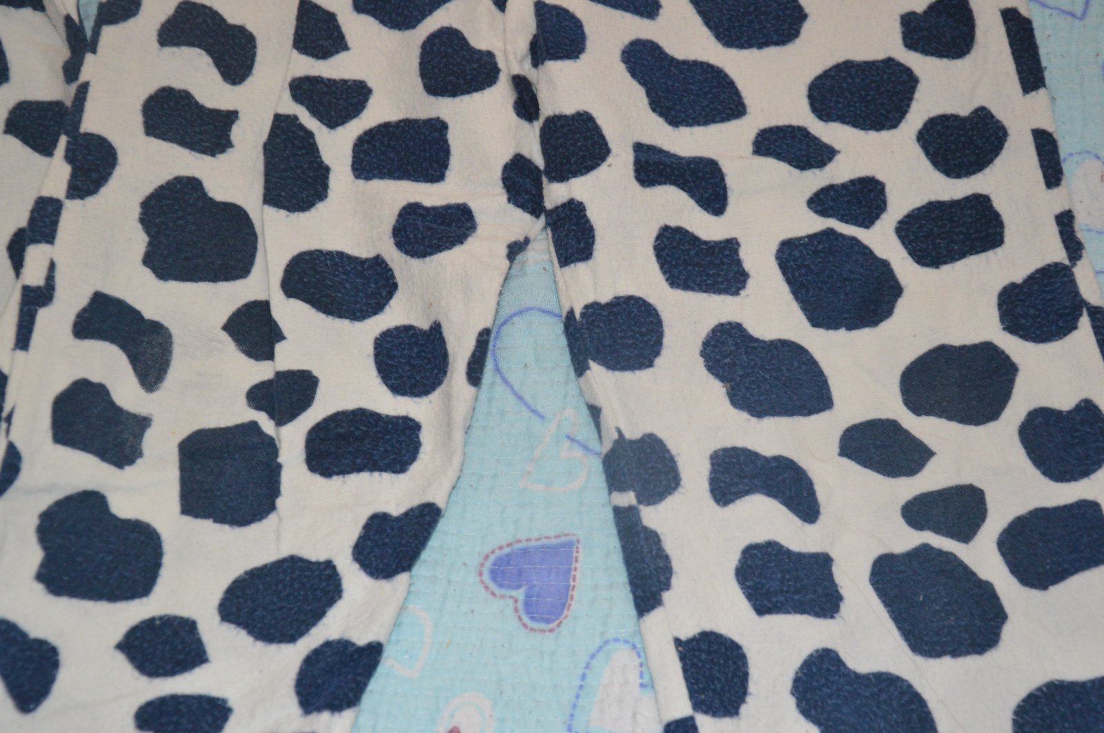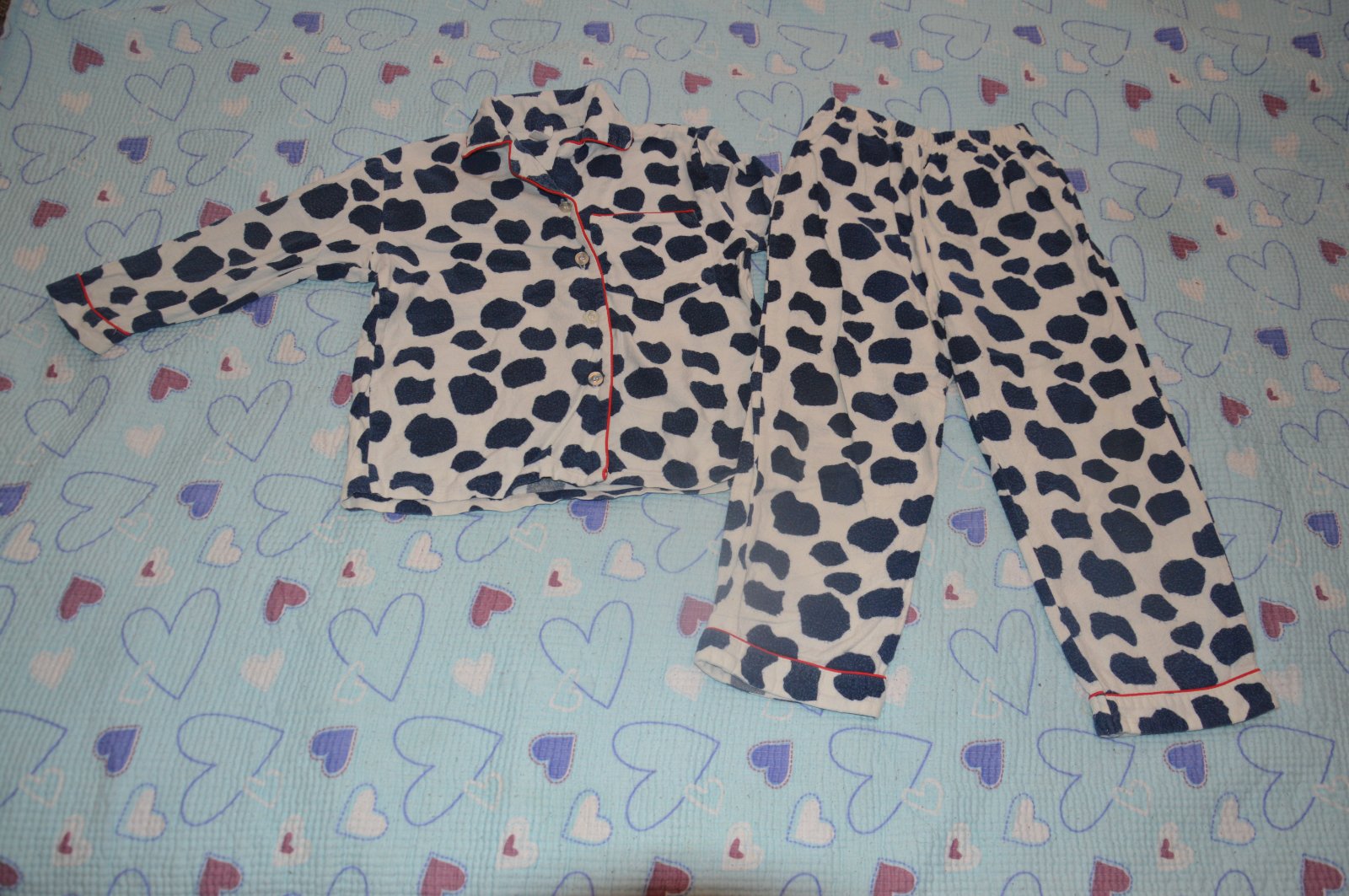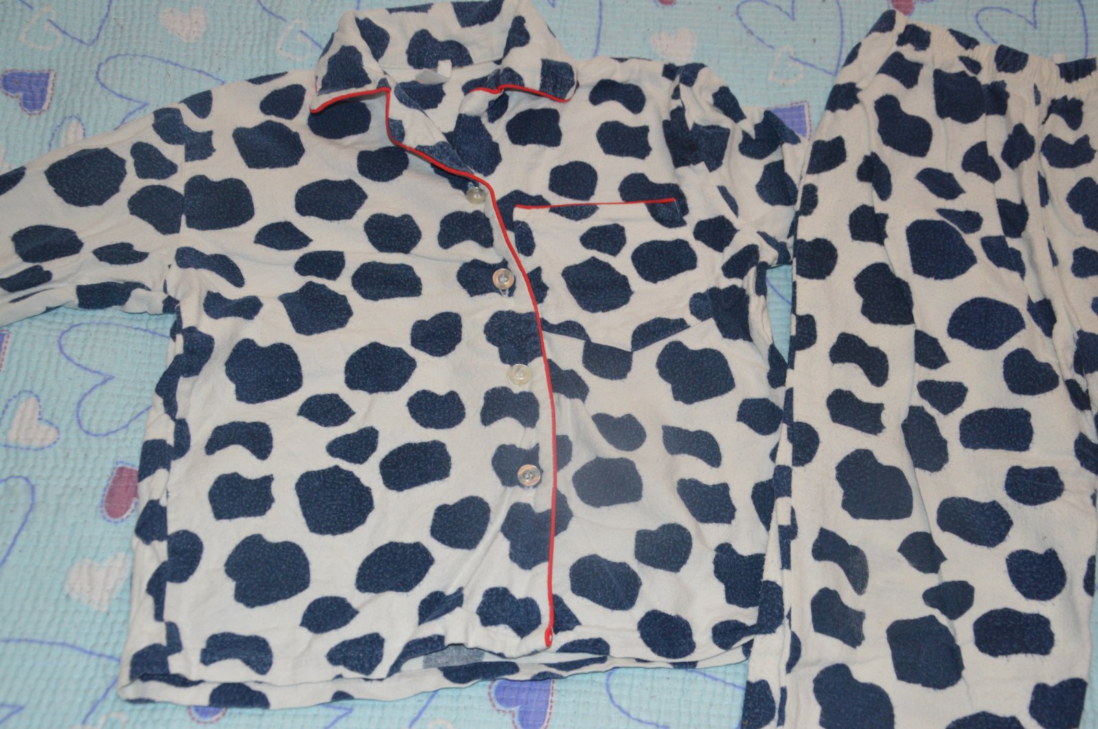 teplé flanelové pyžamo, cca vel. 110, spodek na kolenou ošoupaný, ale ne děravý, příjemné, teplé. Jinak běžné známky nošení.