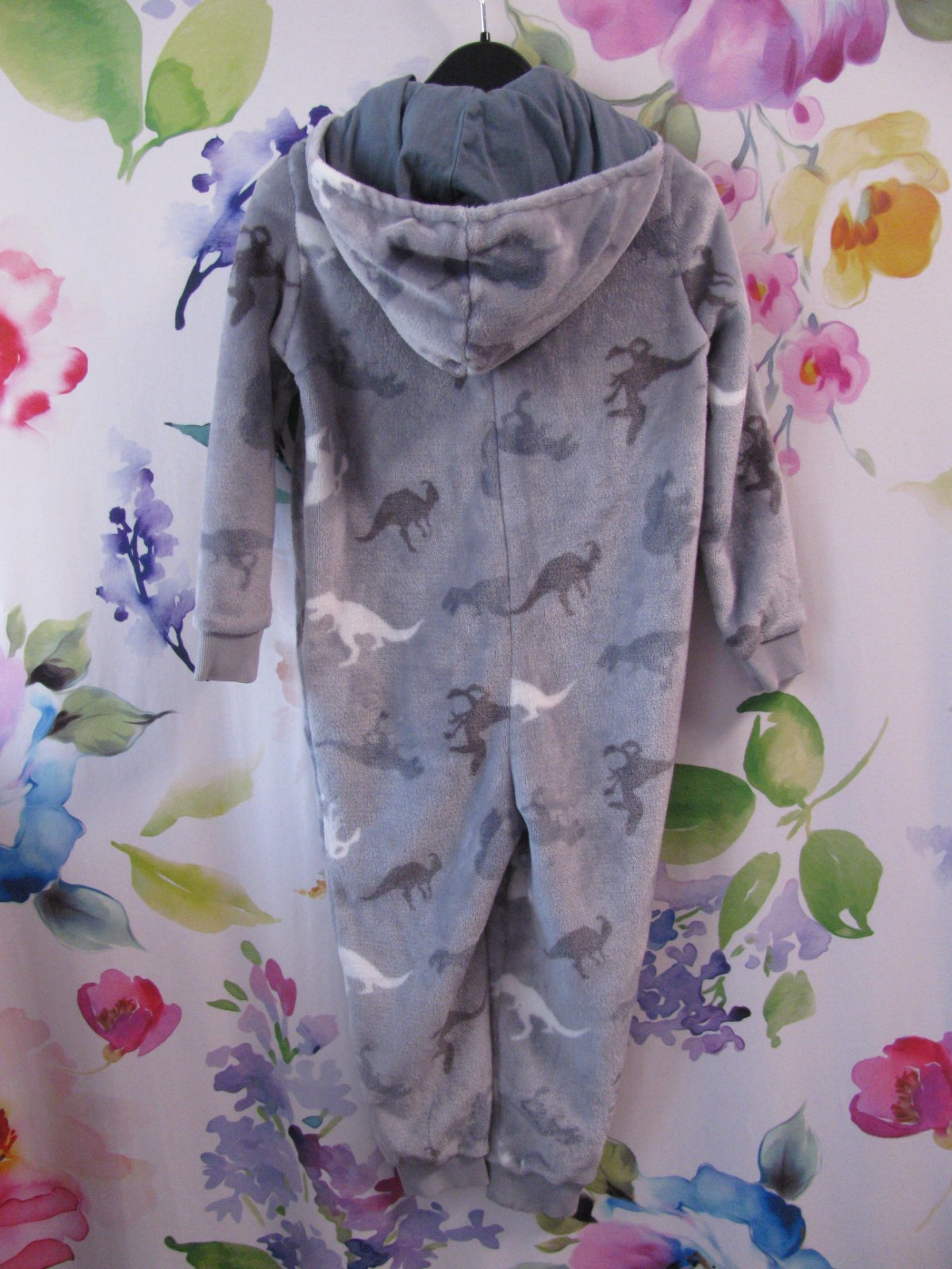 Luxusní, teplý, hebký, jemný spací overal, světle šedý s dinosaury, pružné lemy, dlouhý krytý zip, 100% polyester.