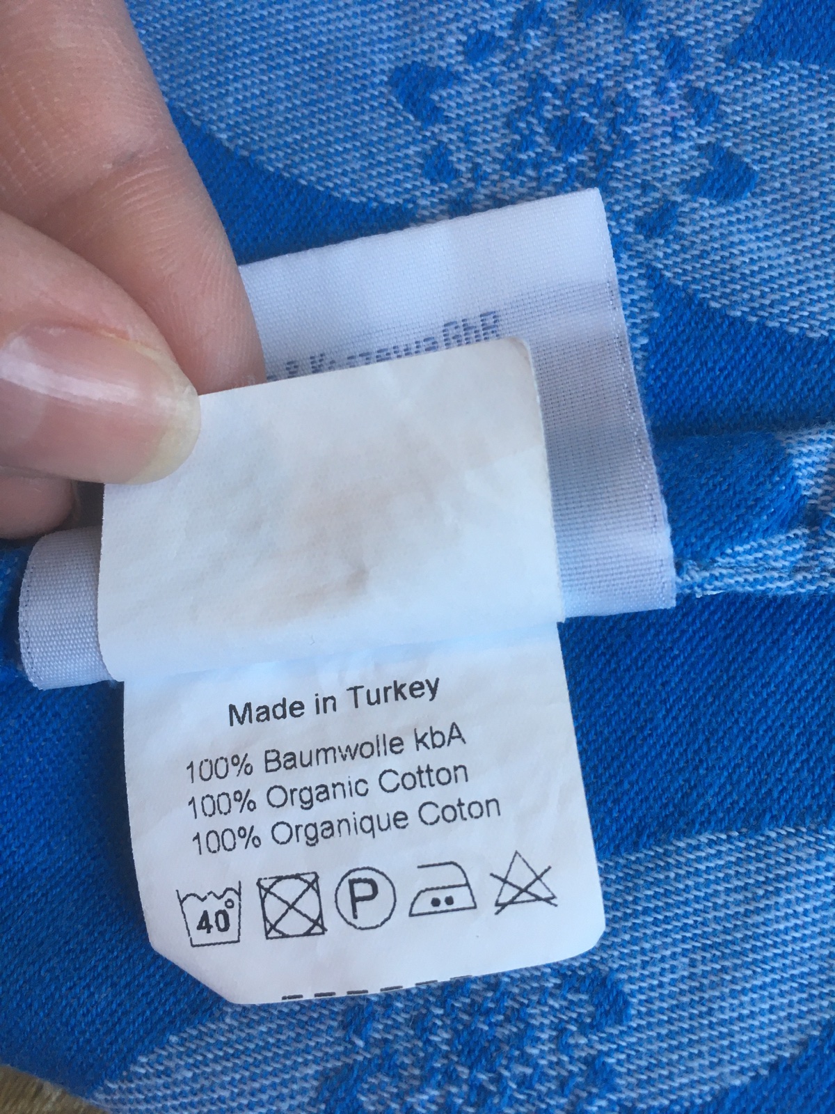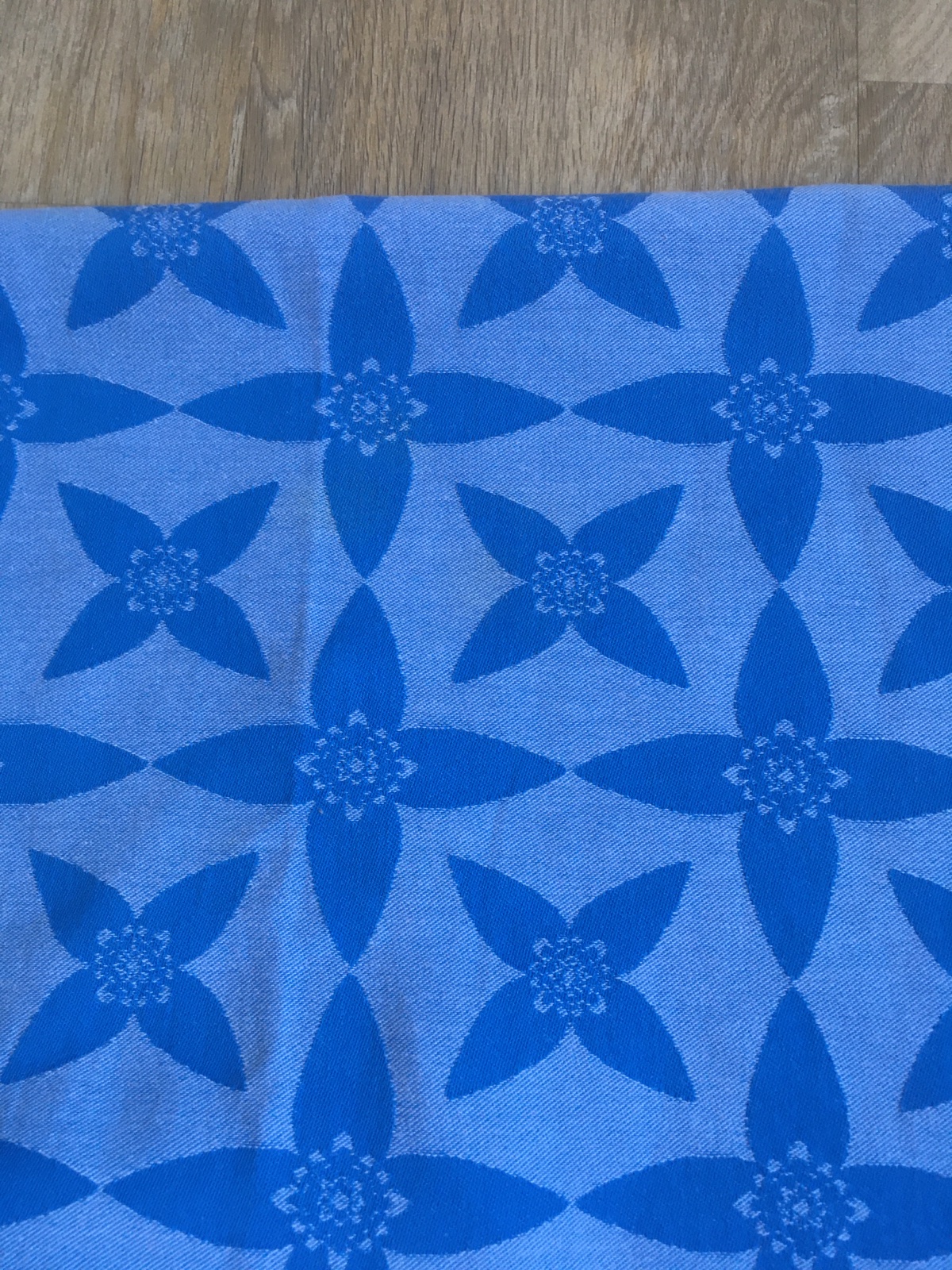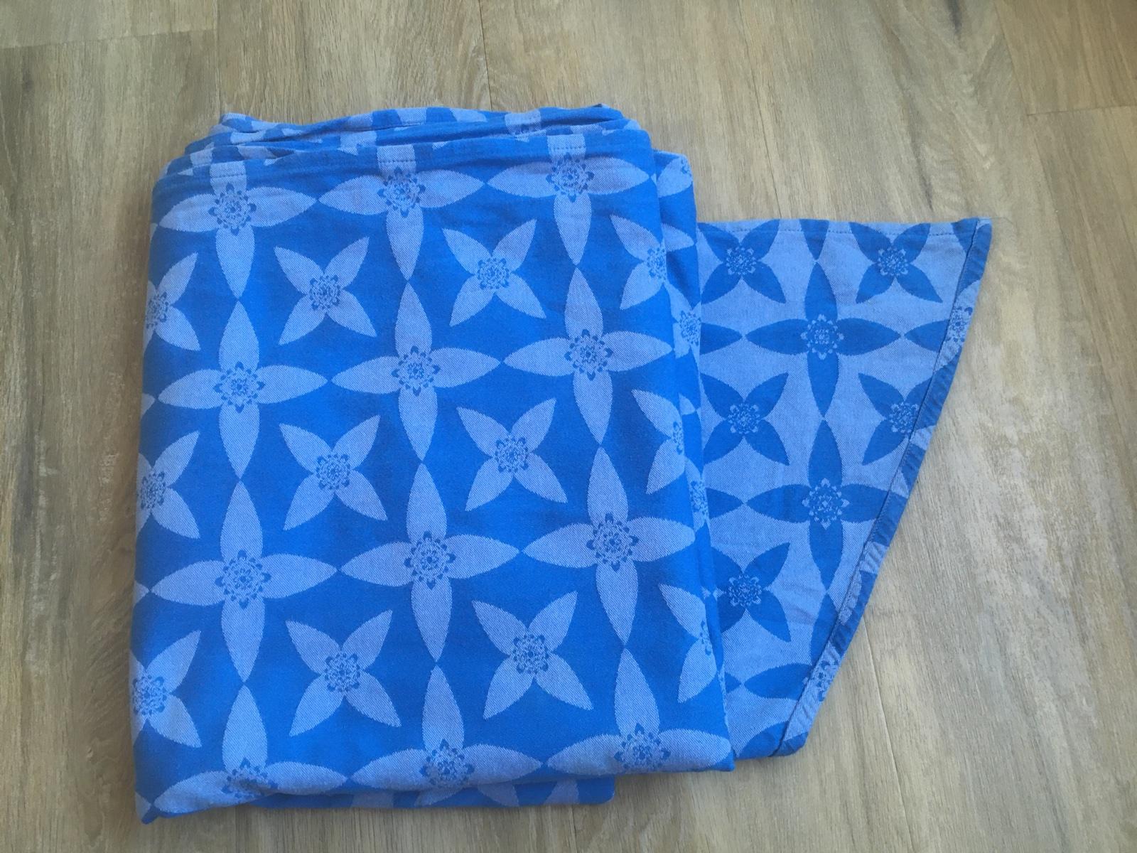 Krásný nosný šátek na větší děti. Koupila jsem jej z 2. ruky. Používala jsem na dceru od 8 kg. Šířka šátku je 69 cm. Praný šetrně v eko prostředku, přesto jsou na tmavší straně šátku droboučké žmol...
