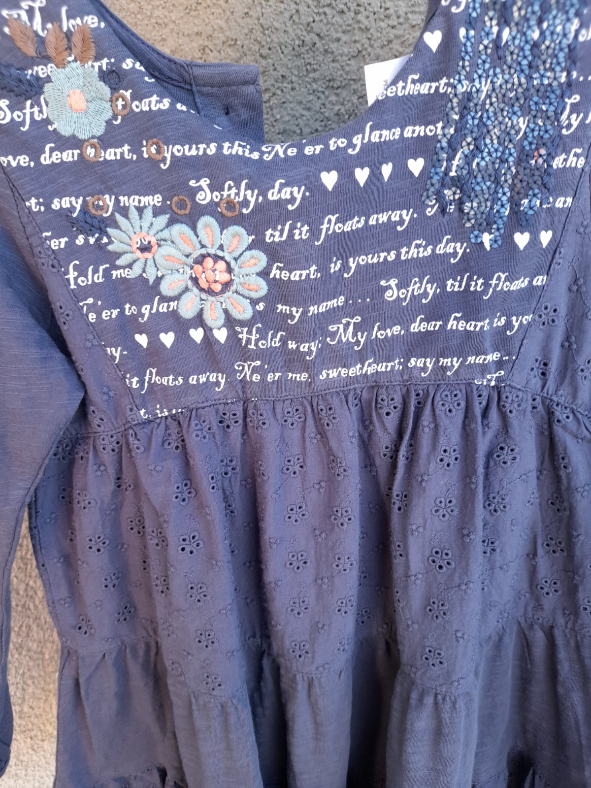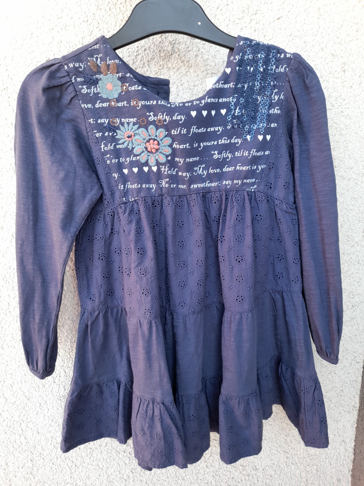 Nové zboží k prodeji Krásné, tmavě modré šatičky z velmi tenké džínoviny, s celo plošným potiskem, ve předu na druky, kapsičky, konce rukávů zap. na druky, 100% bavlna. Rozměry: dél.-57cm,,,hruď-2x...
