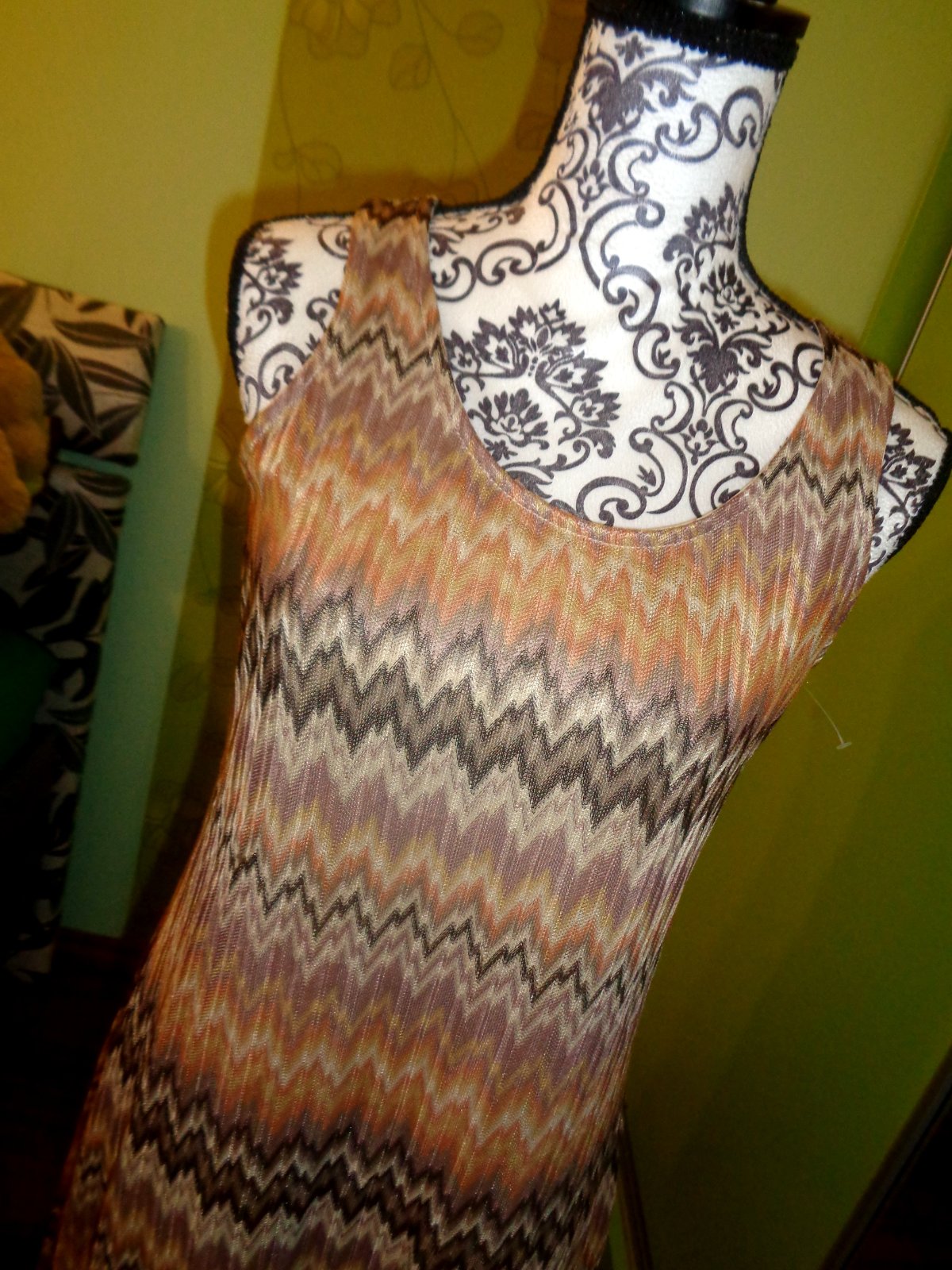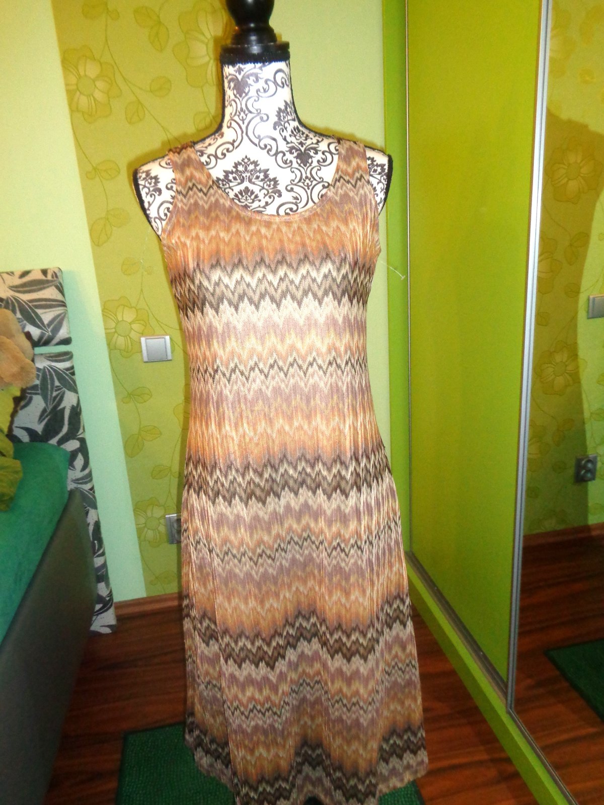 JAKO NOVÉ -NOŠENÍ NENÍ ZNÁT. VRCHNÍ VRSTVA POLOPRŮHLEDNÁ - JAKOBY ÚPLETOVINA - 100% PES. CELÉ ŠATY PODŠITÉ TĚLOVOU PODŠÍVKOU 100% PES. KRÁSNĚ BAREVNĚ SLADĚNÉ DO TEPLÝCH BAREV - HNĚDÁ, BÉŽOVÁ, ORNAŽOVÁ - DO ZLATA. JSOU KRÁSNÉ - MOC DOPORUČUJI. HODNĚ PRUŽÍ A PŘIZPŮSOBÍ SE