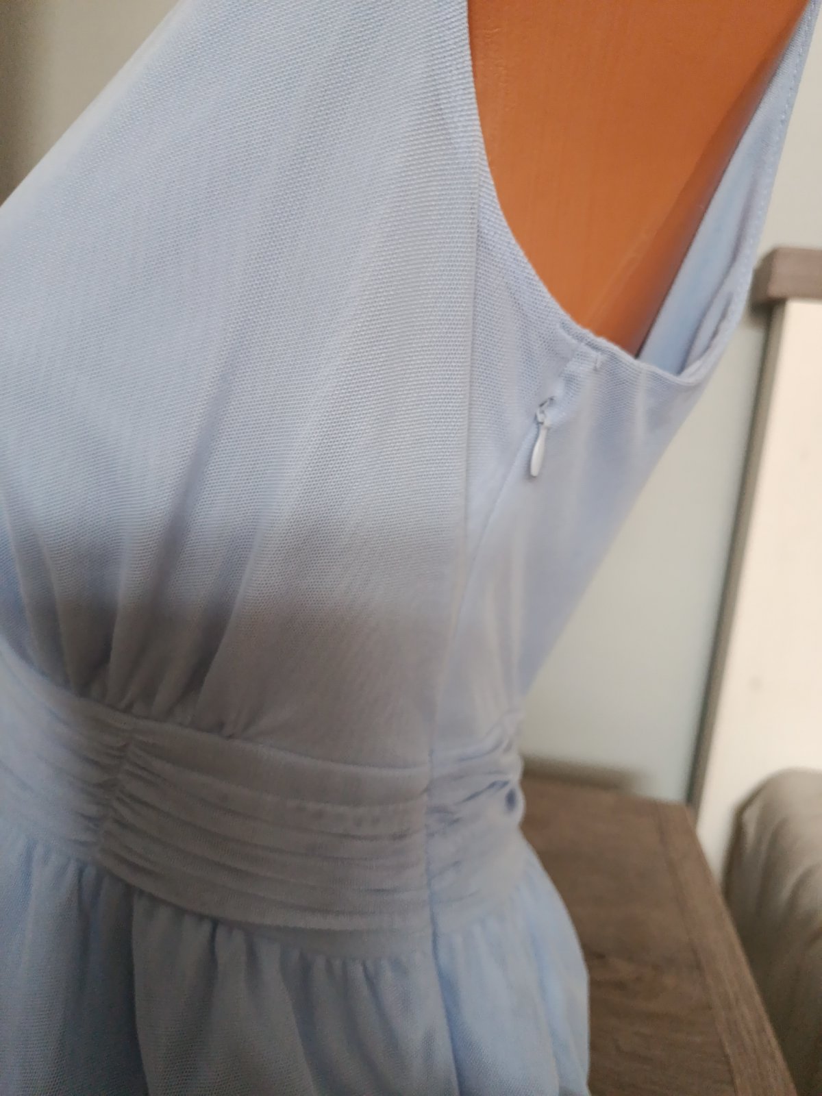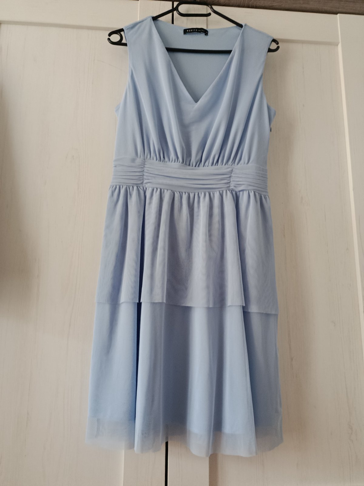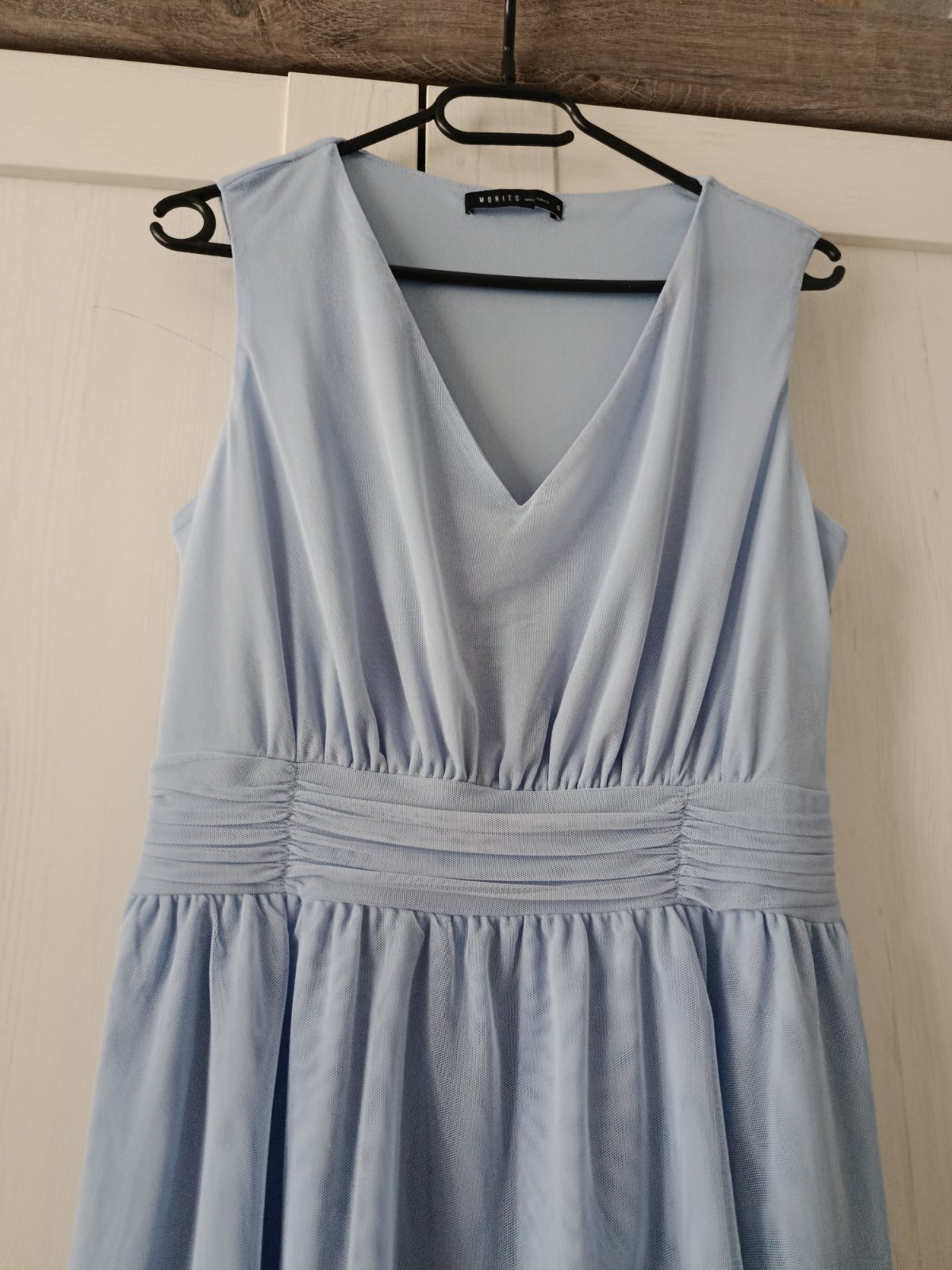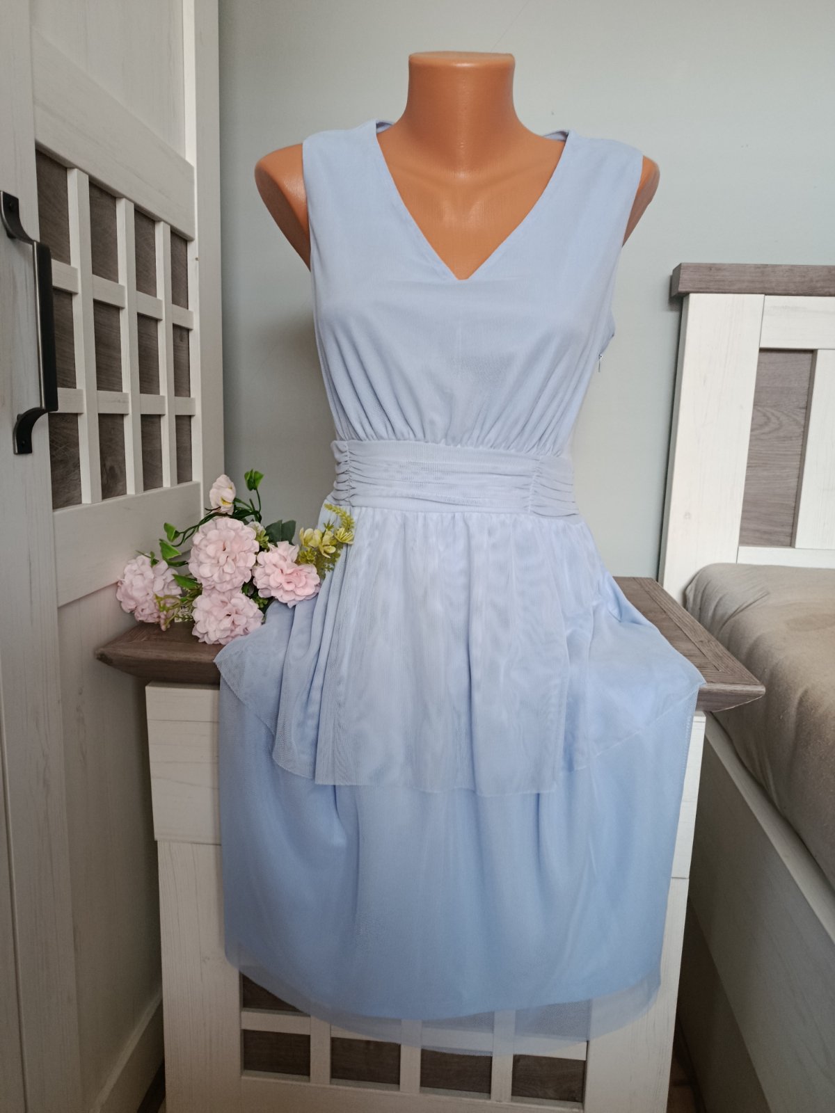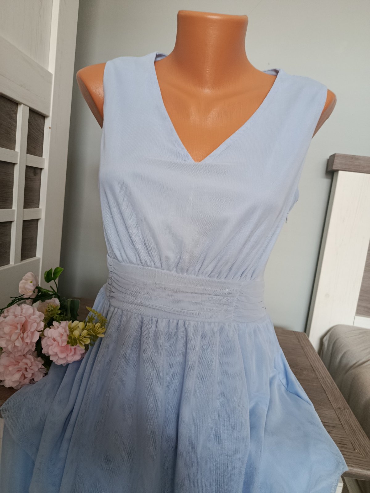 Pěkné letní bledě modré tylové šaty s podšívkou....Véčkový výstřih a na boku zip. Mírně pruží ...Na sukni jsou 2 volány....Šaty jsou v perfektním stavu. Míry : délka 90 cm, pas 2 x 36 cm a průramky 2 x 47 cm. Materiál : 94 % polyester a 6% elastanu.....Poštovné - balíkovna za 85 Kč nebo zásilkovnou za 90 Kč.