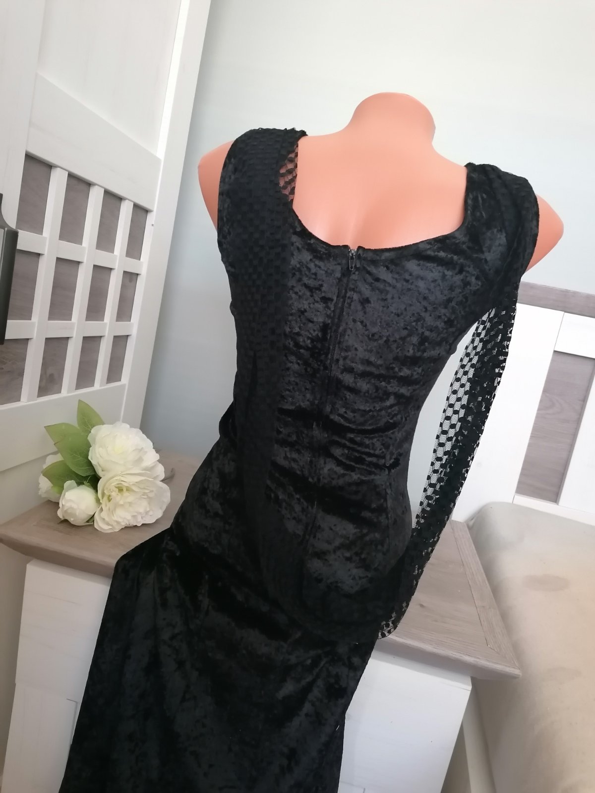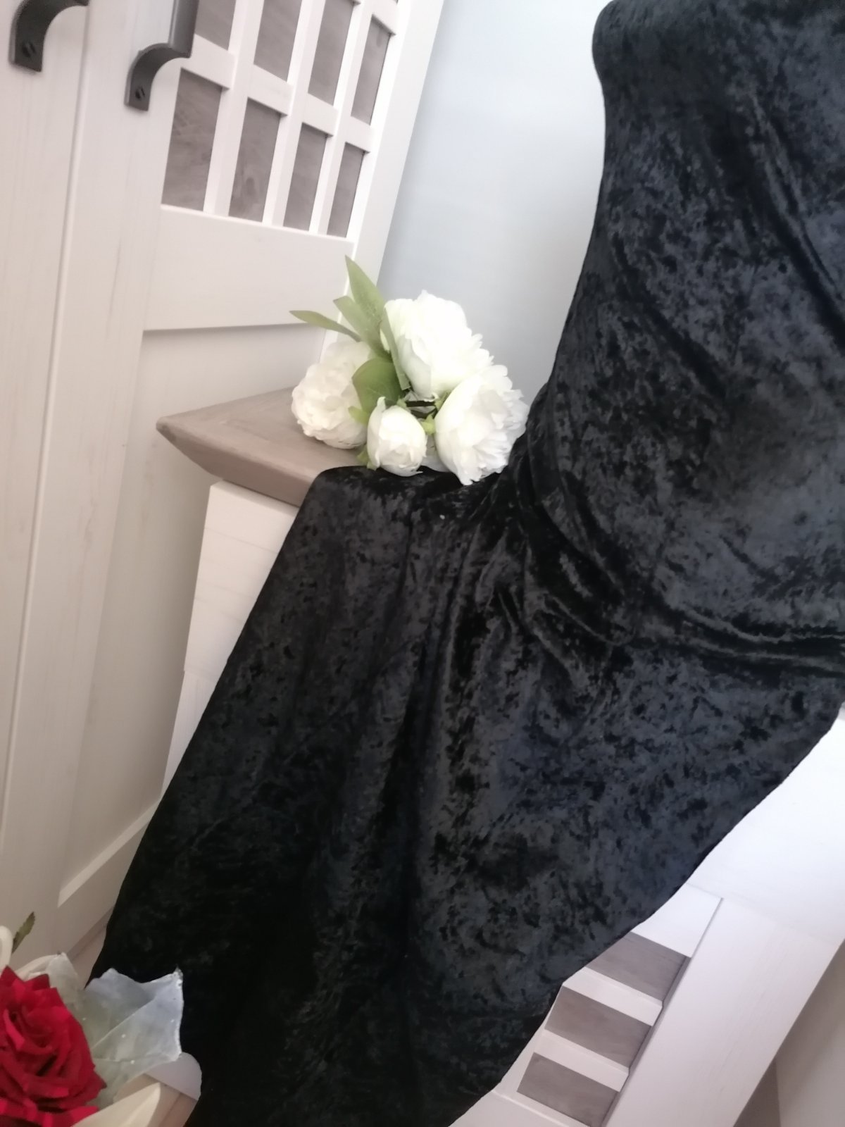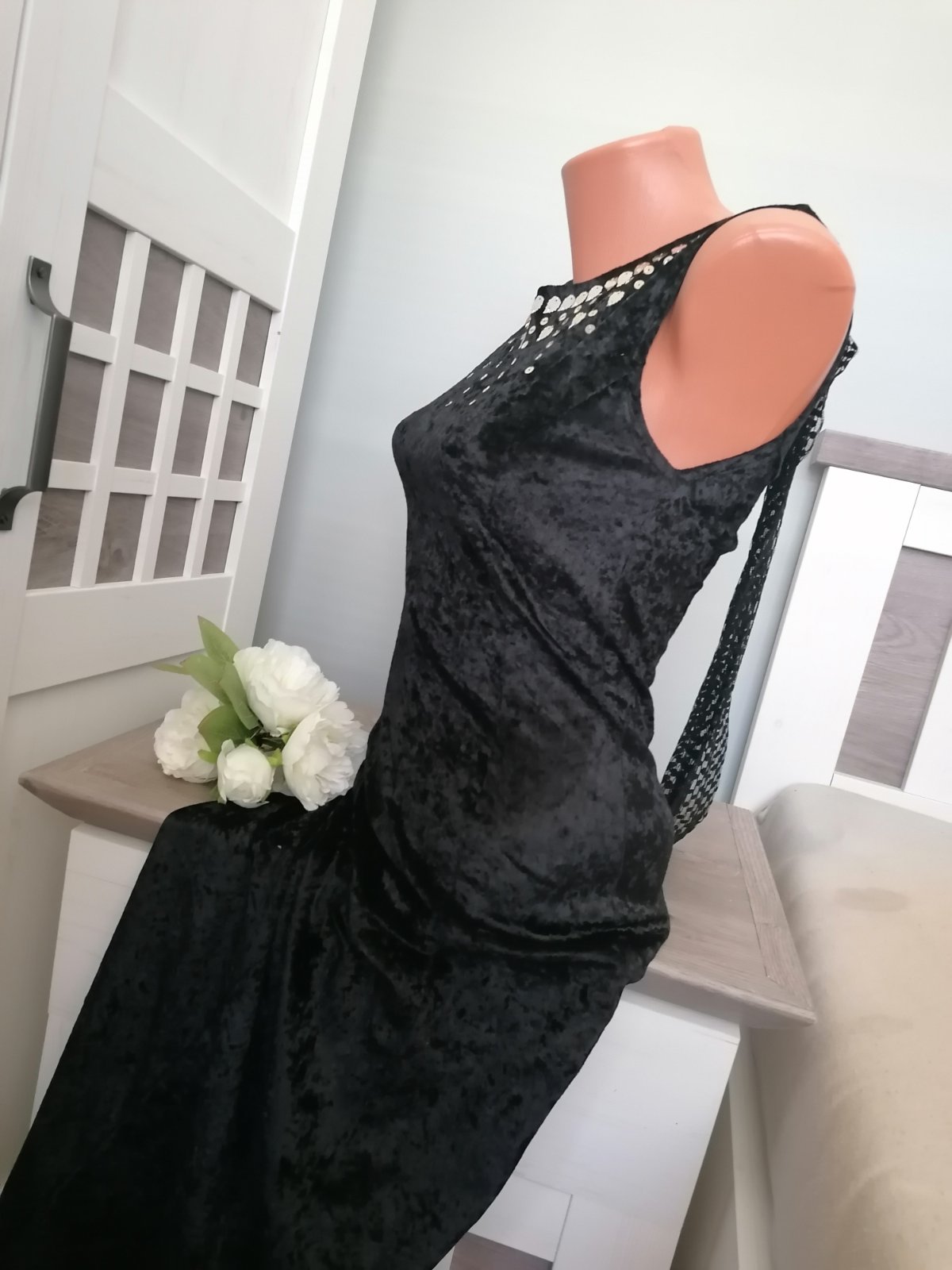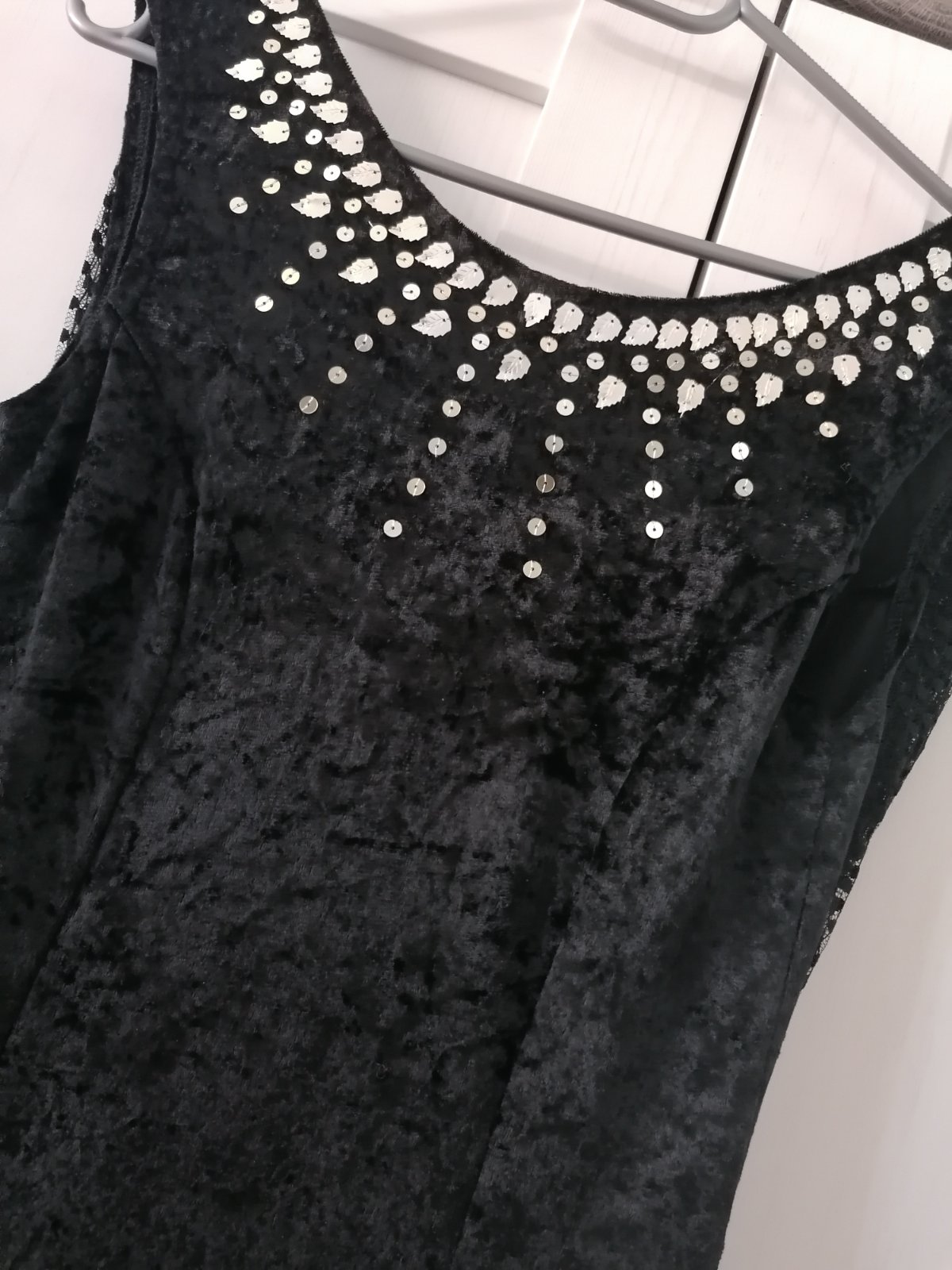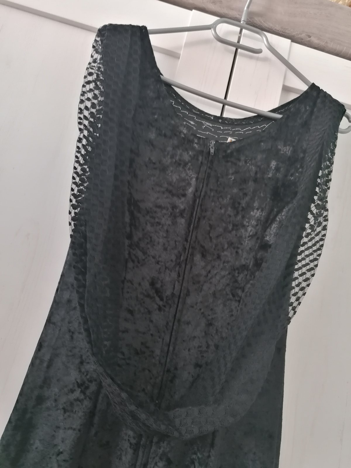 Společenské, plesové sametové šaty....Na předním díle našité ozdoby, vzadu šála z krajky....Je našitá na pevno :-) Šaty jsou elastické, dole rozšířené...Šaty měla dcera snad jen 2 x na sobě....Velmi dobrý stav. Materiál polyester a elastan.....Míry : délka 129 cm, pas 2 x 33 cm - 2 x 40 cm, průramky 2 x 37 cm - 2 x 47 cm. Poštovné - balíkovna za 85 Kč nebo zásilkovnou za 90 Kč.