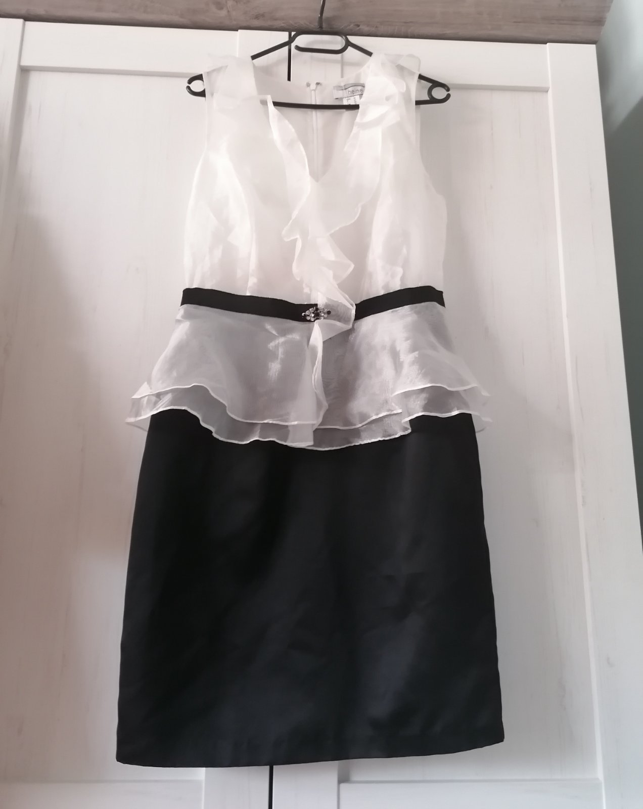 Pěkné společenské peplum šaty....Ozdobná brož na pásku....Véčkový sexy výstřih. Vzadu jsou na zip. Horní díl bílo - perleťový. Sukně má podšívku a vzadu rozparek....Šaty jsou v perfektním stavu, bez vad. Míry : délka 95 cm, pas 2 x 40 cm a průramky 2 x 48 cm. Materiál : 100 % polyester. Poštovné - balíkovna za 85 Kč nebo zásilkovnou za 90 Kč.