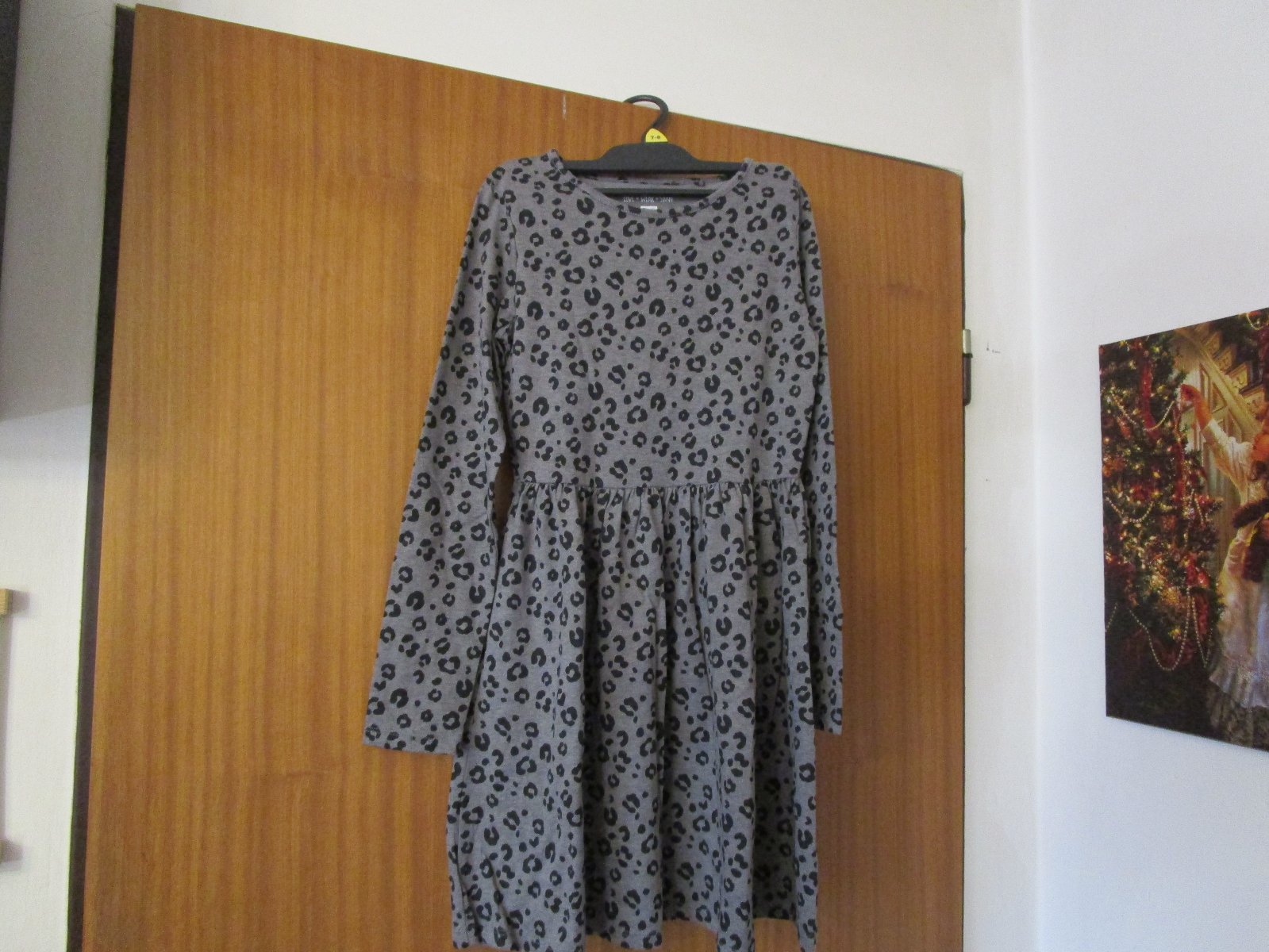 Nové, velmi pěkné, tm. šedé bavl. elast. šaty s gepardím potiskem, dl. rukáv, vel. 140 (9-10 let), délka odshora dolů 70 cm, cena jen 99 Kč, zn. F&F.