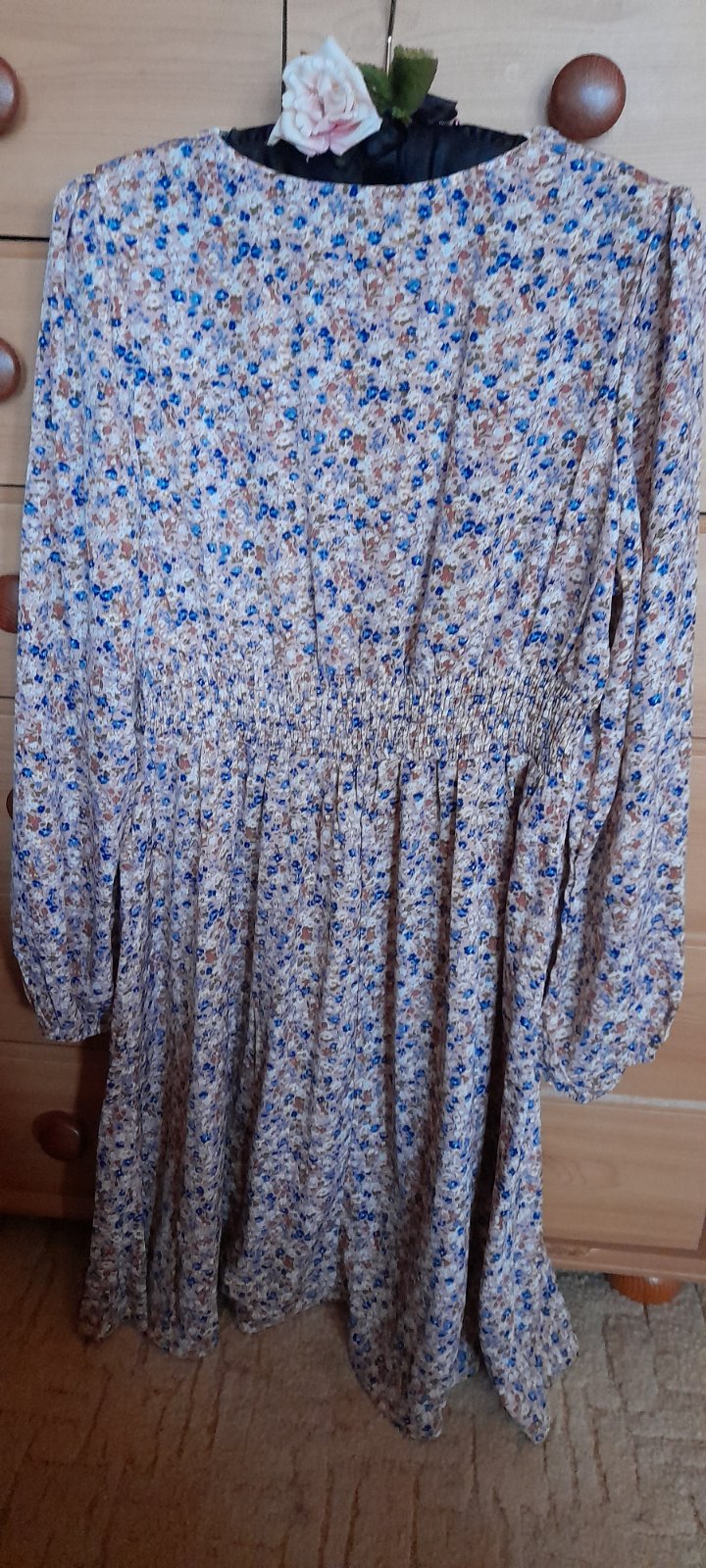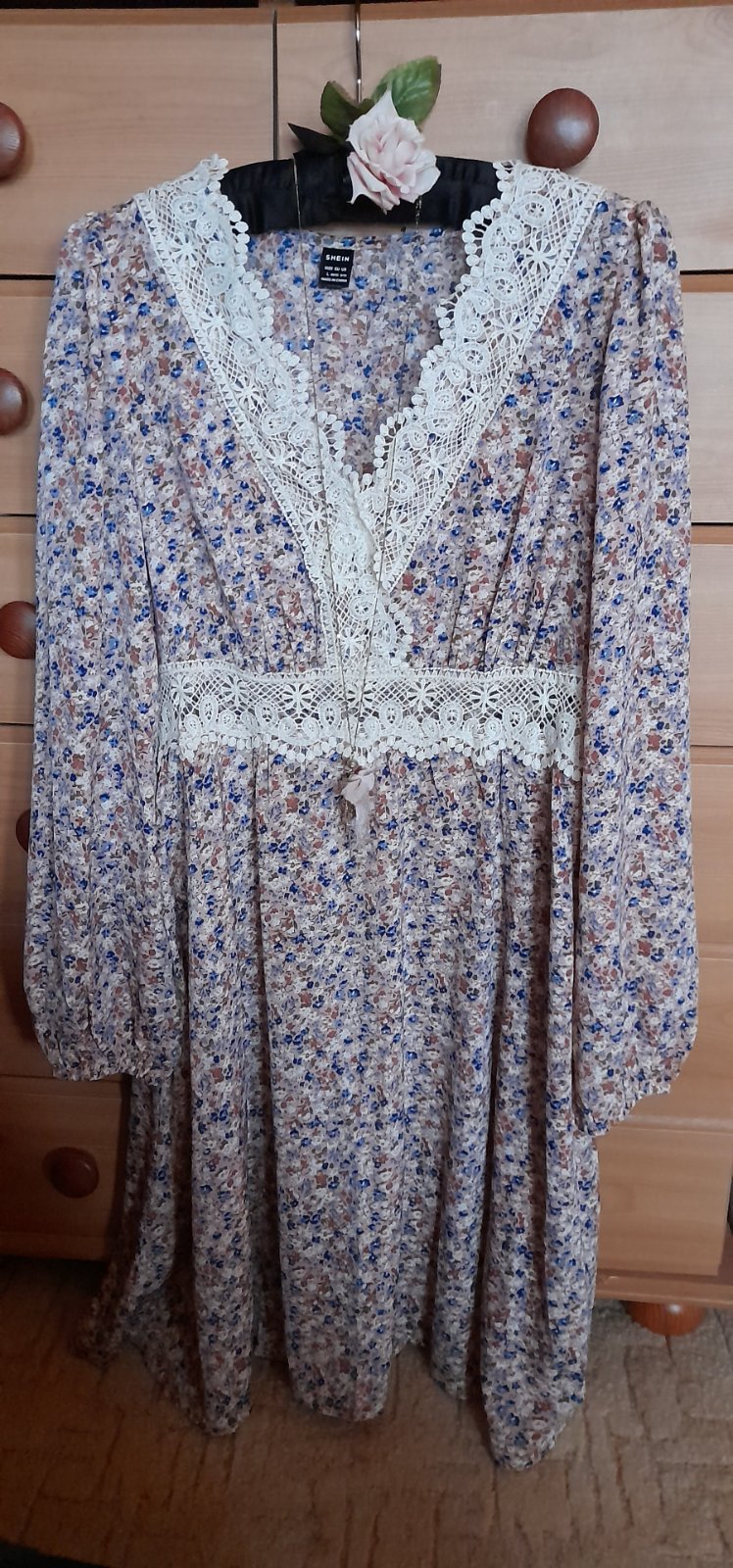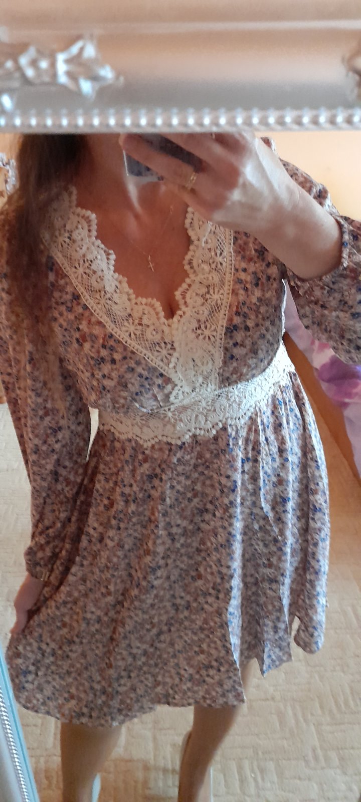 ✒ popis: dl. rukávy zakončené do gumy, v zadní části pasu gumičky, dekolt a pas zdobený krajkou, decentní kvítkový vzor
