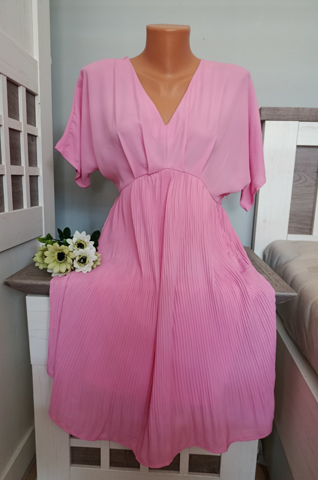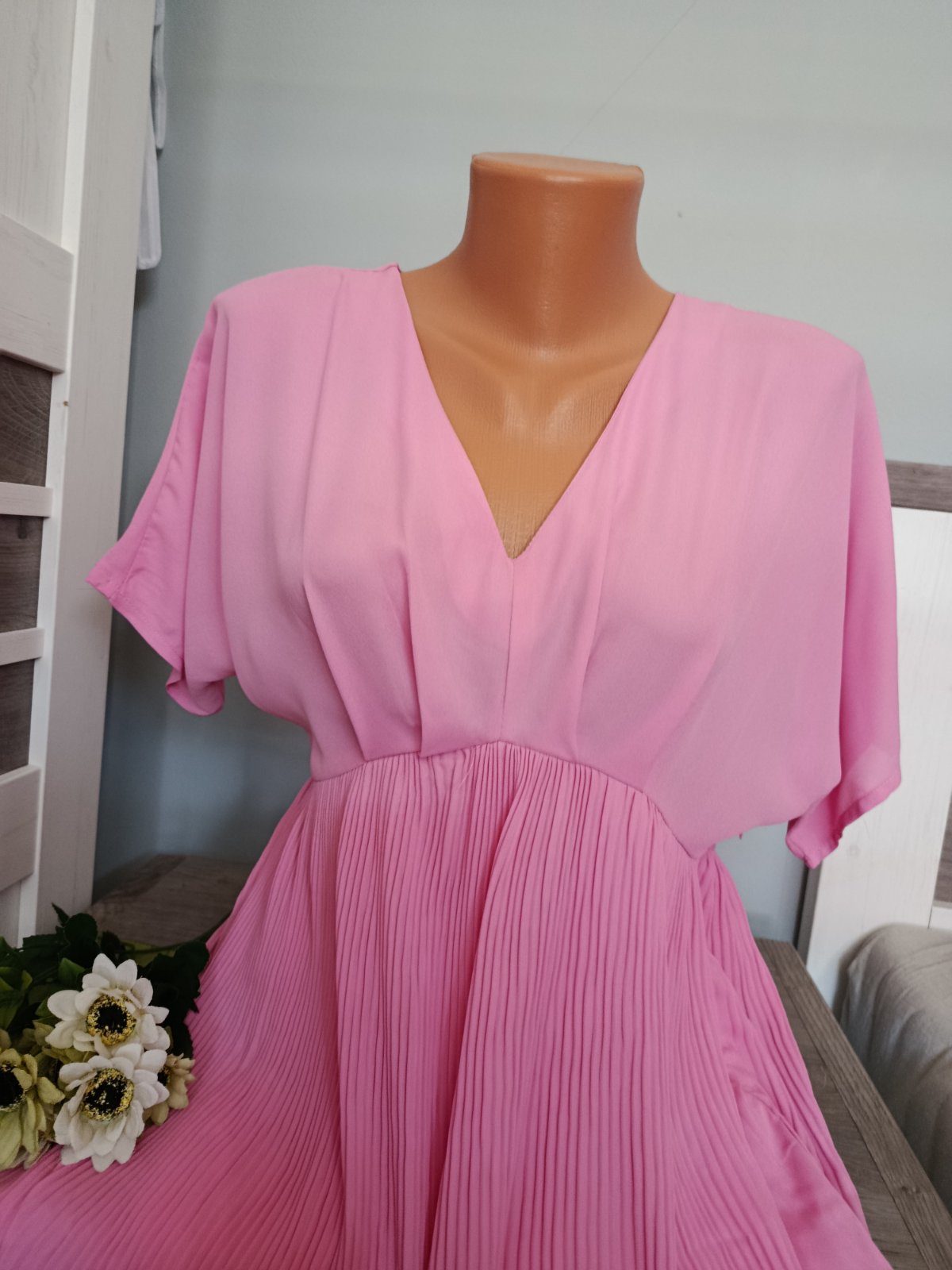 Pěkné lehké letní šaty s plisovanou sukní. Šaty jsou ve velmi dobrém stavu. Mají našitou spodničku, aby neprosvítaly :-) Véčkový výstřih, na boku mají zip. Míry : délka 89 cm, pas 2 x 38 cm, průramky volné. Materiál : polyester. Poštovné - balíkovna za 85 Kč nebo zásilkovnou za 90 Kč.
