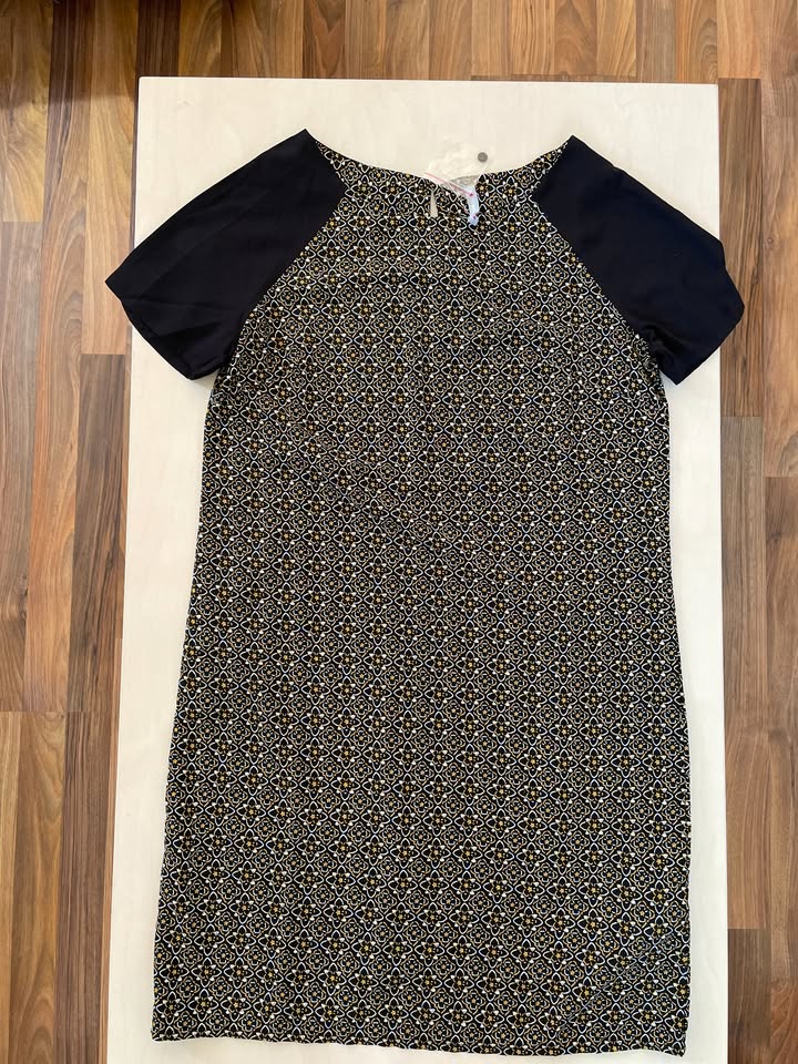 1607. nabízím k prodeji tyto nové šaty se vzorkem, vel D34/XS, GB8/S, ale myslím i S/M, Blancheporte. Volný rovný střih, jemný jako silonový materiál 100% polyester. Nepruží. Na tělo žlutý a bílý vzorek na černém základu, rukávy černé. Zapínání na knoflíček za krkem - náhradní v sáčku na štítku, který se díky sáčku uvolnil - lze odstranit nebo přišít. Nové, bez vad, krásné