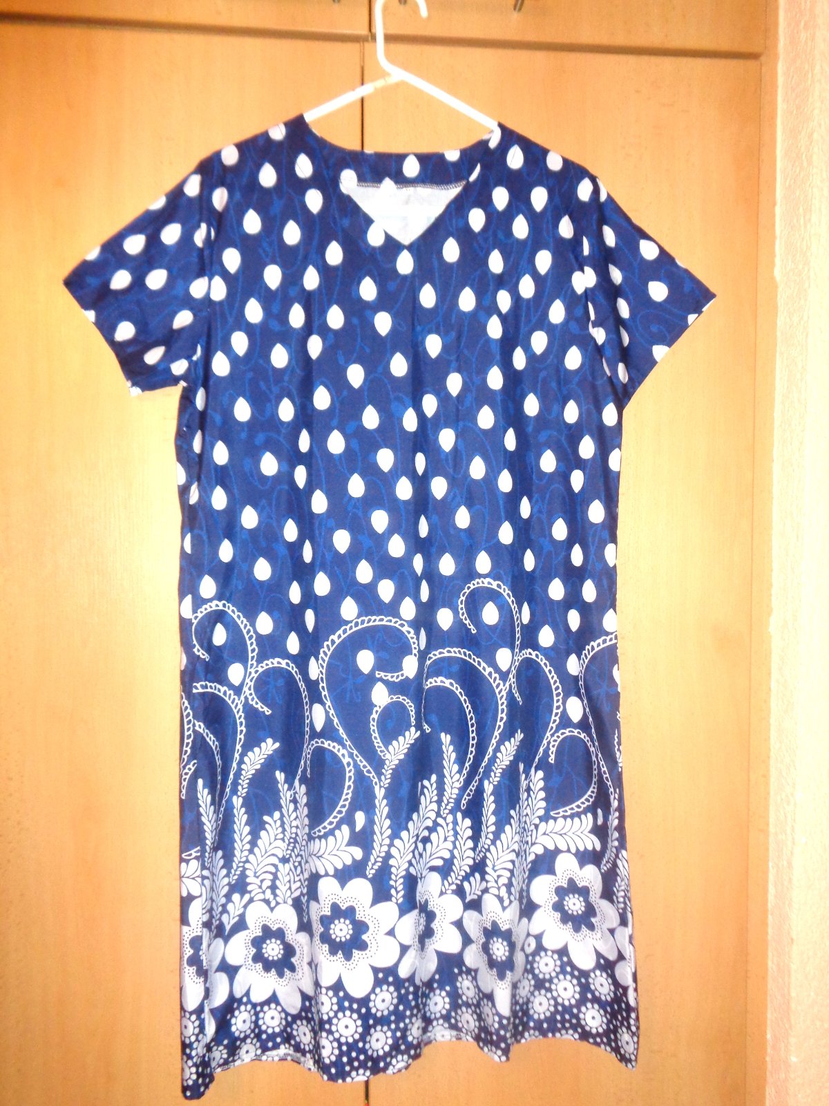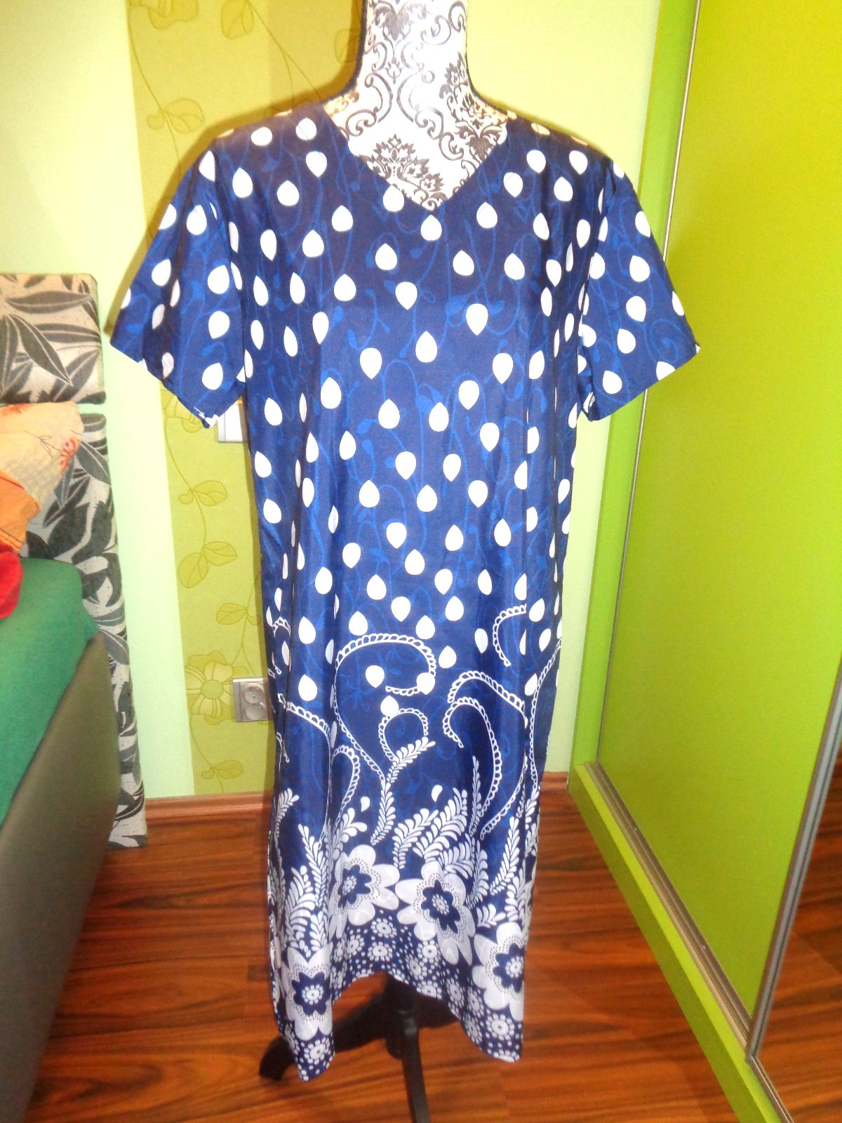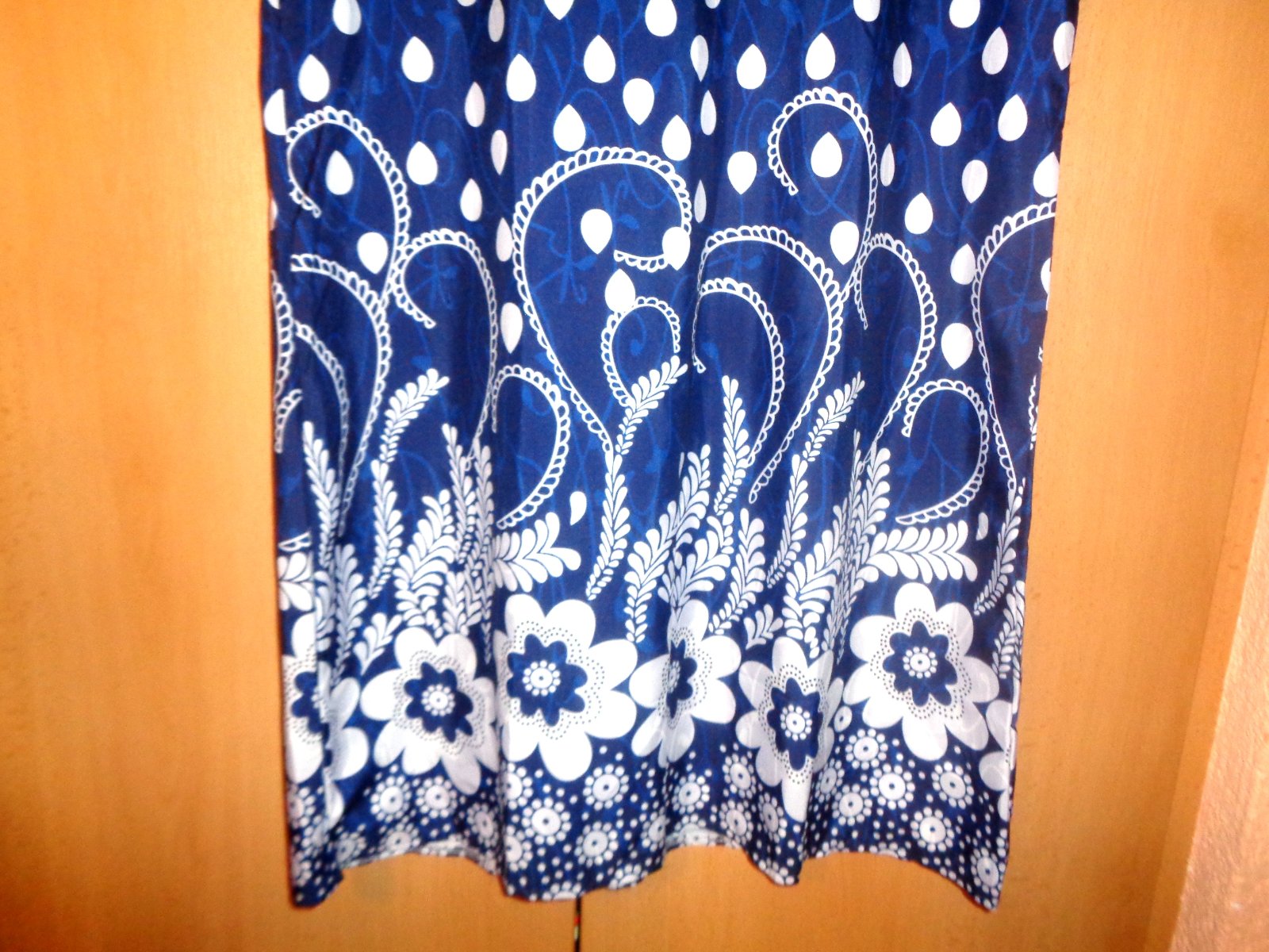 NOVÉ - JEN BEZ CEDULKY. 95% PES A 5% SPANDEX - CHLADIVÝ A VZDUŠNÝ MATERIÁL. HODNĚ TMAVOMODRÁ BARVA - BÍLÉ KAPIČKY A KVĚTY.