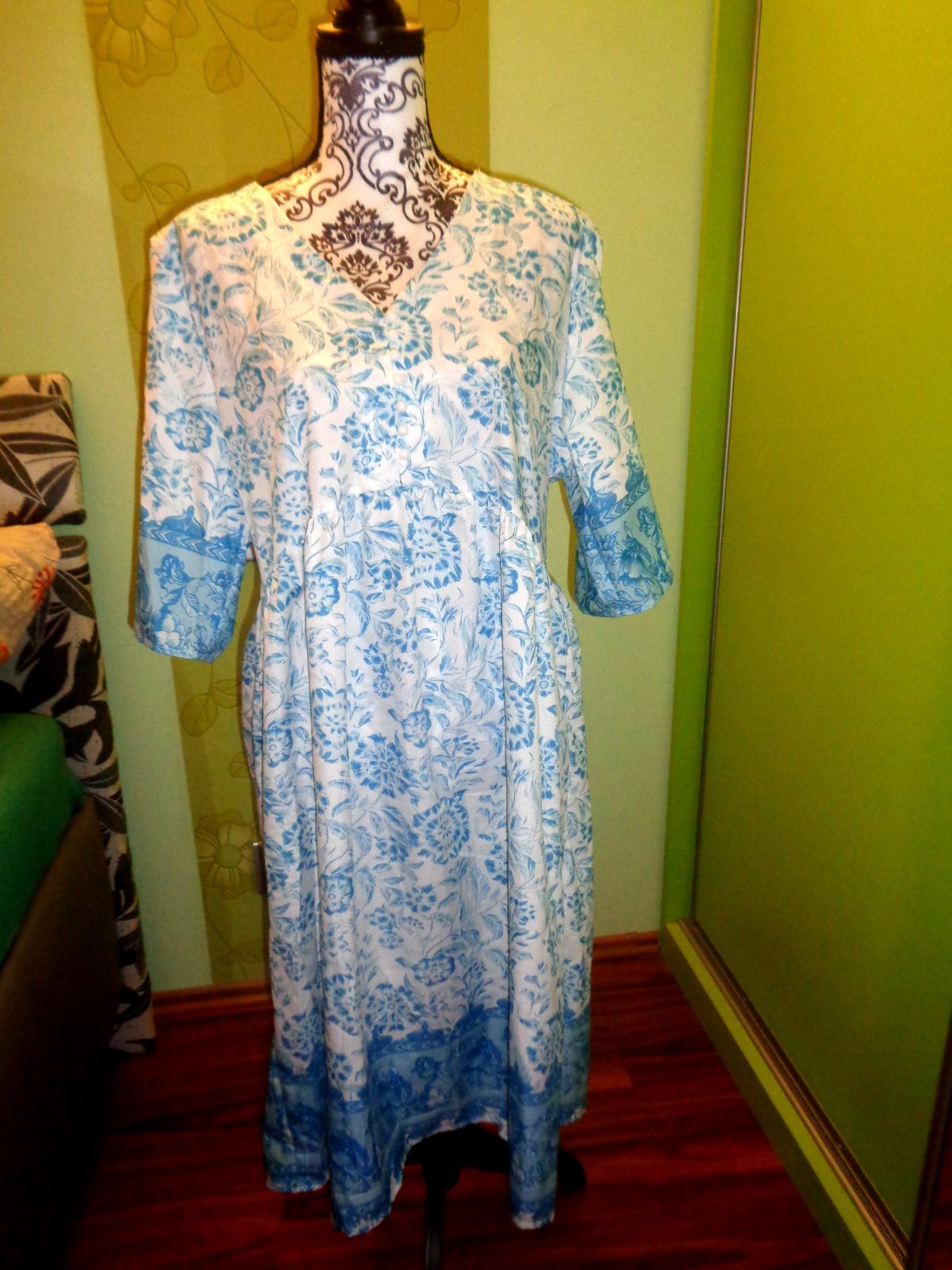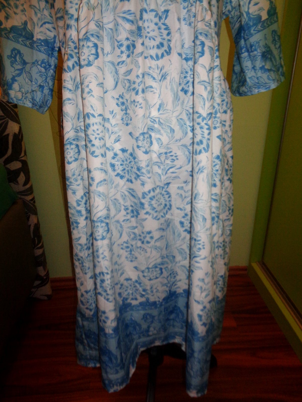 JAKO NOVÉ -NOŠENÍ NENÍ ZNÁT. BÍLÁ BARVA - TYRKYSOVÉ KVĚTY. 100% PES - CHLADIVÝ A PŘÍJEMNÝ MATERIÁL. PŘEDNÍ SEDÝLKO NA KNOFLÍČKY. DOPORUČUJI - PĚKNÉ.