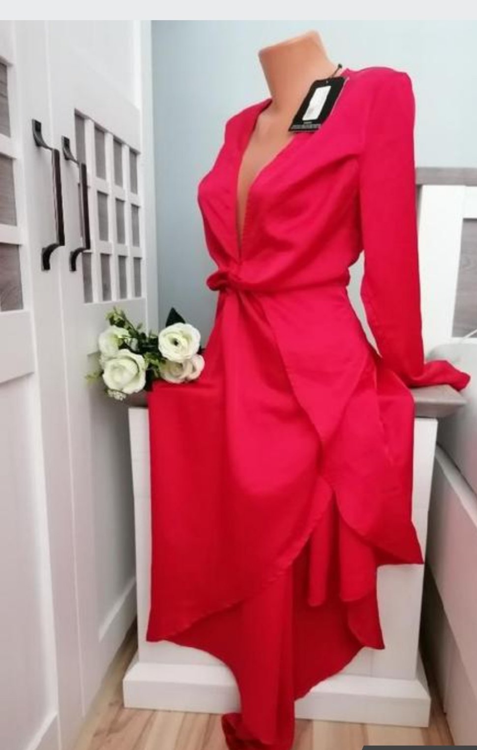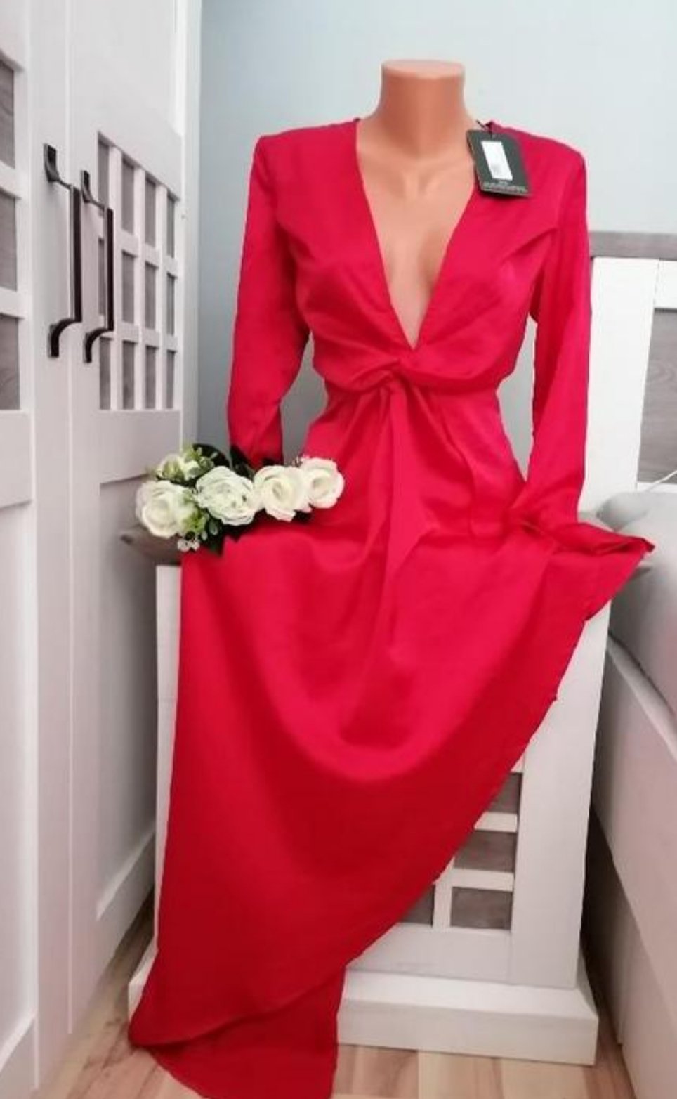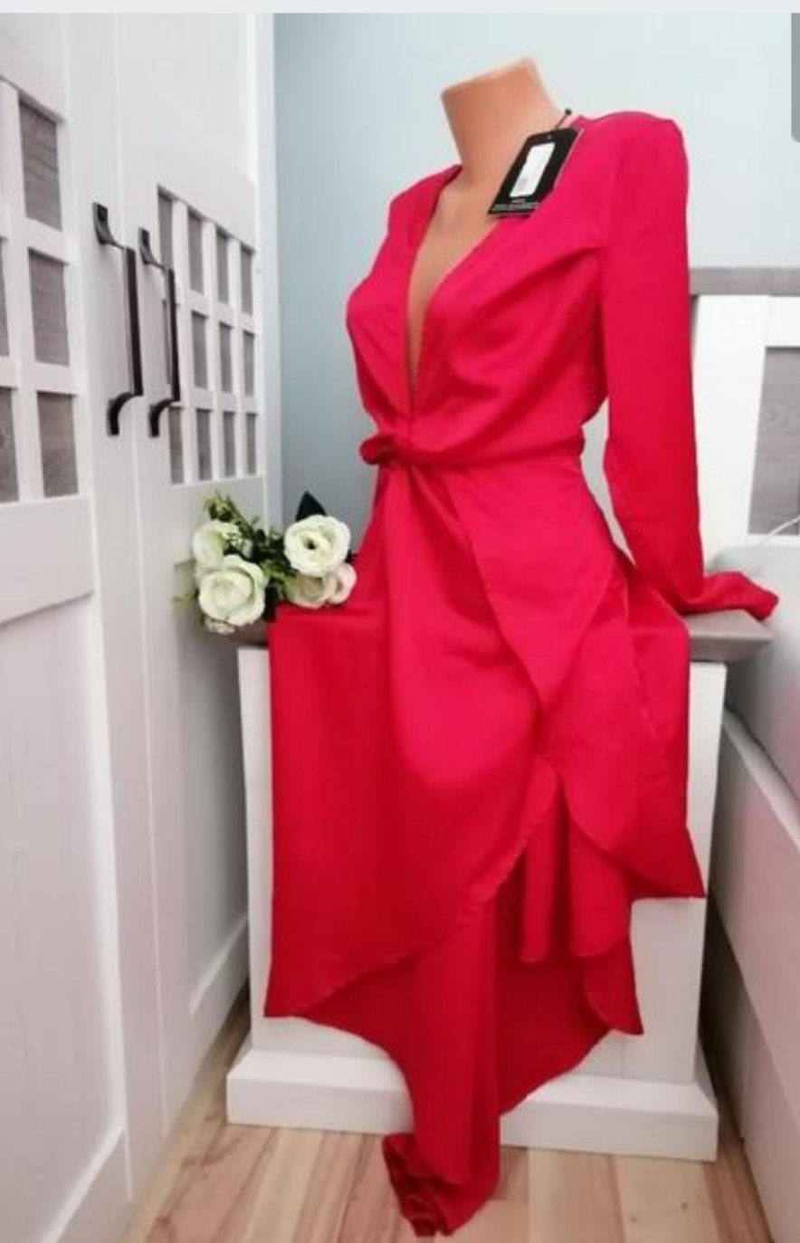 Krásné společenské šaty....Hluboký výstřih, pod prsy nabírané....Na pravém boku mají zip pro pohodlnější oblečení....Na pravé straně jsou kratší, delší strana je mě témeř ke kotníkům. Měřím 162 cm...Jsou nové, pouze odzkoušené....Krásný kousek do společnosti. Míry : délka - kratší strana cca 86 cm, delší strana ca 150 cm, pas 2 x 37 cm, průramky 2 x 37 cm - 2 x 49 cm, délka rukávů od krku je 73 cm. Složení: 100 % polyester. Poštovné - balíkovna 85 Kč, nebo zásilkovna za 90 Kč.