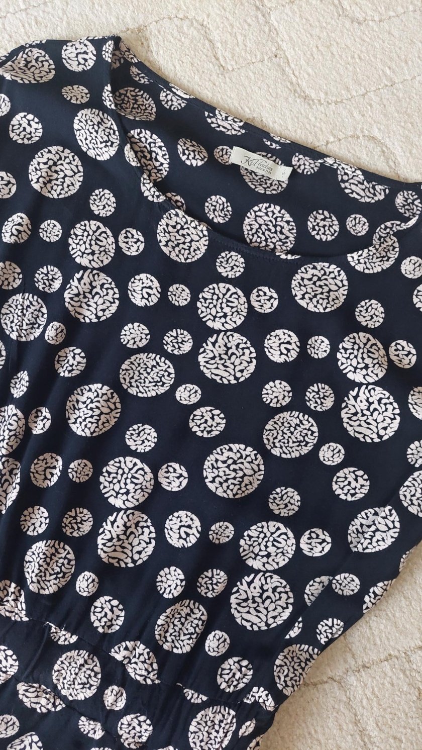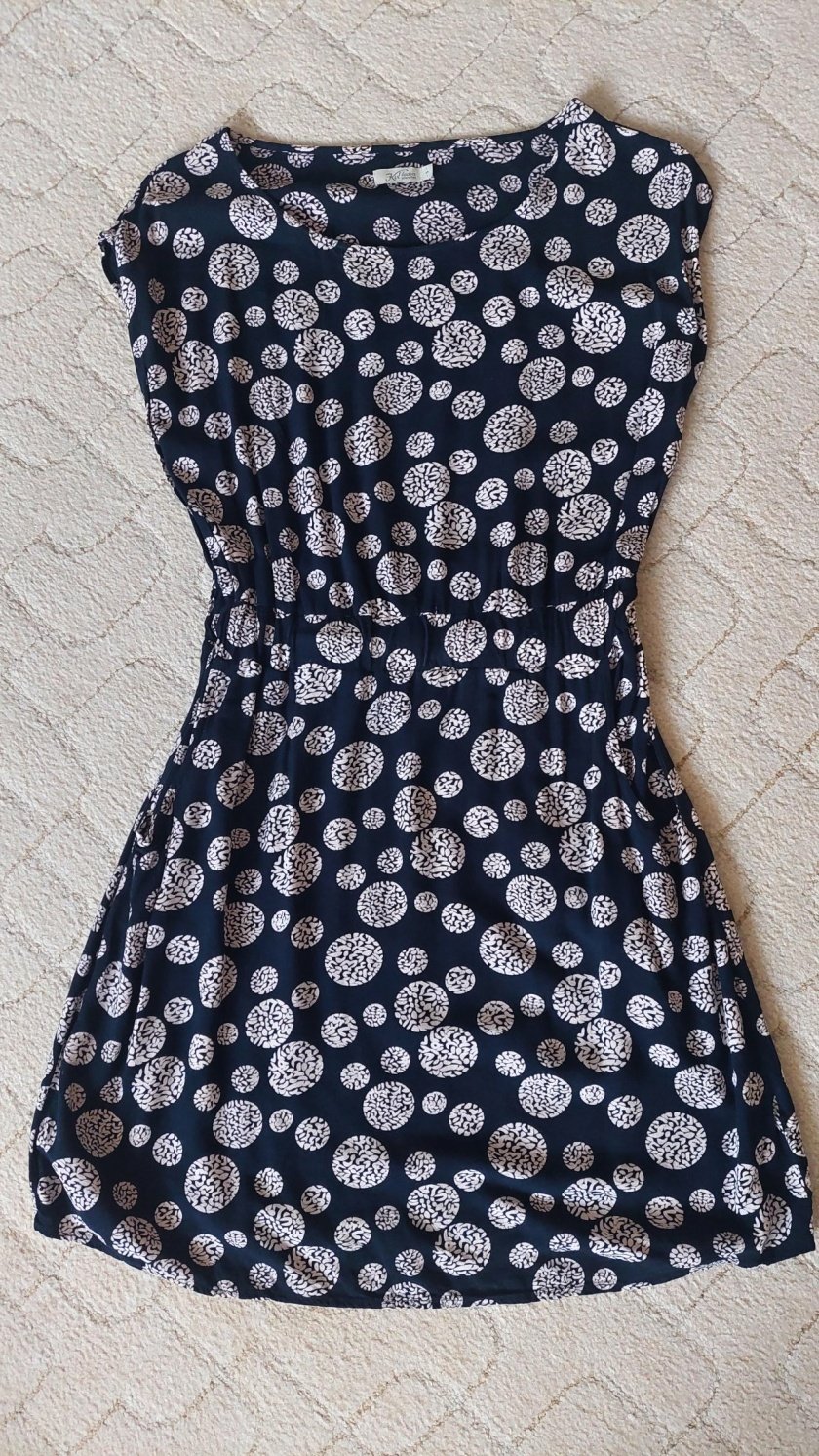 příjemné splývavé černé šaty s béžovým potiskem, bez vad, jako nové, v pase guma, postranní skryté kapsy, materiál: 100% viskóza, délka 91 cm, šířka v pase v klidu 33 cm, Zásilkovna 89 Kč