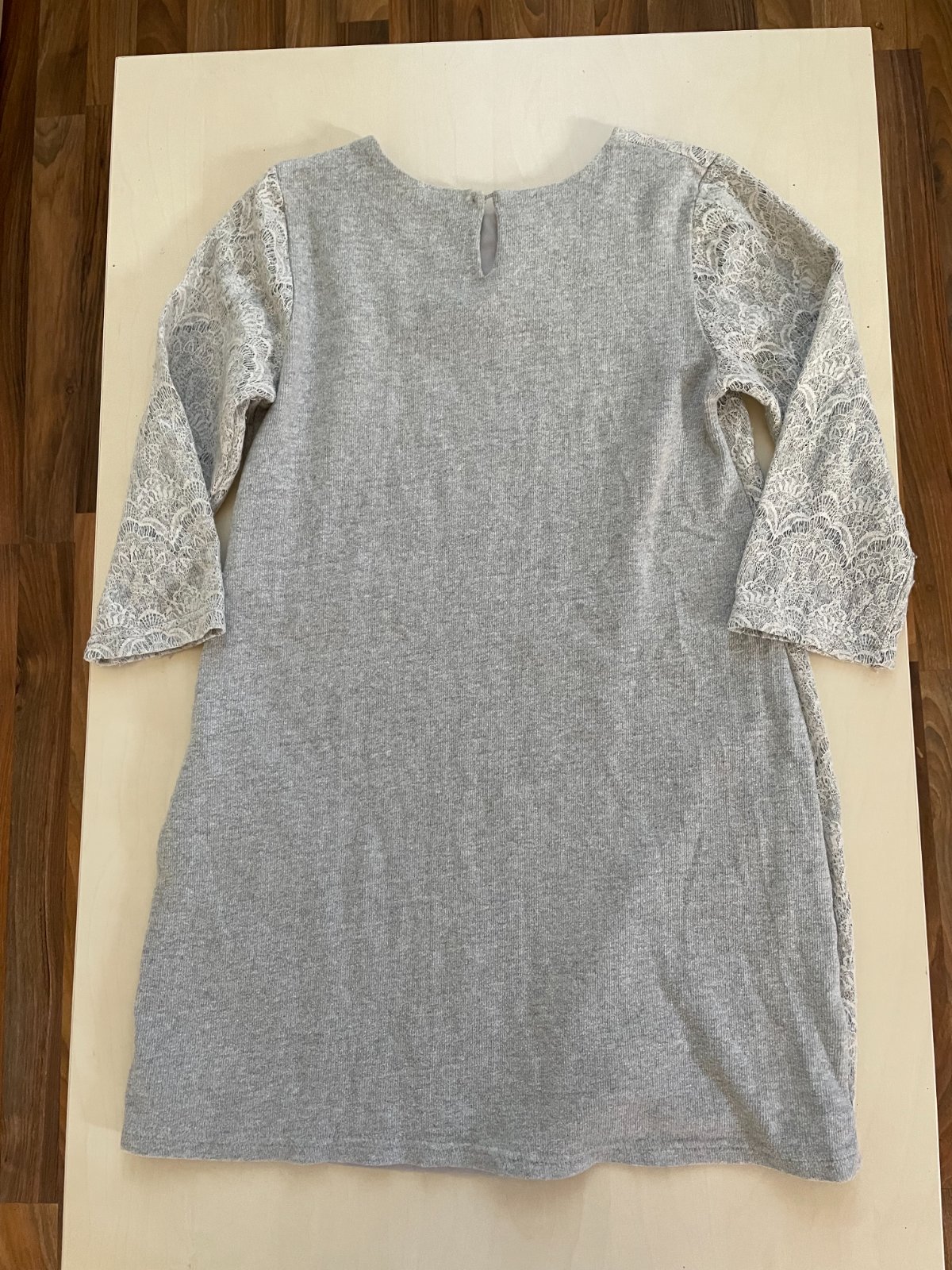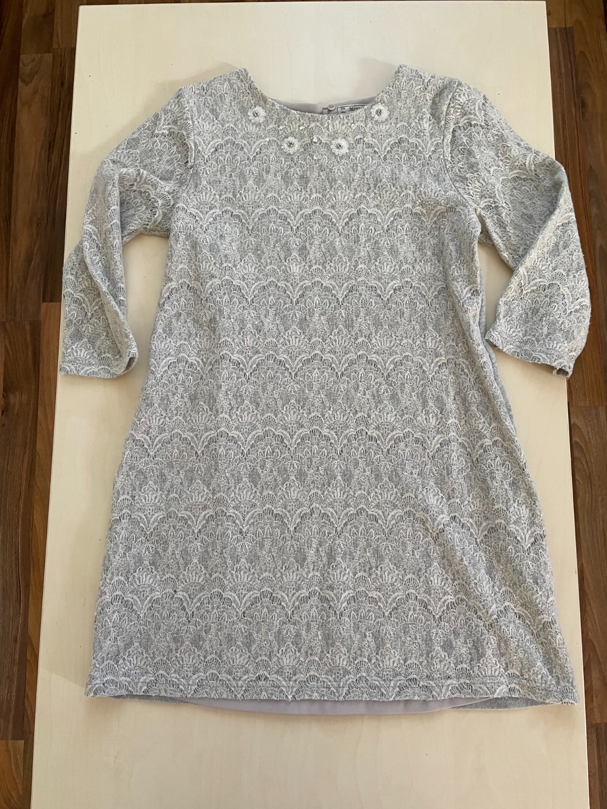 hol. nabízím k prodjei tyto svetrové šedé šaty, vel asi dětská 162, ale myslím možno i XS, jsou krátké tak jako šaty spíše menší postava pak jako svetříková tunika, Mayoral. Materiál taková svetříkovina - úplet, něco jako tenké, měkčené froté.Celá přední strana pošita krajkou.a podšité umělou podšívkou.Materiál 35% polyamide, 25% acrylic, 3% bavlna a polyetsre. Podšívka 100% polyetser. Nošené, bez vad, krásné