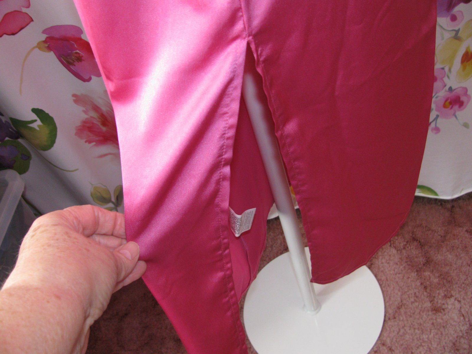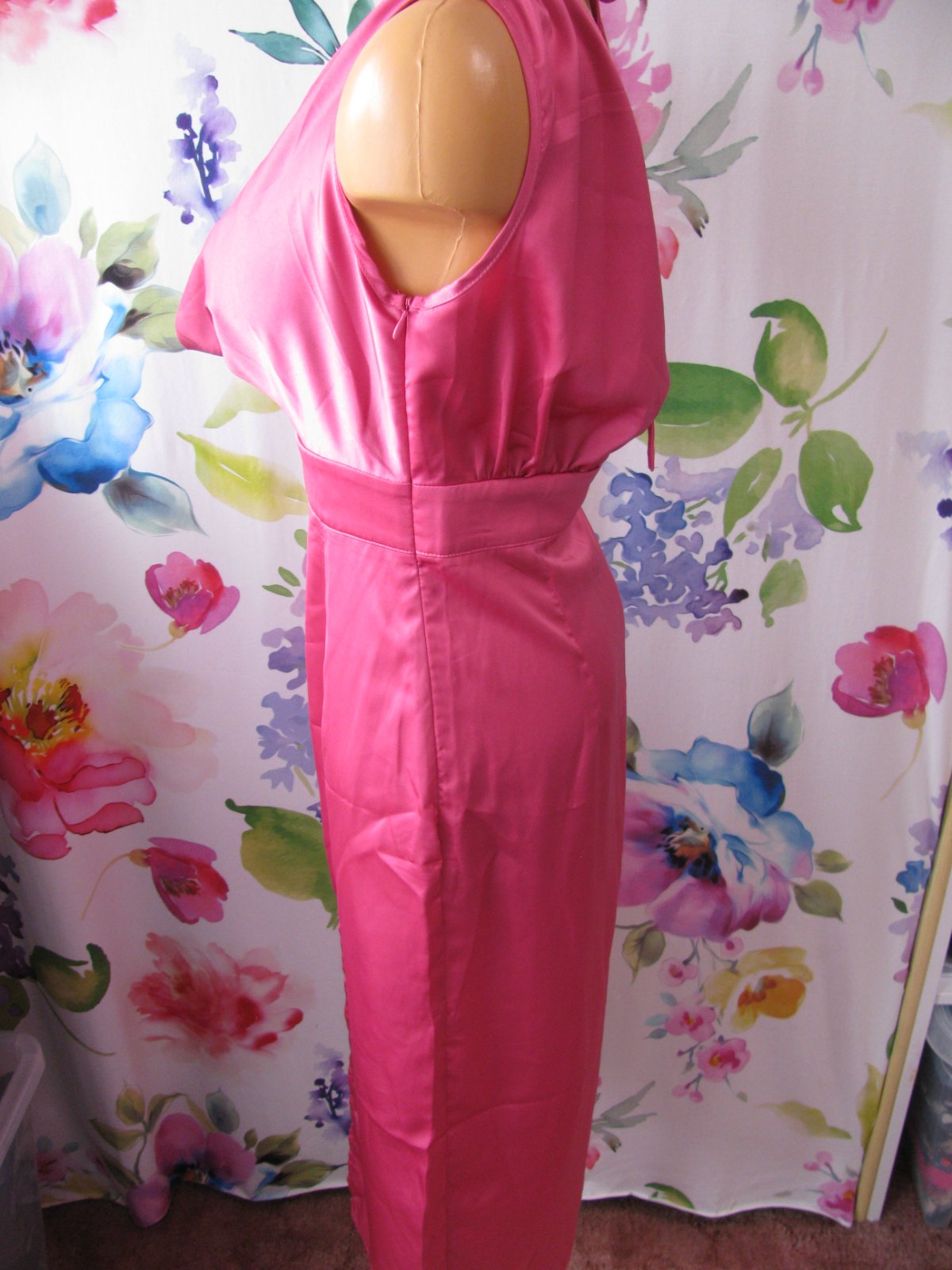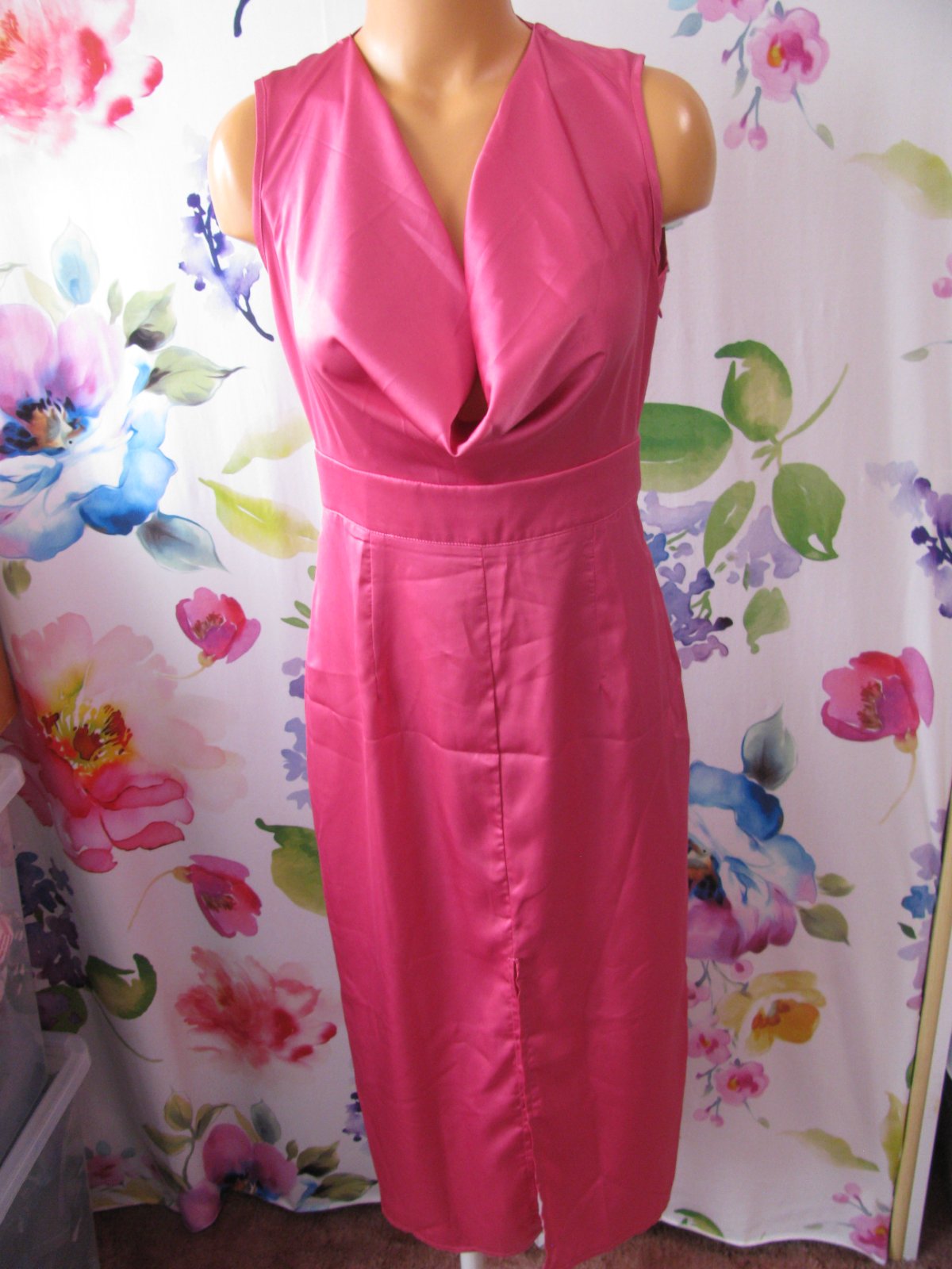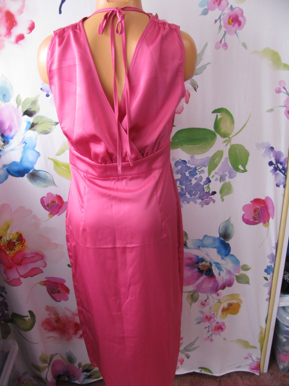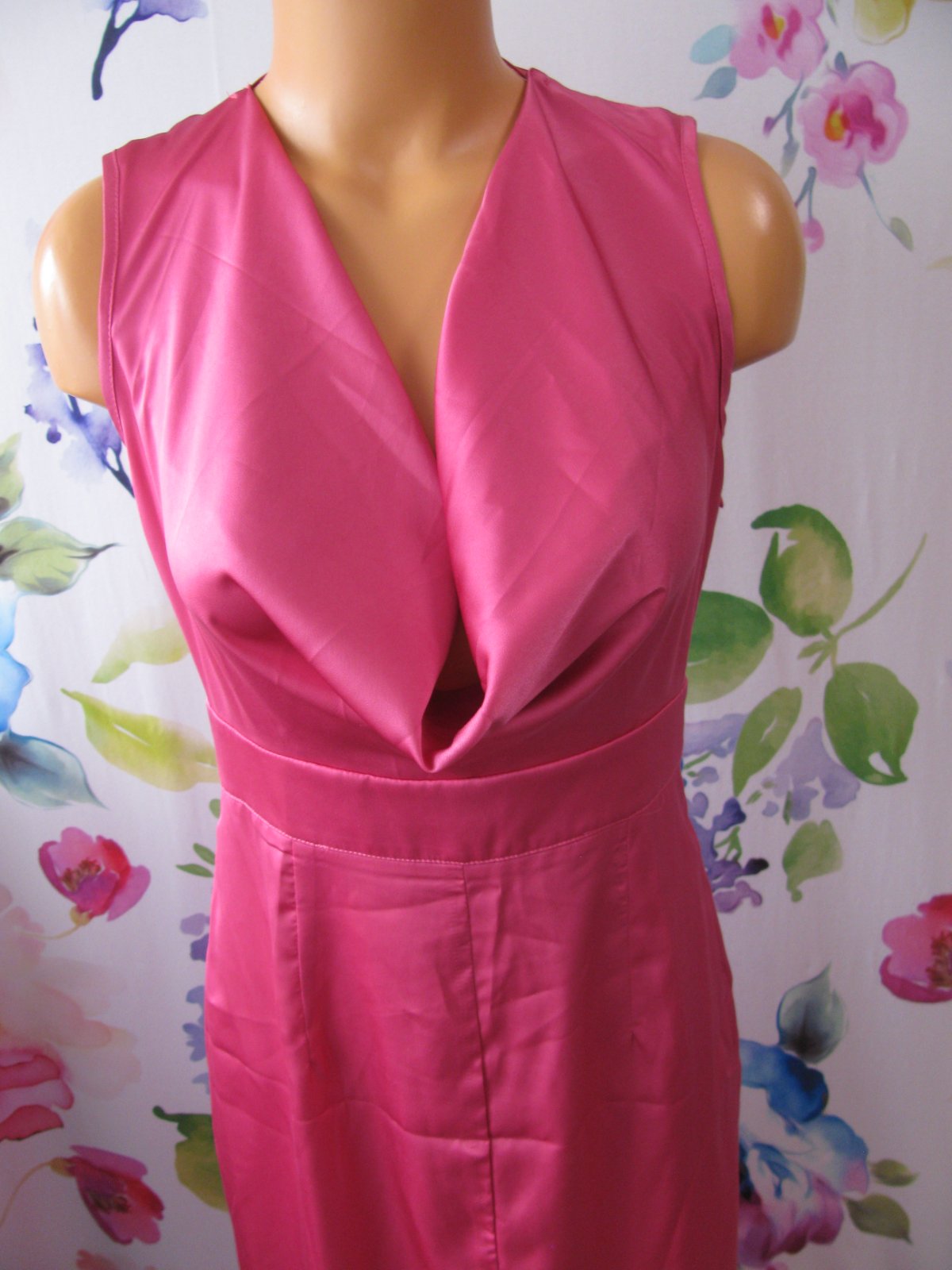 Krásné společenské saténové šaty, s vodou ve výstřihu, za krkem na zavazování, ve předu uprostřed elegantní rozparek, na boku všitý skrytý zip, 95% polyester, 5% elastan. Top stav bez vady, jen jednou nošené.