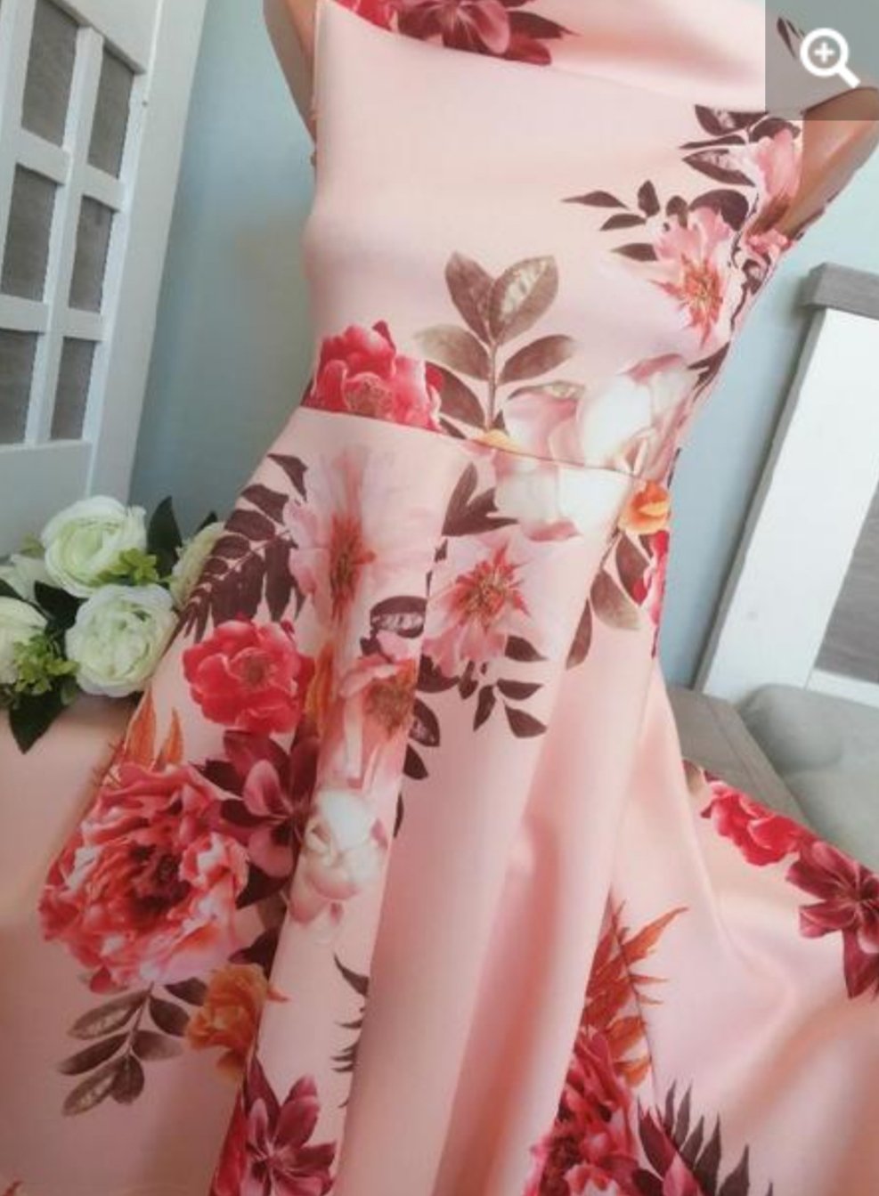 Krásné letní šaty, střih spadlá ramena...Nádherný květinový potisk na meruňkovém podkladu...Materiál připomíná neopren. Kolová bohatá sukně. Šaty jsou pouze odzkoušené. Měla jsem je mít při slavn.příležitosti, ale nakonec jsem použila jiné.....Přední díl je kratší než díl zadní...Míry : délka - přední díl 80 cm a zadní díl 92 cm + počítejte ještě s délkou o spadlá ramena.....pas 2 x 36 cm - 2 x 40 cm, průramky 2 x 41 cm - 2 x 46 cm. Materiál : 95 % polyester a 5 % elastan. Poštovné - balíkovna 85 Kč nebo zásilkovna za 90 Kč